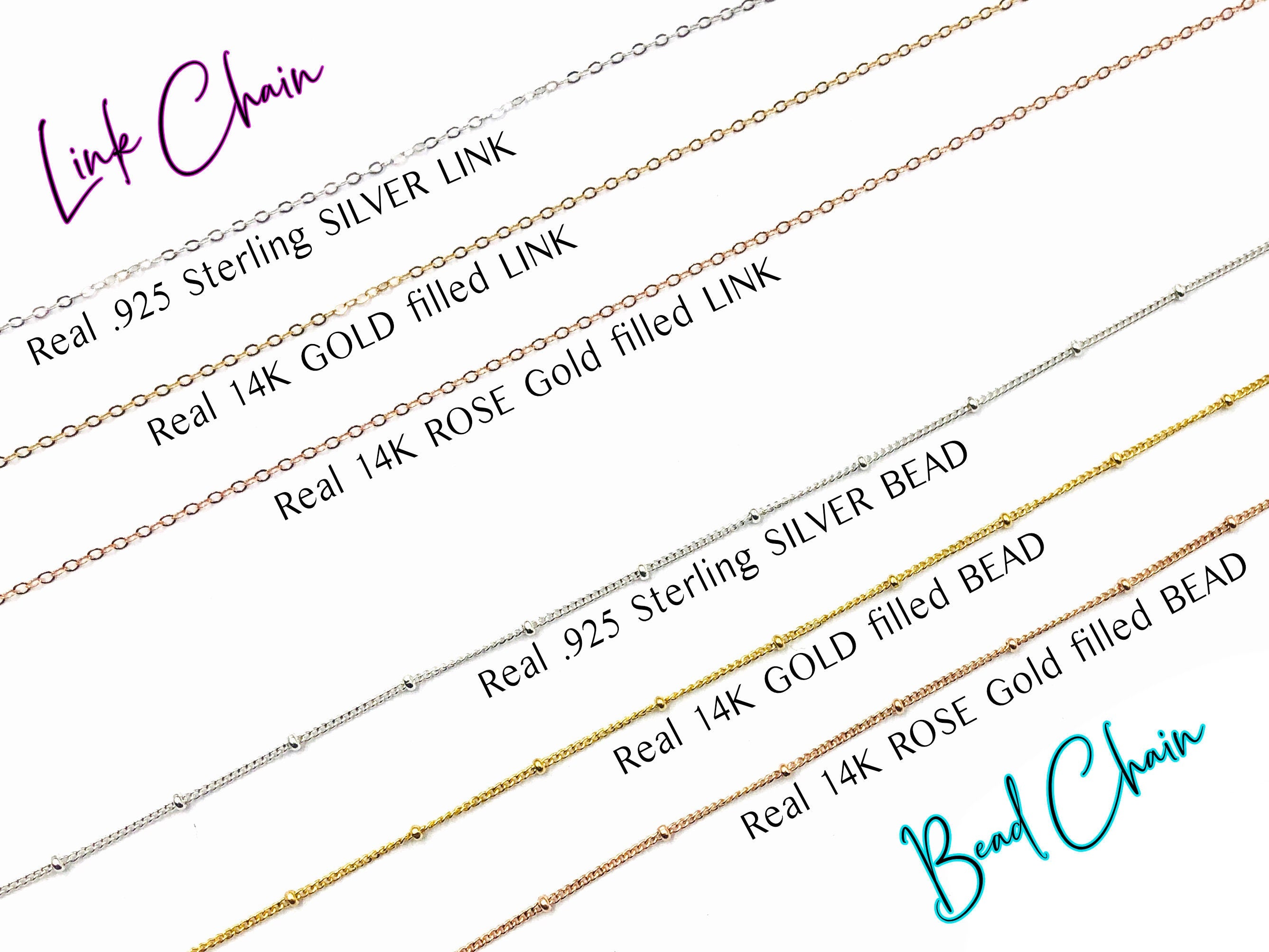 ★ These high quality Sterling Silver & 14K gold filled chains are the perfect dainty necklaces for layering! Great to wear on their own or paired with your favorite pendant from my shop! Your choice of Genuine stamped 14K Gold filled, 14K Rose Gold filled, or .925 Sterling Silver! You can also choose your chain in one of two different styles, a simple LINK cable chain, or a Satellite BEAD chain. Finally, choose your chain length, 16", 18" , 20", 24", or 30". These chains are delicate but very strong and durable. The satellite BEAD chains are 2mm wide and the LINK chains are 1.2mm wide. Both chain styles come with a spring clasp.