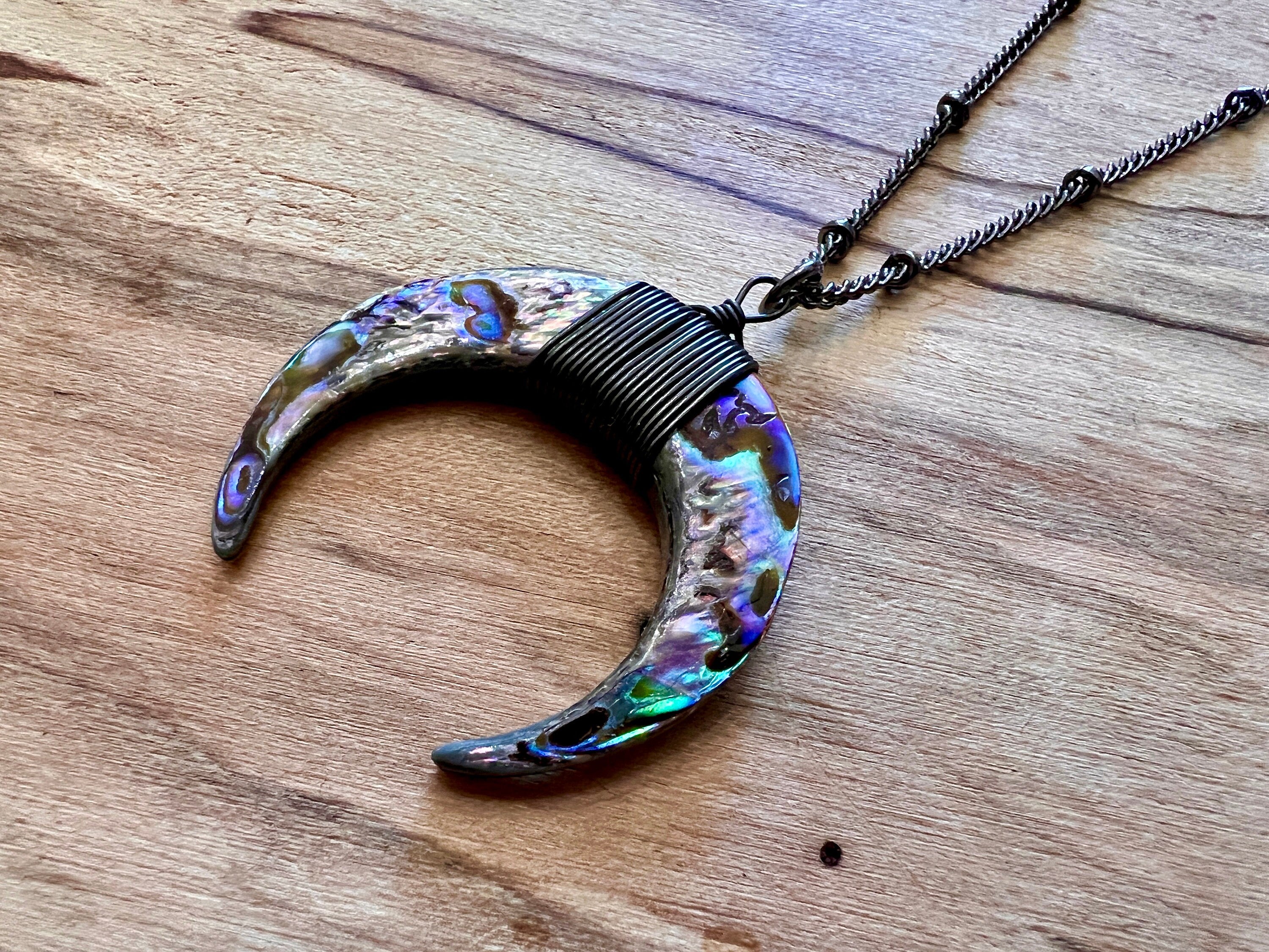 ★ These striking double horn necklaces are made from real rainbow abalone shell and have an amazing natural iridescent sheen! Real abalone "mother of pearl" shell is carved into a crescent moon shape! Each moon is wire wrapped by hand in your choice of gold or gunmetal wire and hung on your choice of an 18", 20", 24" or long 30" chain. You may choose your chain finish: Real 14K Gold filled, Gold plated, Real Sterling silver, Silver plated, or Gunmetal. I do recommend the real 14K Gold filled and Sterling silver chains if you are looking for something hypoallergenic! Finally, you may choose your chain style. Chains are shown in the 3rd photo. Necklace comes in a custom gift pouch with a free die-cut sticker or magnet! Each pendant measures approximately 1.5" x 1.5"