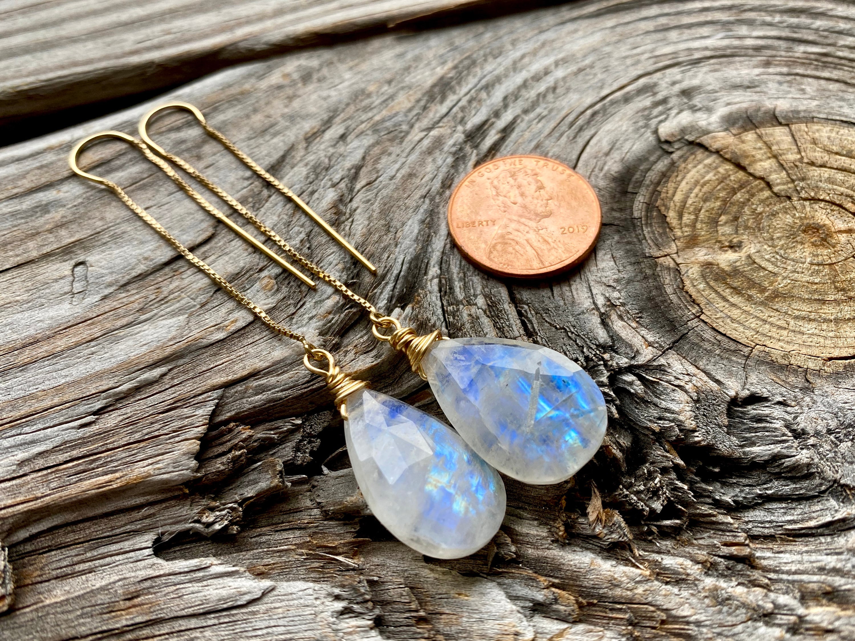 ★ These long crystal threader earrings are wire wrapped by hand with your choice of ametrine, labradorite, moonstone, black spotted moonstone, or fluorite crystals cut into teardrops and attached to pull through threader chain earrings hooks.
