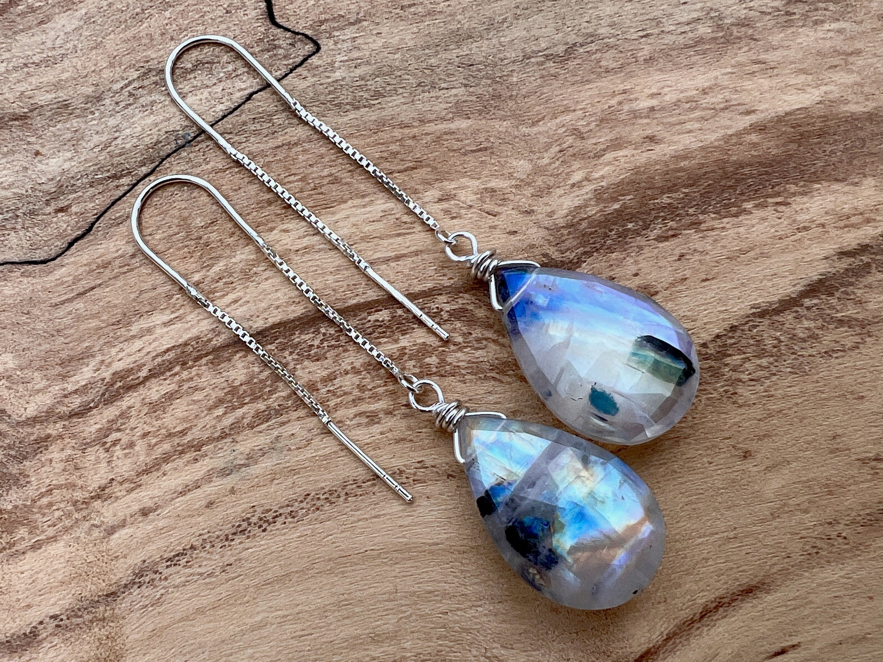 ★ Crystal dangle threader earrings handcrafted with your choice of moonstone, black spotted moonstone, labradorite, fluorite, or ametrine crystals cut into teardrops and wire wrapped onto a pair of pull through threader chain earrings hooks. The treader hooks come in your choice of real Sterling Silver, real 14K Gold filled or real 24K Rose gold vermeil with matching wire wrapping. The earrings are hypoallergenic and tarnish resistant, great for sensitive ears! The threader hooks are surprisingly easy to put on and very comfortable! Each earring measures approximately 2.8" long. The stones themselves measure 15x24mm. Earrings come in a custom gift pouch, ready for gifting or to keep!