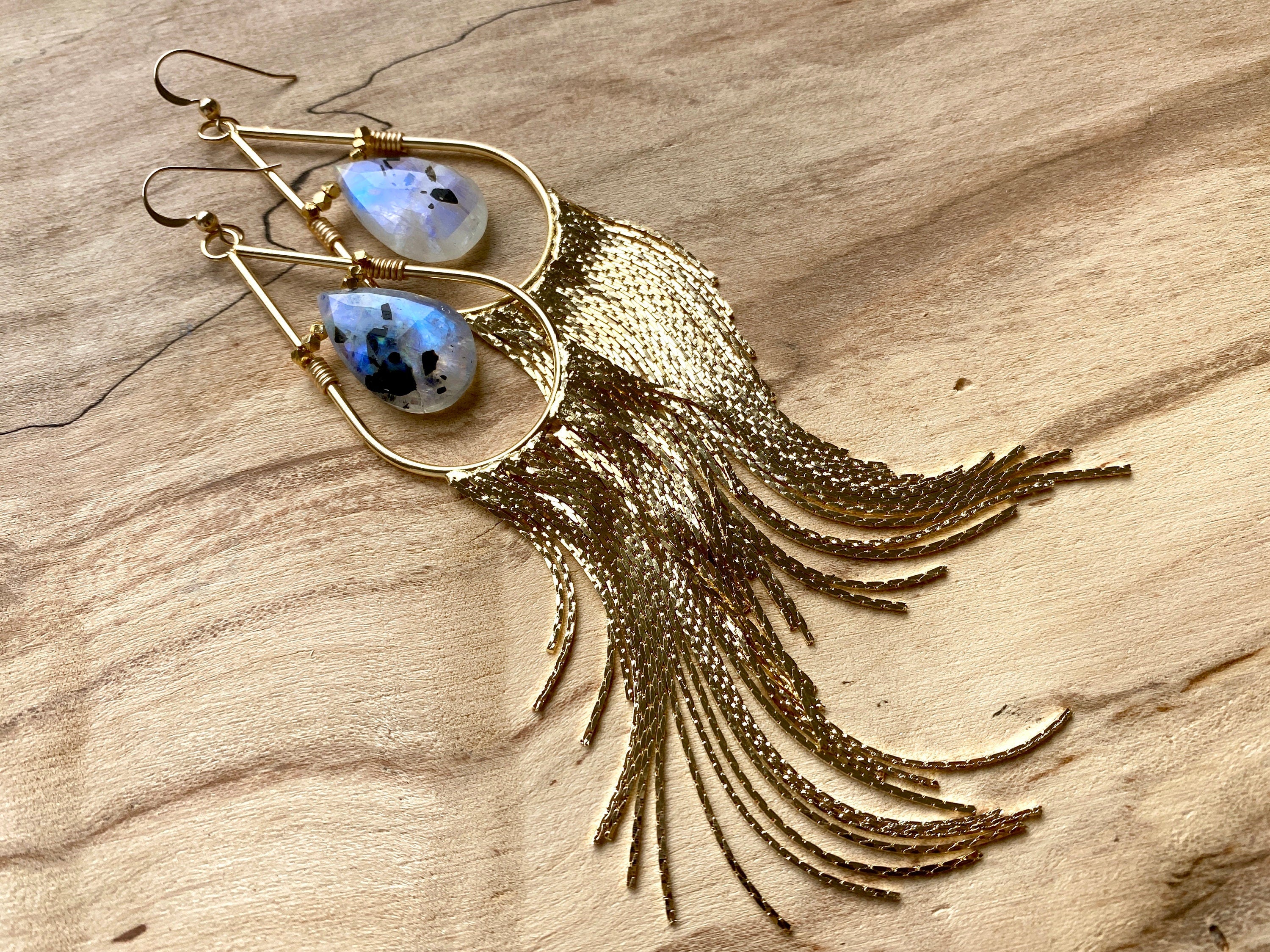 ★ These unique chandelier earrings are handcrafted with your choice of black spotted moonstone, regular moonstone, labradorite, fluorite, or ametrine crystals cut into teardrops and wire wrapped onto a pair of teardrop shaped hoops in your choice of silver or gold plating with hill tribe spacer beads and finished with extra long chain fringe! The earrings are hung from either real sterling silver or real 14k gold filled French hooks depending on whether you choose the earrings in silver or gold. Earring hooks are hypoallergenic and great for sensitive ears! Each earring measures approximately 1" x 6" and come in a custom gift pouch, ready for gifting or to keep!