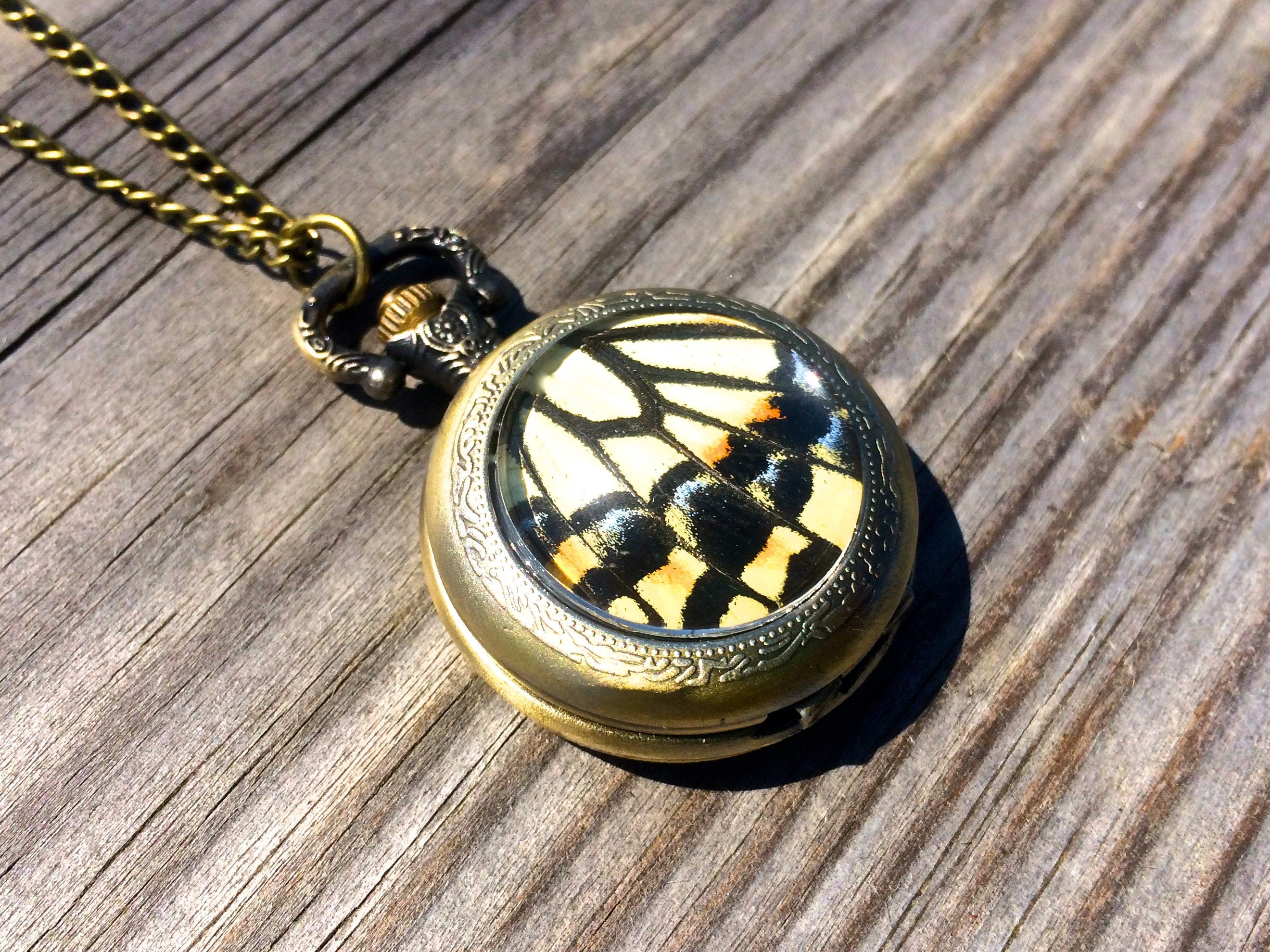 ★ These amazing pocketwatch statement necklaces are made with REAL butterfly wings embedded under magnified glass! (See below for more on how I ethically obtain the wings!) They are working functional pocket watches that flip open to expose the clock inside! The pocket watch comes in your choice of Antique gold, silver, or gunmetal and measures 1.5 inches x 2 inches and is hung on a long 30 inchchain (chain is shortened on model for photo purposes but will actually hang longer). Comes with watch battery already installed. Each piece comes with its own gift pouch with literature on the species of butterfly and a free die-cut sticker or magnet! Choose your butterfly wing species below!: