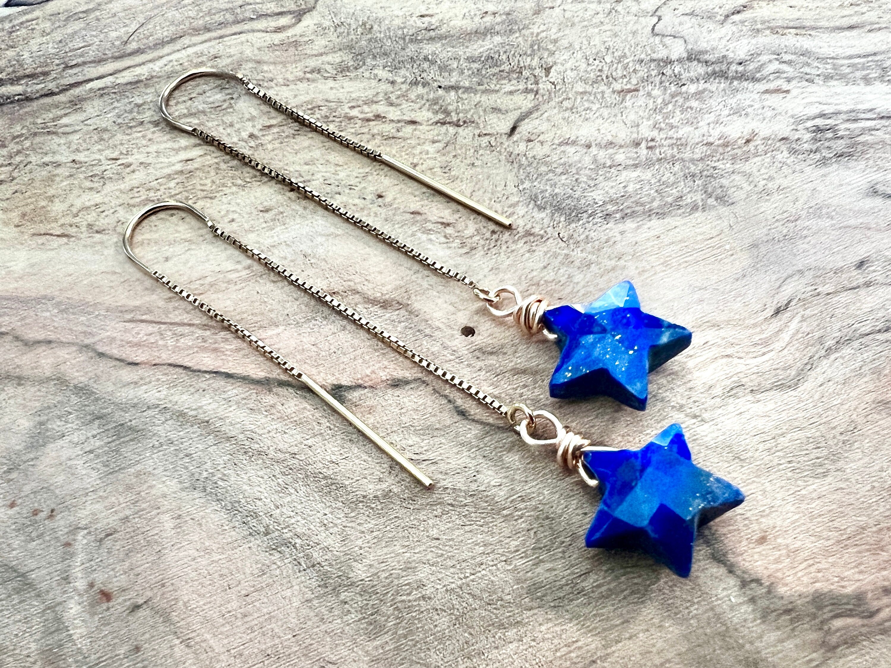 ★ Real raw gemstones hand-cut into star shapes! Each dainty faceted star gemstone is wire wrapped by hand (in your choice of moonstone, black spotted moonstone, labradorite, citrine, lapis lazuli, bumblebee jasper, rutilated quartz, garnet, smoky quartz, amazonite, amethyst, blue lace agate, or emerald) onto long threader chain earring hooks. he threader hooks come in your choice of real Sterling Silver, real 14K Gold filled or real 24K Rose gold vermeil with matching wire wrapping. The earrings are hypoallergenic and tarnish resistant, great for sensitive ears! The threader hooks are surprisingly easy to put on and very comfortable! Each earring measures approximately 2.2" long. The stones themselves measure 13mm across. Earrings come in a custom gift pouch, ready for gifting or to keep!