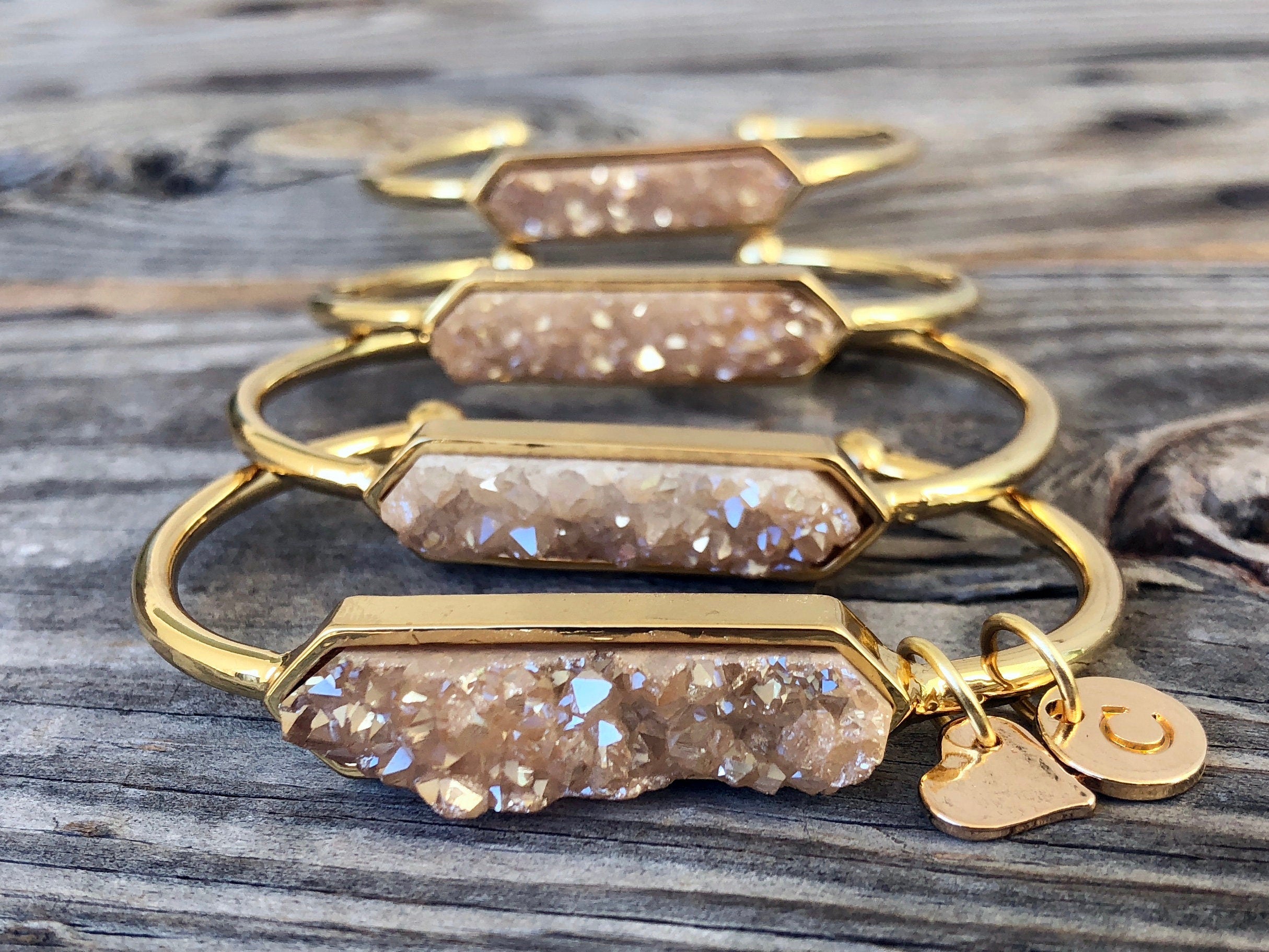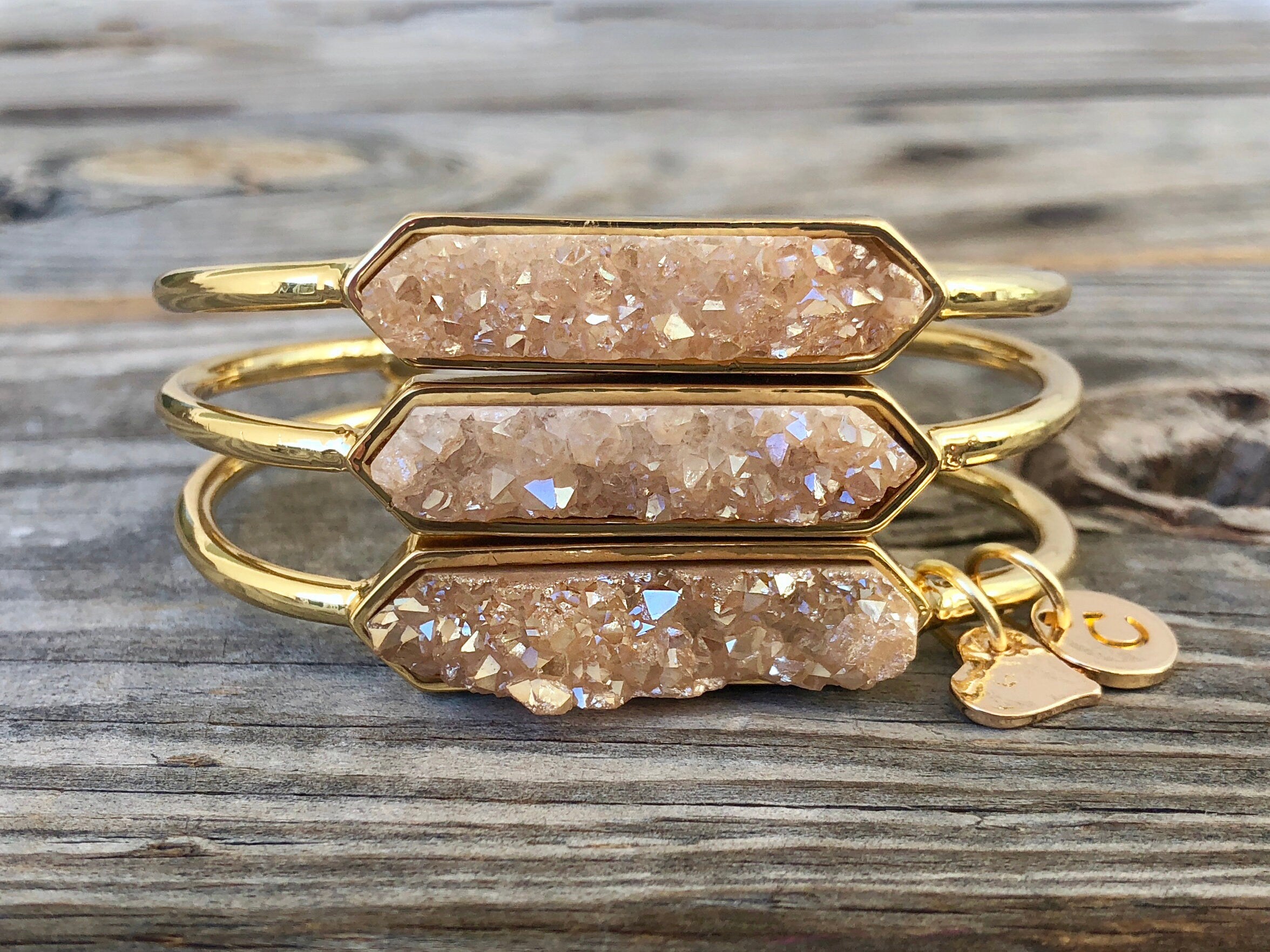 ★ AS SEEN ON "THIS IS US"! These dazzling raw druzy bracelets with initial charms make awesome personalized gifts for you and your best friends! High quality Champagne colored druzy crystal with an iridescent "angel aura" finish is cut into an elongated hexagon shape and set into a gold plated bangle. I then add a heart shaped charm to each bracelet in matching metal color. Bracelets can also be customized to add initials / letter charms as well. Select your letter from the drop down menu or if you would like multiple initials on the same bracelet, select the option for 2 initials or 3 initials and then write the initials you would like in the "notes to seller" at checkout :) Your bracelet will come in a custom gift pouch with a free die-cut sticker or magnet!