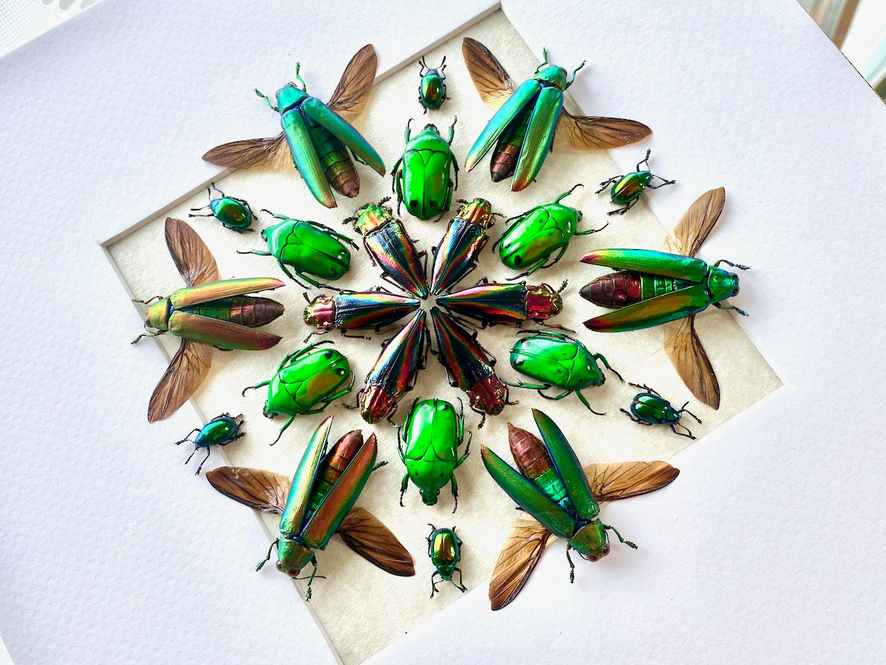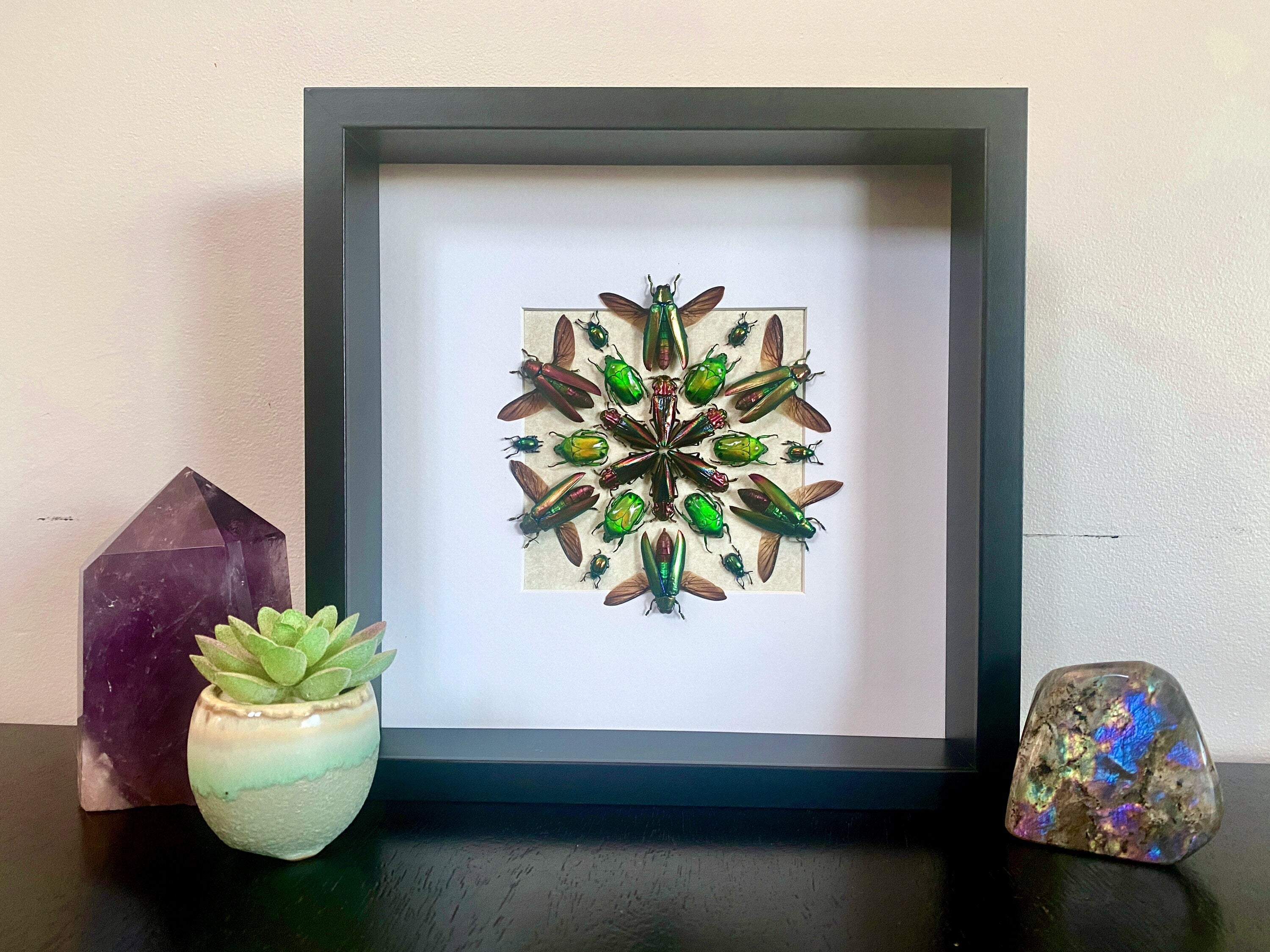 I have created this amazing real insect taxidermy display using REAL preserved exotic insects inside a wooden shadowbox! The insects include 24 assorted green and rainbow jewel beetles. I have arranged the insects in a circular kaleidoscope formation. The insects are secured under glass in a shadowbox measuring approximately 1 ft x 1ft. The artwork is mounted on a textured cream background with a white mat border. You may choose a black or white frame. You may also choose between regular glass or an upgrade to museum grade UV glass.