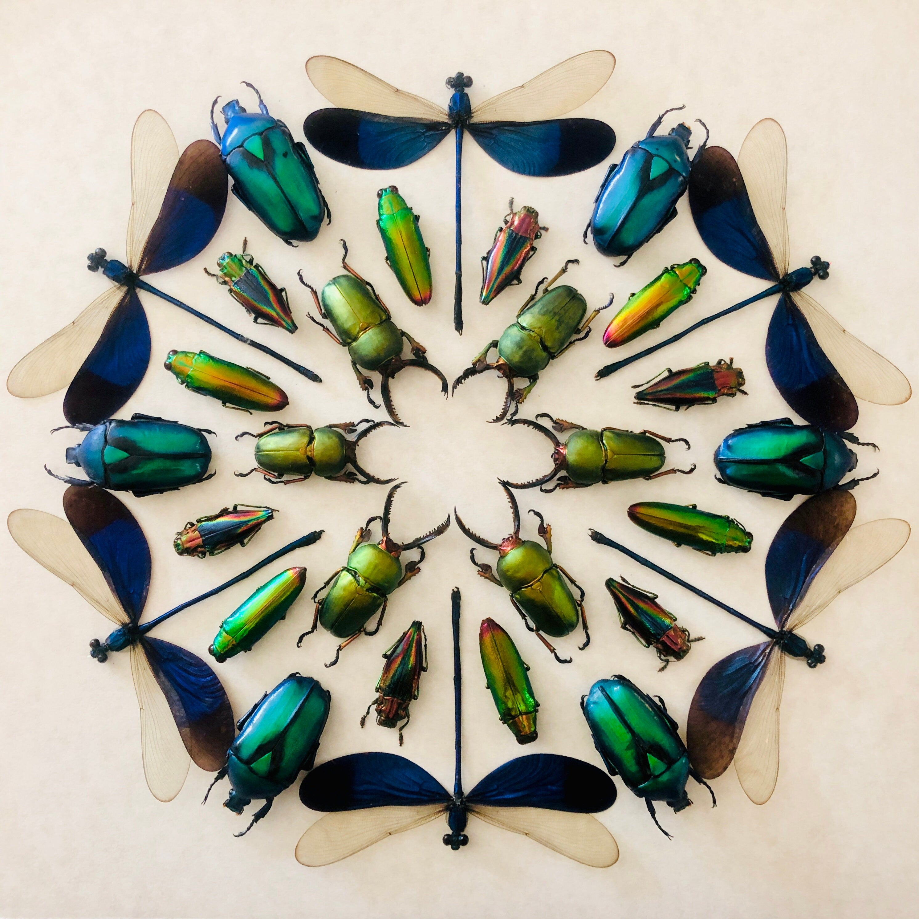 I have created this amazing real insect taxidermy display using 30 REAL preserved exotic insects inside a wooden shadowbox! The insects include 6 blue damselflies from Indonesia, 6 stag beetles from Australia, 6 green jewel beetles from Thailand, 6 rainbow jewel beetles from Thailand, and 6 flower scarab beetles from Africa. I have arranged the insects in a circular kaleidoscope formation. The insects are secured under glass in a shadowbox measuring approximately 1 ft x 1ft. The artwork is mounted on a textured cream background with a white mat border. You may choose a black or white frame. You may also choose between regular glass or an upgrade to museum grade UV glass.