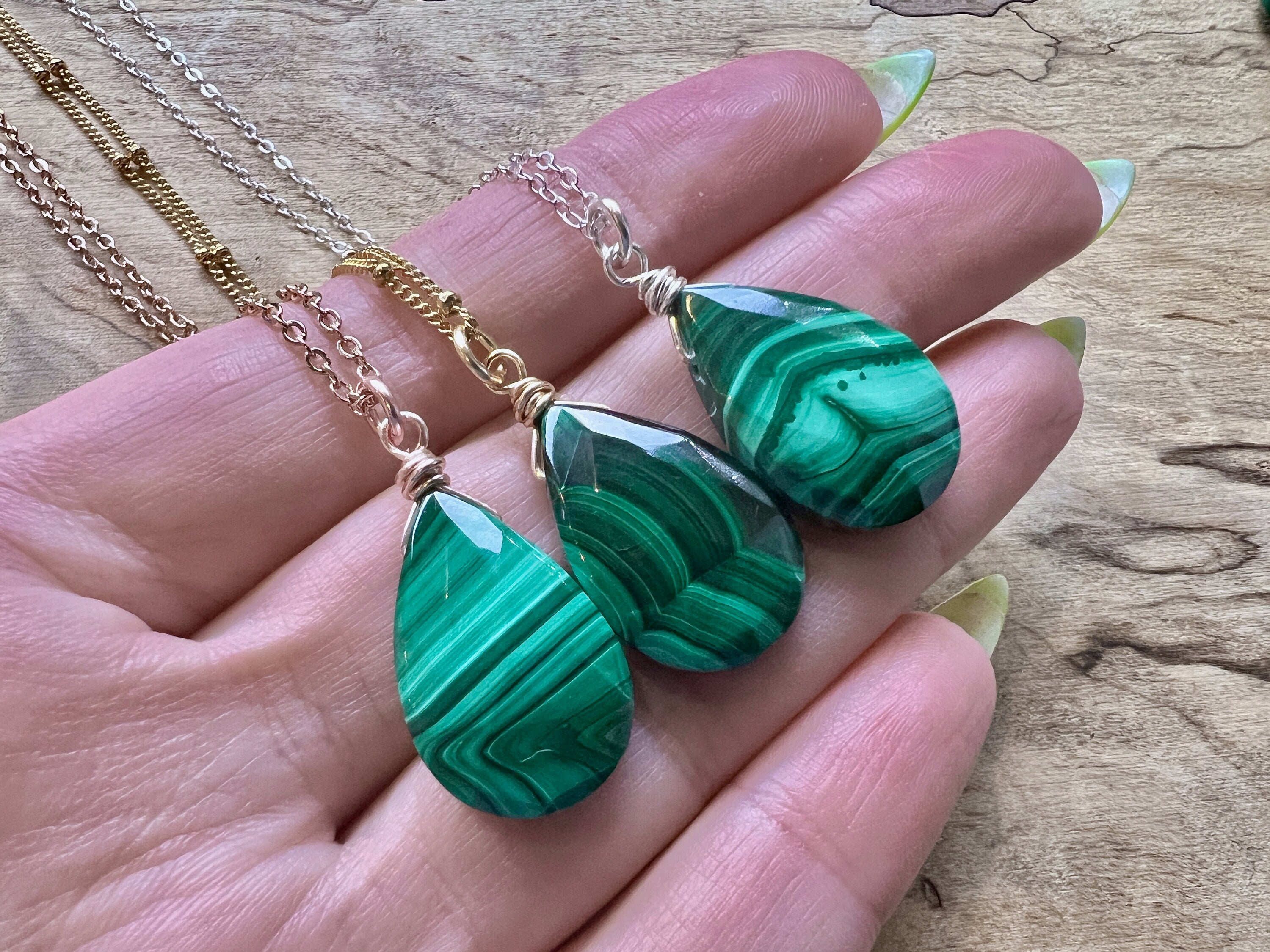 Genuine Malachite mineral in waves of emerald green cut into a faceted teardrop shape and wire wrapped by hand! Chains are available in your choice of length: 18", 20", or 24". You may also choose your chain finish: Real .925 Sterling Silver or Silver plated, Real 14K Gold filled or Gold plated, or Real 14K Rose gold filled or Rose gold plated. I highly recommend the real 14K Gold filled and the real Sterling Silver chains are they are tarnish resistant & hypoallergenic! Finally, you may choose your chain style. All chains are shown in the 3rd photo. Each pendant measures approximately 14mm wide x 22mm long and comes in a custom gift pouch, ready to gift or keep!