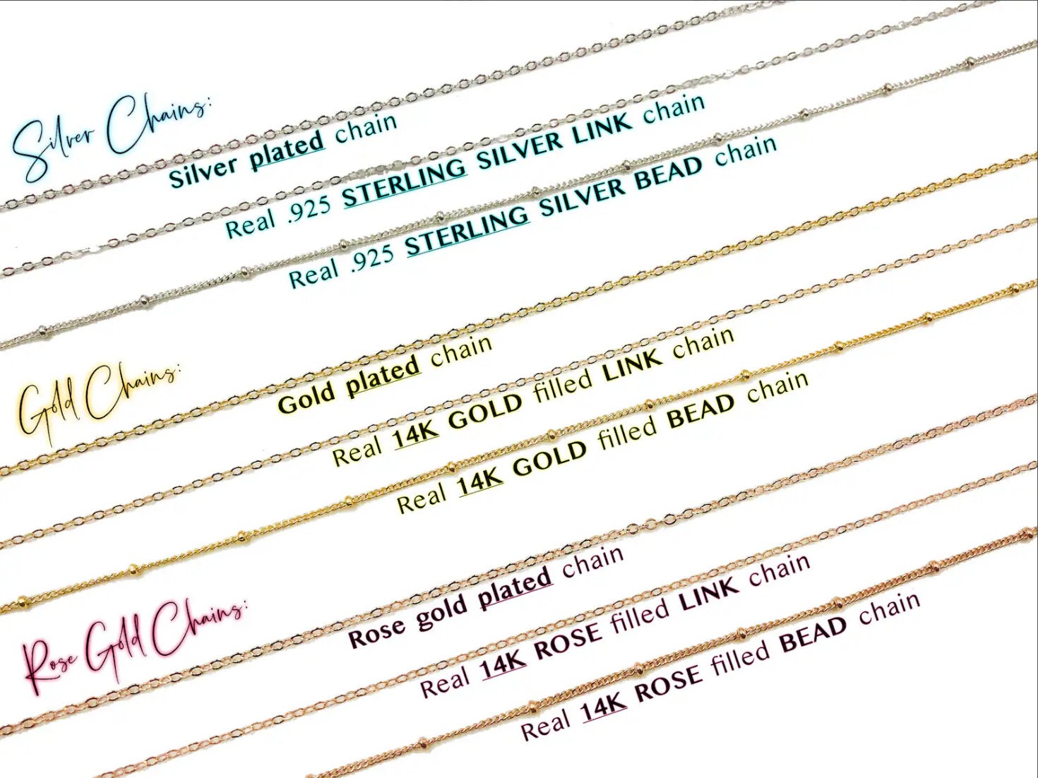 See 4th photo for chain options: 3 chain styles offered in Real .925 Sterling Silver or Silver plated, Real 14K Gold filled or Gold plated, or Real 14K Rose gold filled or Rose gold plated. I highly recommend the real 14K Gold filled and the real Sterling Silver chains are they are tarnish resistant & hypoallergenic! We also offer gunmetal as shown in the first photo!