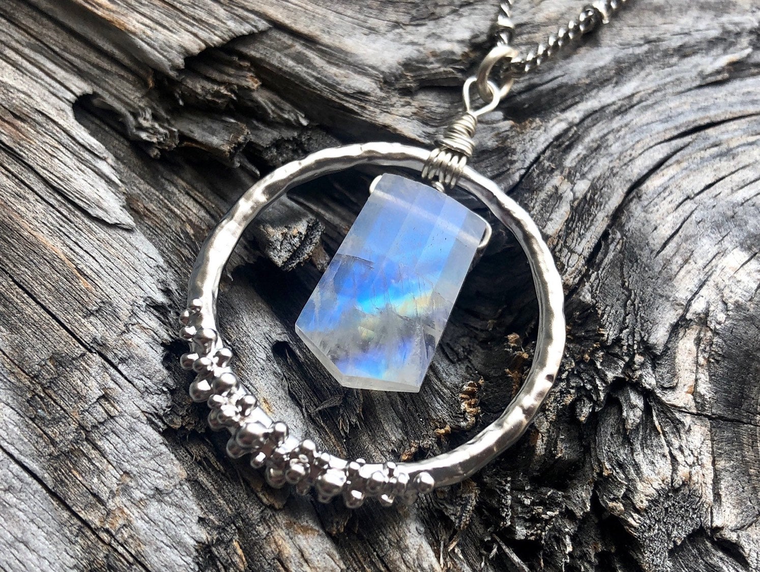I handcraft these eye catching raw crystal necklaces by wire wrapping a faceted real crystal point (in your choice of ametrine, moonstone, labradorite, fluorite, or blue lace agate) onto a large round infinity ring with decorative dew drops. The pendant is made in your choice of gold, rose gold, or silver plated. Chains are available in your choice of length: 18" for a standard necklace length, 24" for medium length, or 30" for long length (Model is wearing 18"). You may also choose your chain finish: Real .925 Sterling Silver or Silver plated, Real 14K Gold filled or Gold plated, or Real 14K Rose gold filled or Rose gold plated. I highly recommend the real 14K Gold filled and the real Sterling Silver chains are they are tarnish resistant & hypoallergenic! Finally, you may choose your chain style. All chains are shown in the 6th photo. Each pendant measures approximately 1.25" wide x 1.5" long and comes in a custom gift pouch, ready to gift or keep!