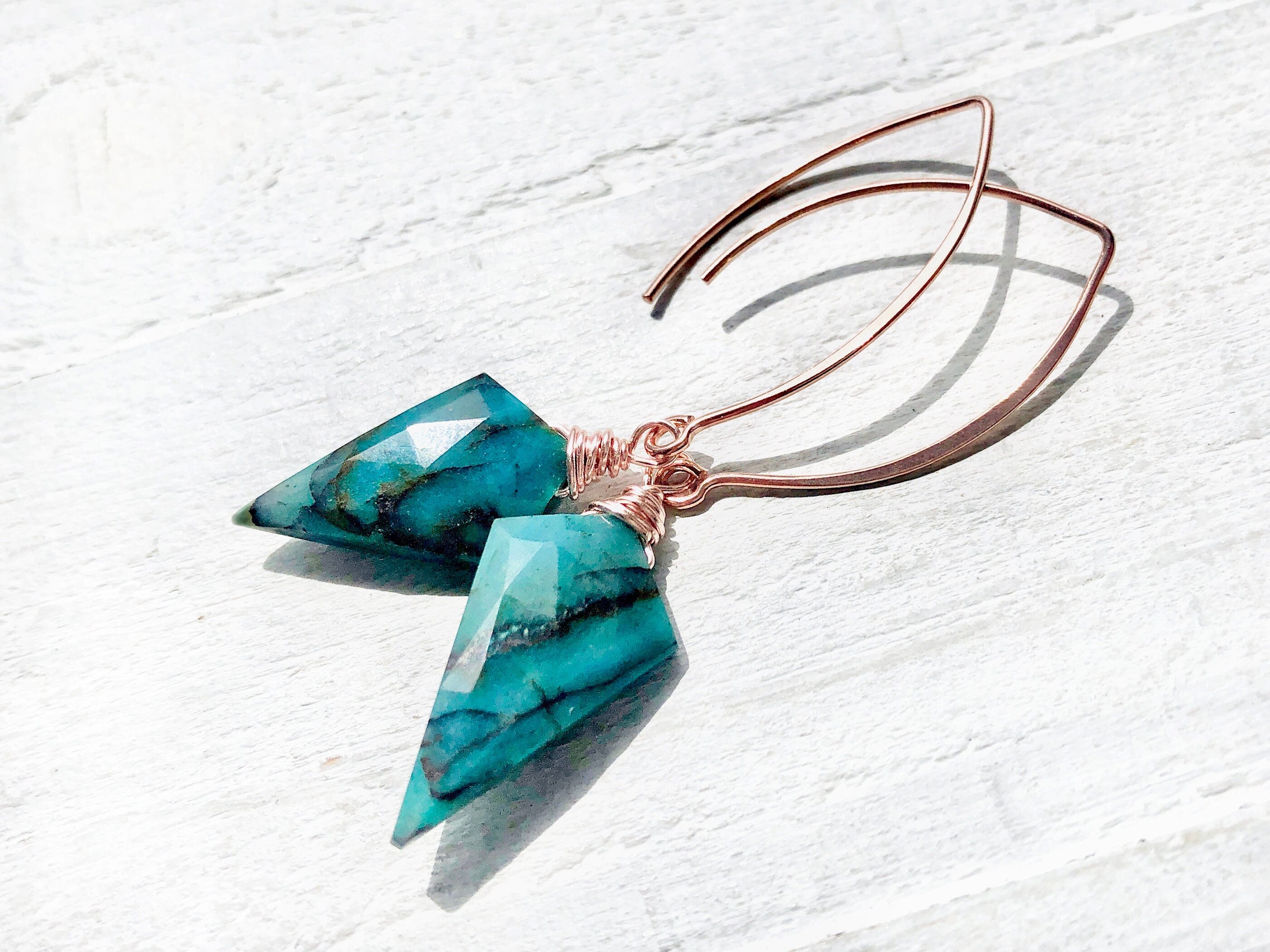 ★ I wire wrap these real gemstone point earrings by hand from raw crystals which have been cut into a faceted spike shape (in your choice of Chrysocolla, moonstone, labradorite, ametrine, or fluorite) onto threader style earrings hooks. The hooks are available in real sterling silver, real 14k gold vermeil, or real 14k rose gold vermeil. Earring hooks are hypoallergenic and great for sensitive ears! Each earring measures approximately .5" wide x 2" long. They come in a custom gift pouch, ready to gift or keep!