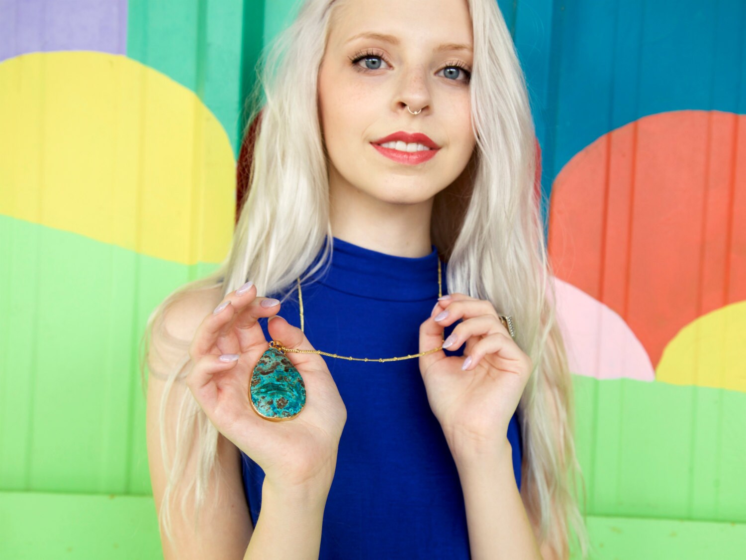 ★ Polished & faceted blue ocean jasper with gold plating! These large freeform oval shaped ocean jasper gemstones measure approximately 55mm to 60mm long. The crystals are then hung on your choice of a short 18" long chain, a medium 24" chain or long 30" chain (model is wearing 30" chain). You may also choose your chain finish: Real 14K Gold filled or Gold plated. I highly recommend the real 14K Gold filled chains are they are tarnish resistant & hypoallergenic! Finally, you may choose your chain style, bead, link, or cable. All chains are shown in the 5th photo. Necklace comes in a custom gift pouch with a free die-cut sticker or magnet!