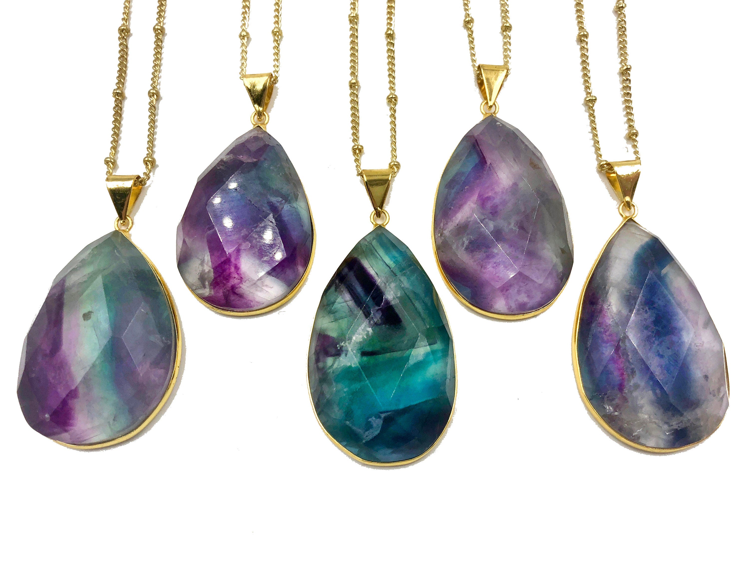 ★ Gorgeous rainbow fluorite crystal cut into chunky faceted teardrop pendants! Each pendant measures approximately 30mm - 35mm long and comes on your choice of a short 18", medium 24", or a long 30" chain, in your choice of a real 14K Gold filled LINK chain, Real 14K Gold filled Satellite BEAD chain, or plated gold chain. I highly recommend one of the real 14K Gold filled chains as they are tarnish resistant & hypoallergenic!