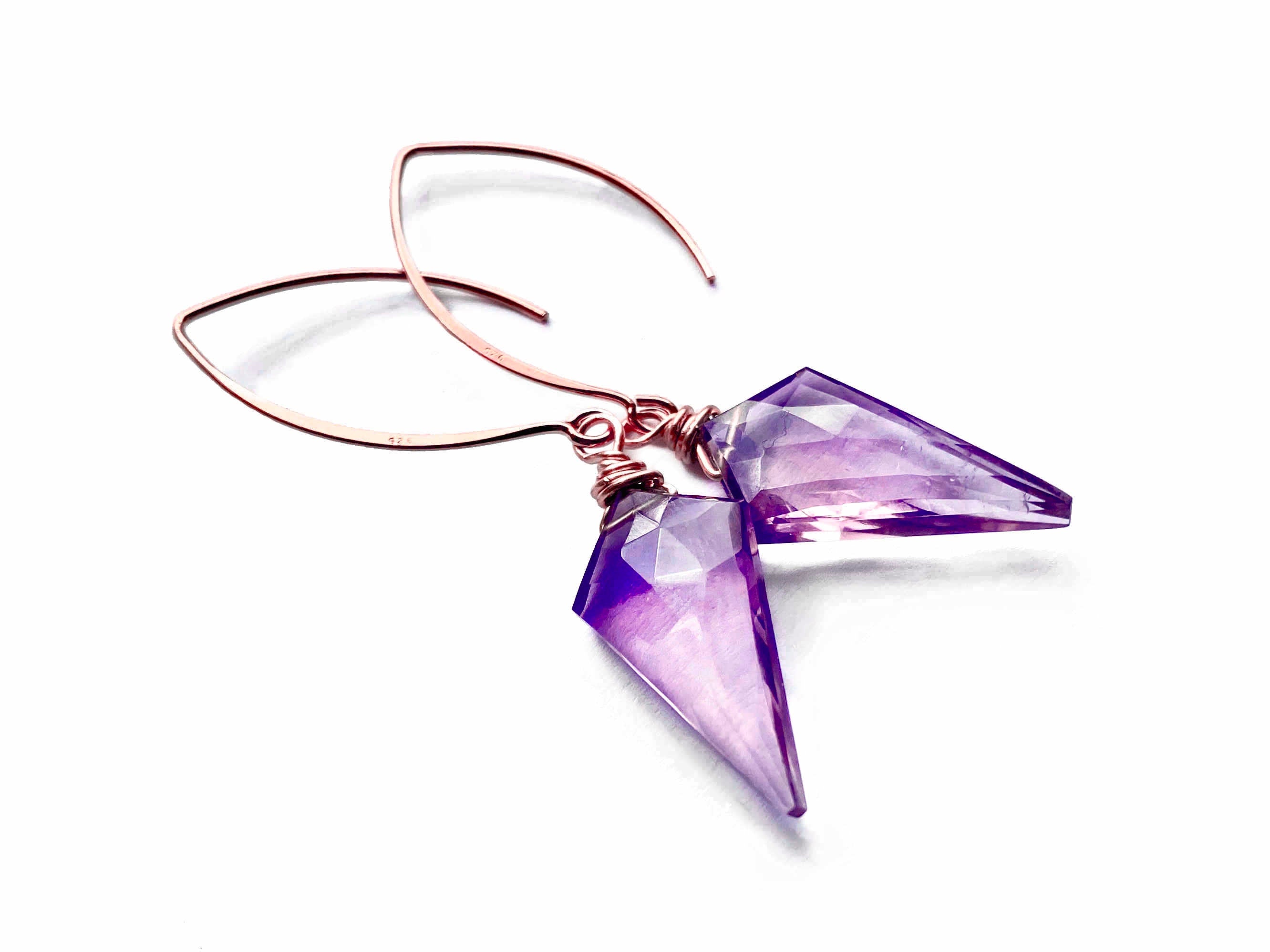 ★ Real crystal point earrings wire wrapped by hand using raw gemstones which have been cut into a faceted spike shape (in your choice of Rose quartz, Black spotted Moonstone, Amethyst, Citrine, Emerald, or Lapis Lazuli) onto threader style earrings hooks. The hooks are available in real sterling silver, real 14k gold vermeil, or real 14k rose gold vermeil. Earring hooks are hypoallergenic and great for sensitive ears! Each earring measures approximately .5" wide x 2" long. They come in a custom gift pouch, ready to gift or keep!