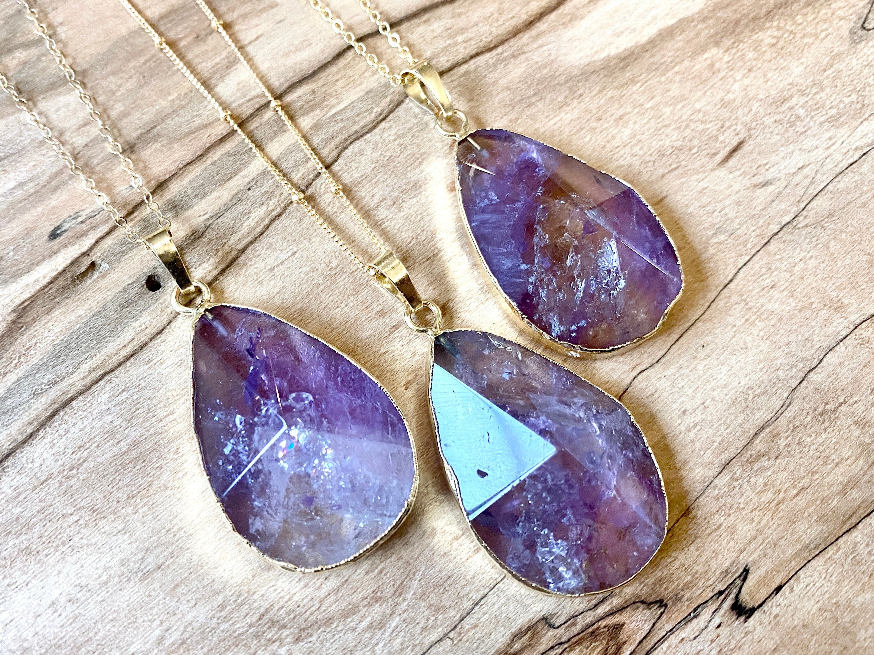 Gorgeous amethyst crystal teardrop edged in your choice of gold, rose gold, or silver plating! These large stones measure approximately 40 x 25mm. Chains are available in your choice of length: 18" for a standard necklace length, 24" for medium length, or 30" for long length (Model is wearing 18" in rose quartz). You may also choose your chain finish: Real 14K Gold filled or Gold plated, Real 14K Rose Gold filled or rose gold plated, OR Real Sterling Silver or silver plated. I recommend the real 14K filled and Sterling silver chains as they are tarnish resistant & hypoallergenic! Finally, you may choose your chain style. All chains are shown in the 3rd photo. Necklace comes in a custom gift pouch with a free die-cut sticker or magnet!