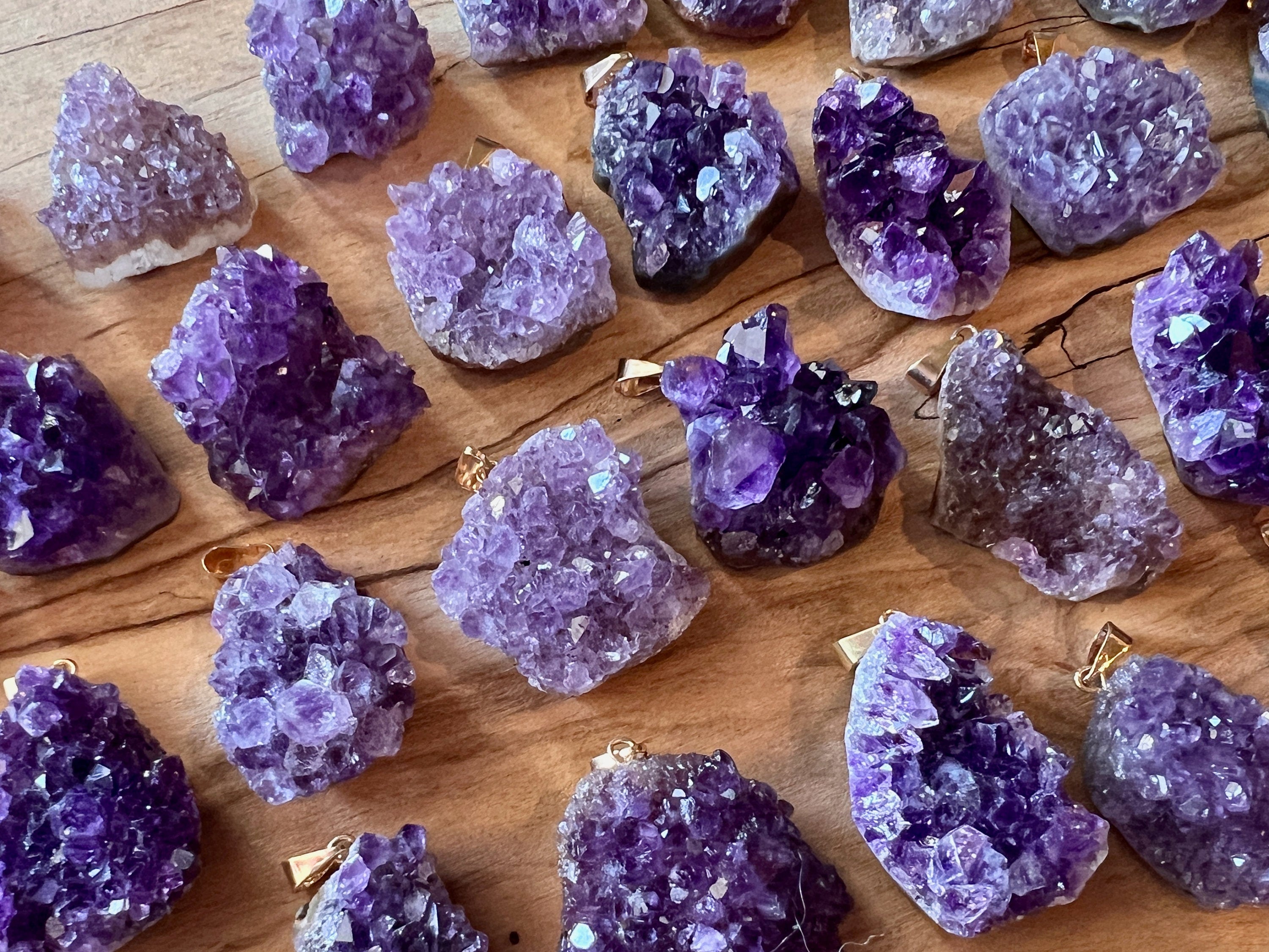 Amethyst is a violet purple variety of quartz. The name comes from the ancient Greek work for "intoxicated", a reference to the belief that the stone protected its owner from drunkenness. The ancient Greeks wore amethyst and decorated goblets with it in the belief that it would prevent intoxication. For many centuries, amethyst has been used as a healing & protection stone, thought to guard against negative thoughts, transferring the energy into love and protecting the wearer from harm and stress. Amethyst is a semiprecious stone and is the traditional birthstone for February.
