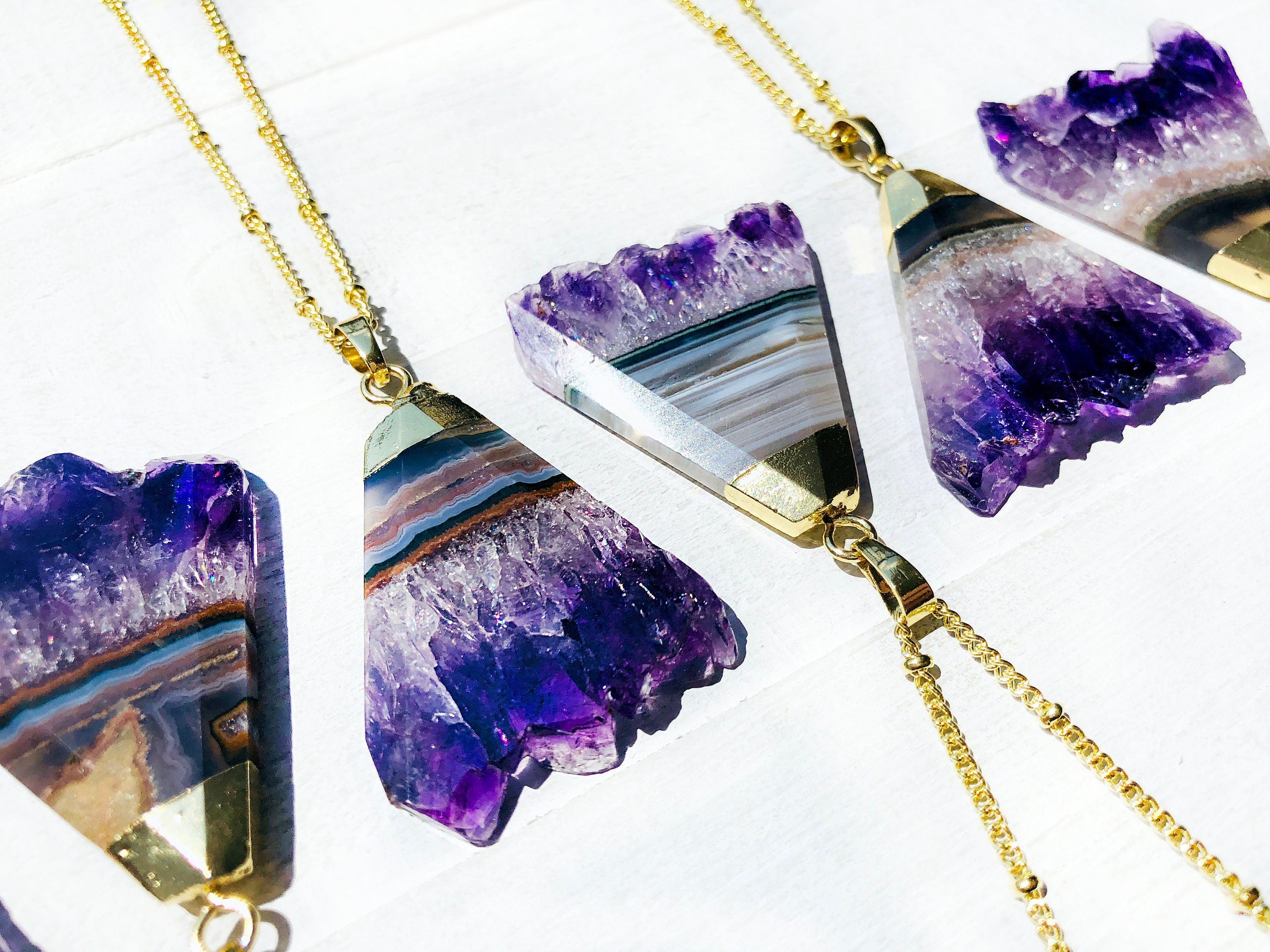 Gorgeous raw amethyst necklace cut into a faceted triangular shape and edged in gold plating! These large crystal slices measure approximately 30mm x 40mm. Chains are available in your choice of length: 18" for a standard necklace length, 24" for medium length, or 30" for long length (Model is wearing 30"). You may also choose your chain finish: Real .925 Sterling Silver, Silver plated, Real 14K Gold filled or Gold plated. I highly recommend the real 14K Gold filled and the real Sterling Silver chains as they are tarnish resistant & hypoallergenic! Finally, you may choose your chain style. All chains are shown in the 5th photo. Necklace comes in a custom gift pouch with a free die-cut sticker or magnet!