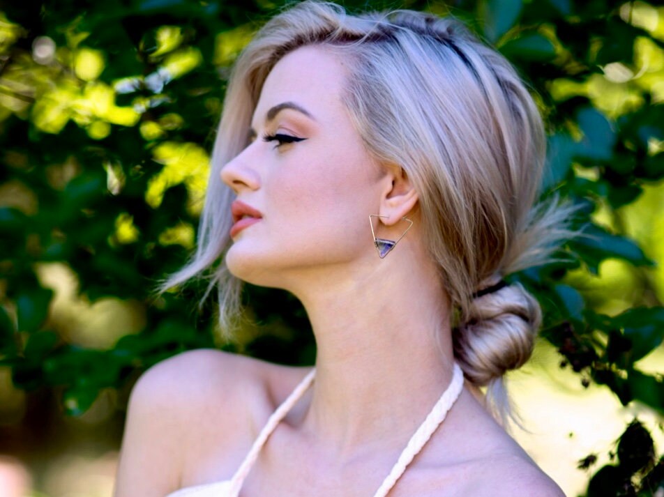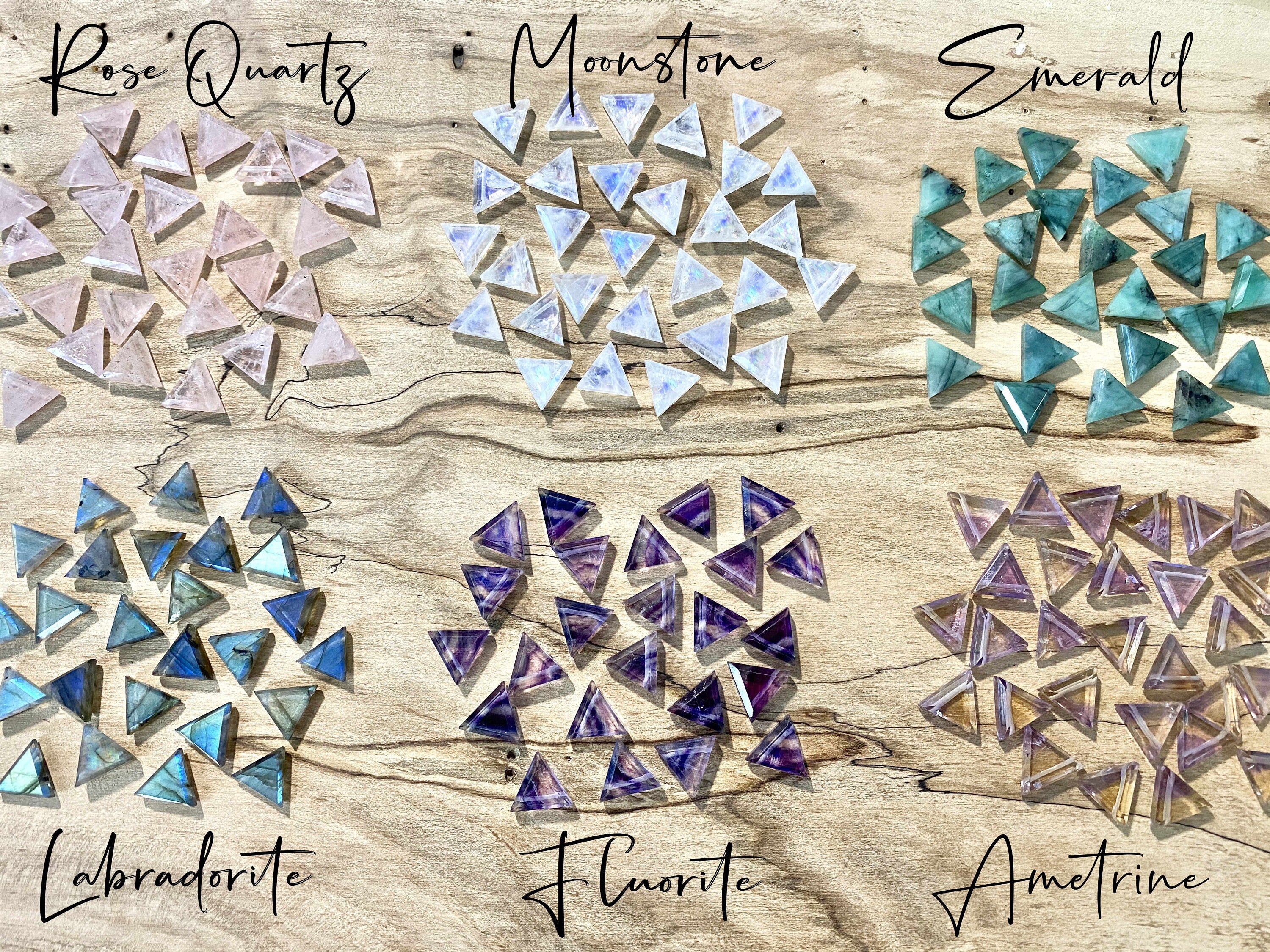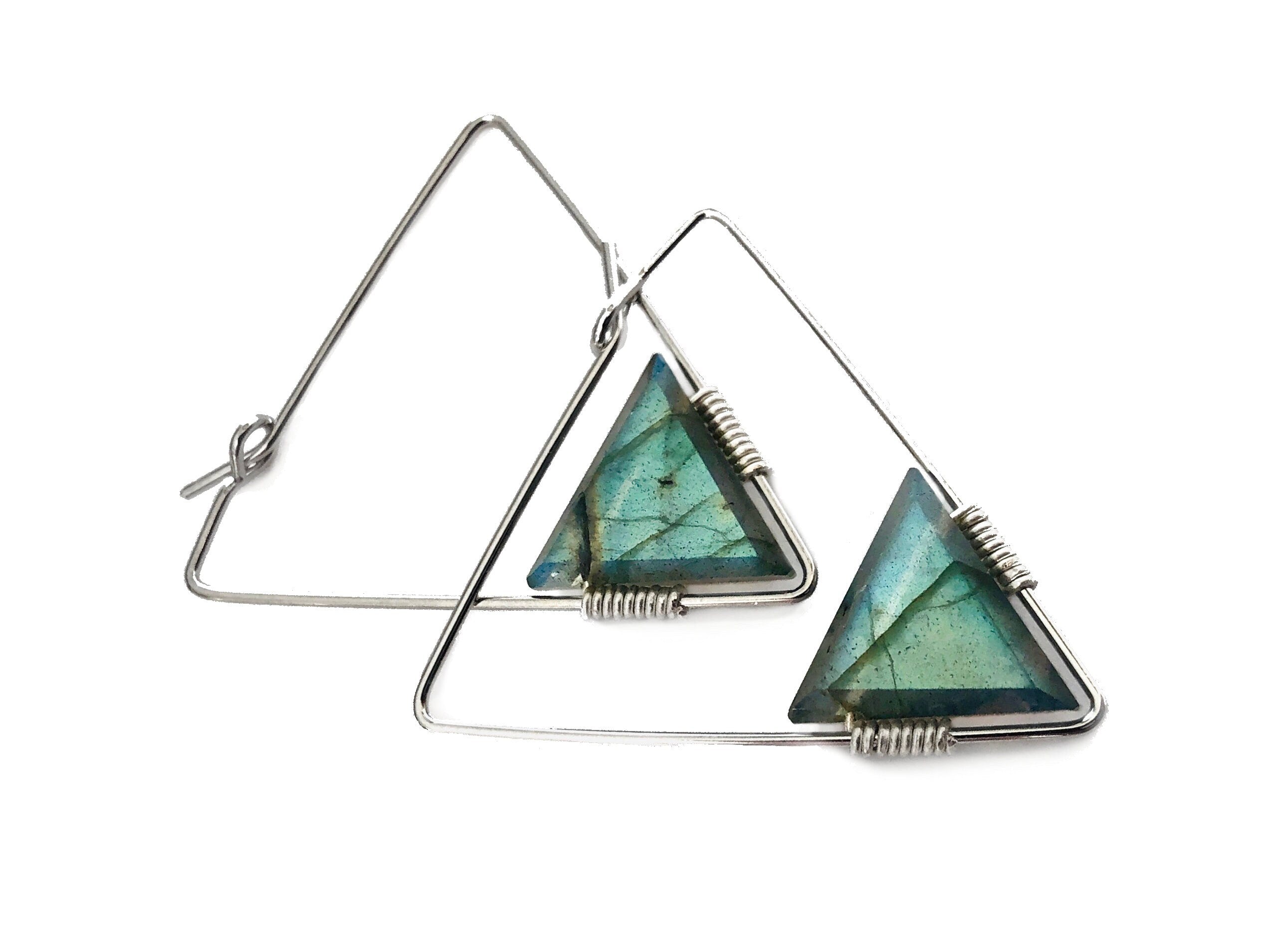 ★ I handcraft these lightweight statement earrings by wire wrapping your choice of ametrine, moonstone, labradorite, fluorite, emerald, or rose quartz crystals cut into faceted triangles onto a pair of triangle wire hoops! Hoops available in your choice of Gold plated or Silver Rhodium plated. Each earring measures approximately 30mm / 1.2 inches long. Earrings come in a custom gift pouch, ready for gifting or to keep!