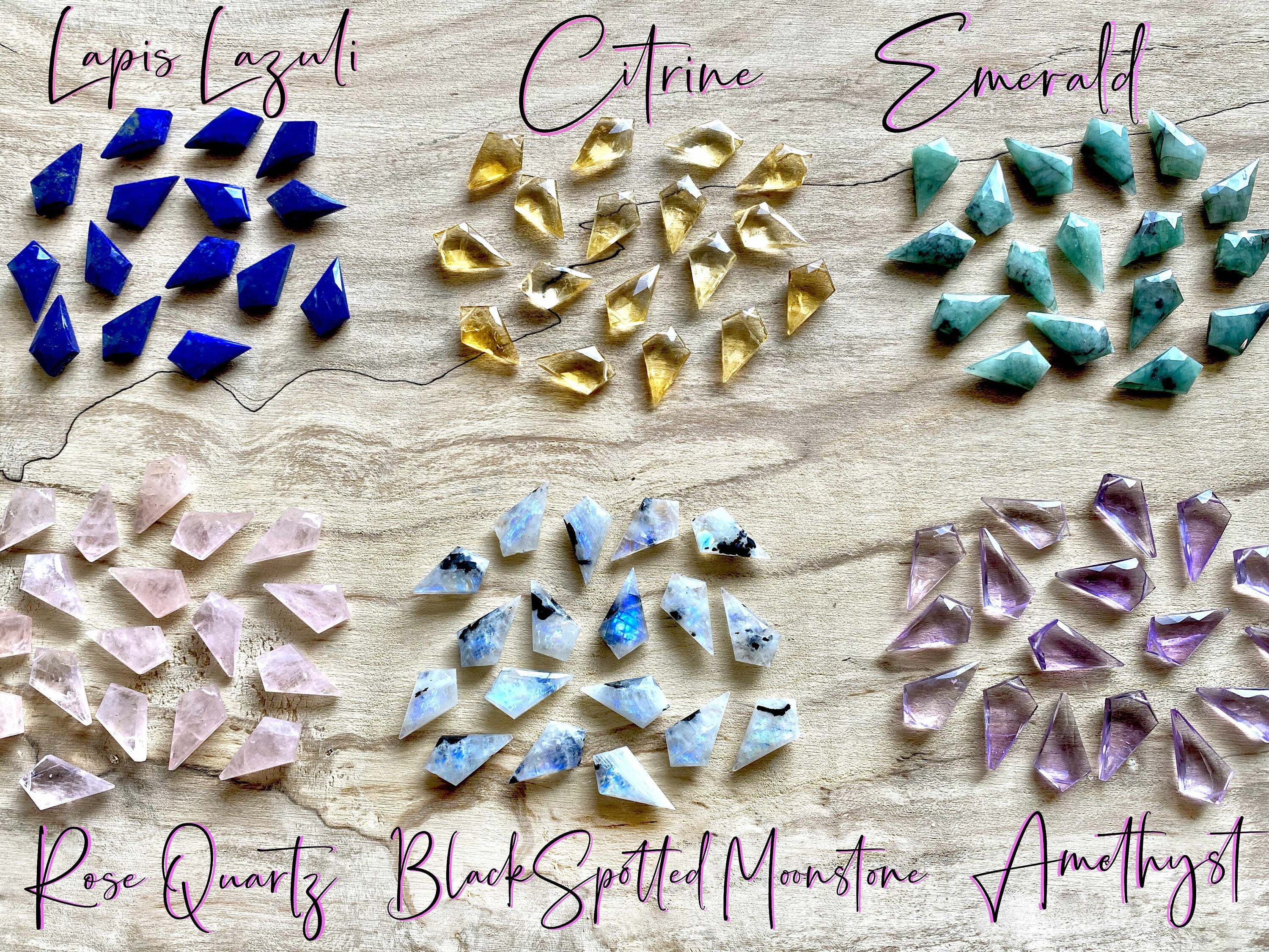 ★ I wirewrap these real crystal point earrings by hand using raw gemstones which have been cut into a faceted spike shape (in your choice of Rose quartz, Black spotted Moonstone, Amethyst, Citrine, Emerald, or Lapis Lazuli) onto threader style earrings hooks. The hooks are available in real sterling silver, real 14k gold vermeil, or real 14k rose gold vermeil. Earring hooks are hypoallergenic and great for sensitive ears! Each earring measures approximately .5" wide x 2" long. They come in a custom gift pouch, ready to gift or keep!