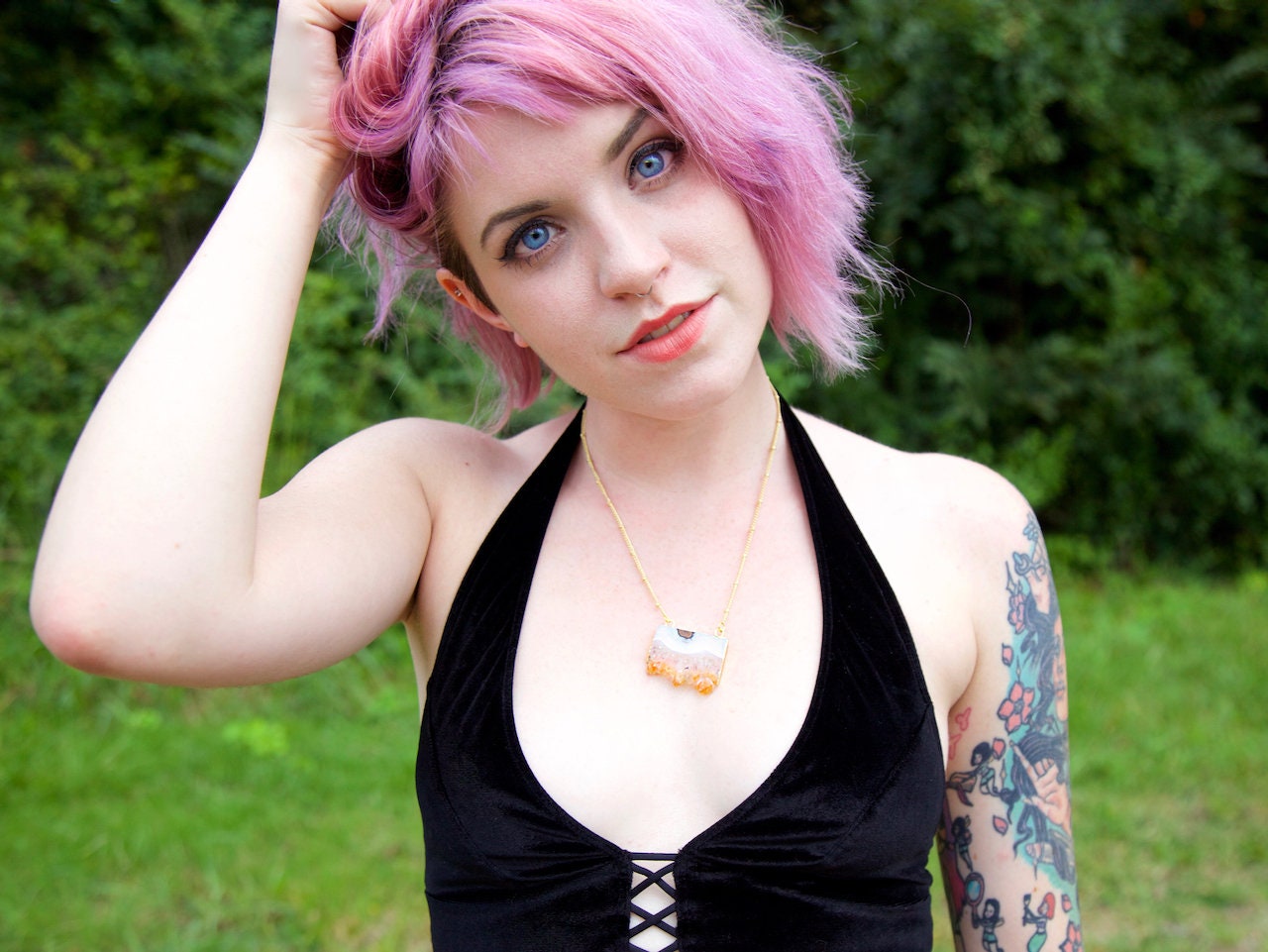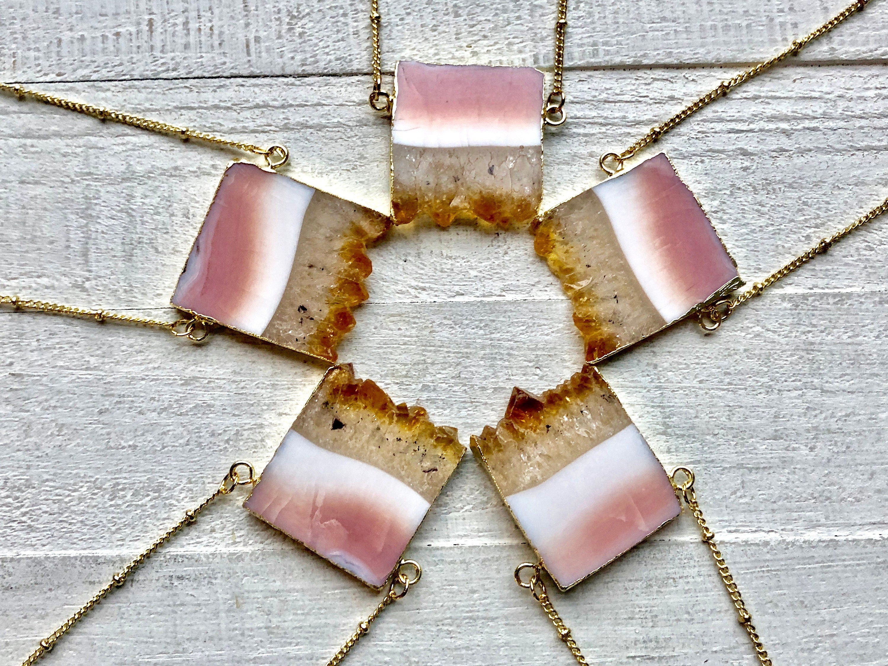 ★ Rare "Strawberry Cheesecake" citrine crystal slices dipped in your choice of silver or gold plating! This citrine has formed on a bed of pink chalcedony / agate giving the top a unique "strawberry cheesecake" effect. Each slice measures approximately 35-40mm across. Chains are available in your choice of length: 18" for a standard necklace length, 24" for medium length, or 30" for long length (Model is wearing 18" for size reference). You may also choose your chain finish: Real .925 Sterling Silver or Silver plated OR Real 14K Gold filled or Gold plated. I highly recommend the real 14K Gold filled and the real Sterling Silver chains are they are tarnish resistant & hypoallergenic! Finally, you may choose your chain style, bead, link, or cable. All chains are shown in the 4th photo.