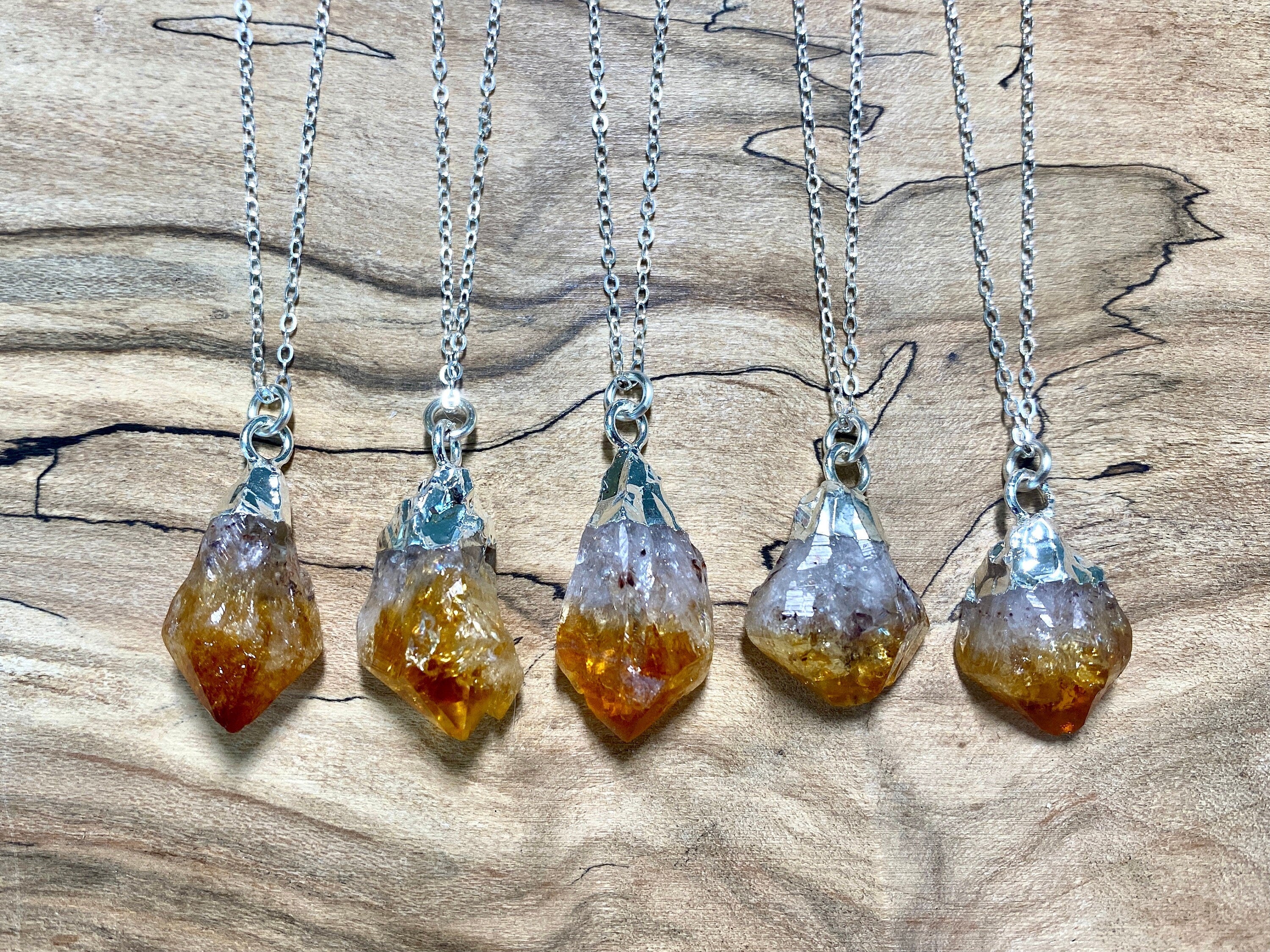 Gorgeous raw citrine crystals dipped in gold or silver plating! Each dainty crystal measures approximately 3/4" - 1" long (see model for size reference). Chains are available in your choice of length: 16" for an extra short length, 18" for a standard length, or 20" for extra length (Model is wearing 18"). Chains come in real 14K Gold filled BEAD chain, Real 14K Gold filled LINK chain, or gold plated cable chain OR real Sterling silver bead chain, real Sterling silver link chain, or silver plated cable chain. Finally, you may choose your chain style. All chains are shown in the 3rd photo. Necklace comes in a custom gift pouch, ready to gift or to keep, along with a free die-cut sticker or magnet!