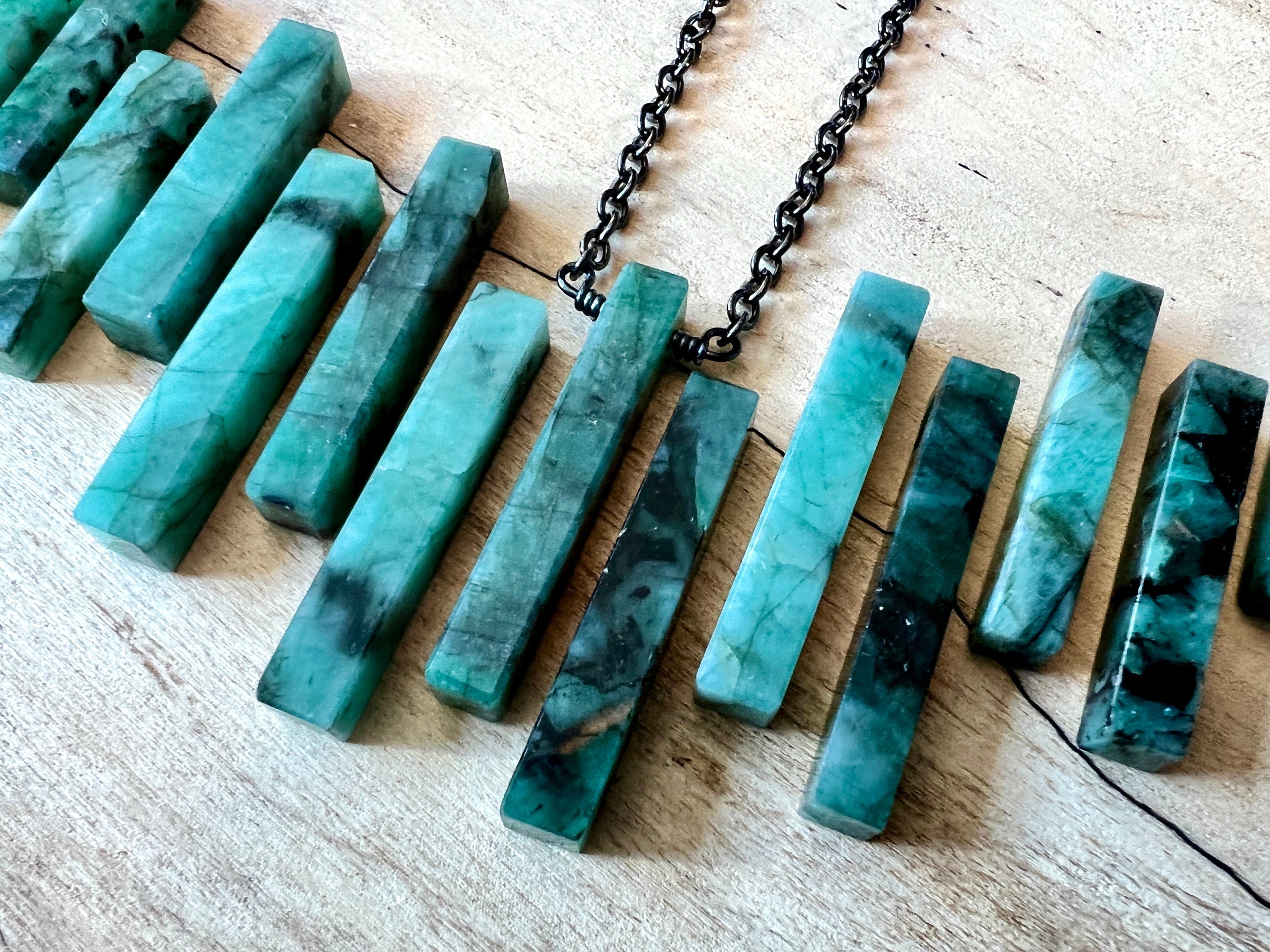★ Raw emerald stones hand cut into a long bar / stick shape measuring approximately 30mm 35mm long. Perfect for men or women! Each stone is wire wrapped by hand. Chains are available in your choice of length: 16", 18", 20", or 24". You may also choose your chain finish: Either Antique silver plated, Bronze, or Gunmetal plated OR an upgrade to Real .925 Sterling Silver, Real 14K Gold filled or Real 14K Rose gold filled. We recommend the Real 14K filled and real Sterling Silver chains as they are tarnish resistant are hypoallergenic! All chains are shown in the 3rd photo. Comes in a custom gift pouch, ready to gift or keep!