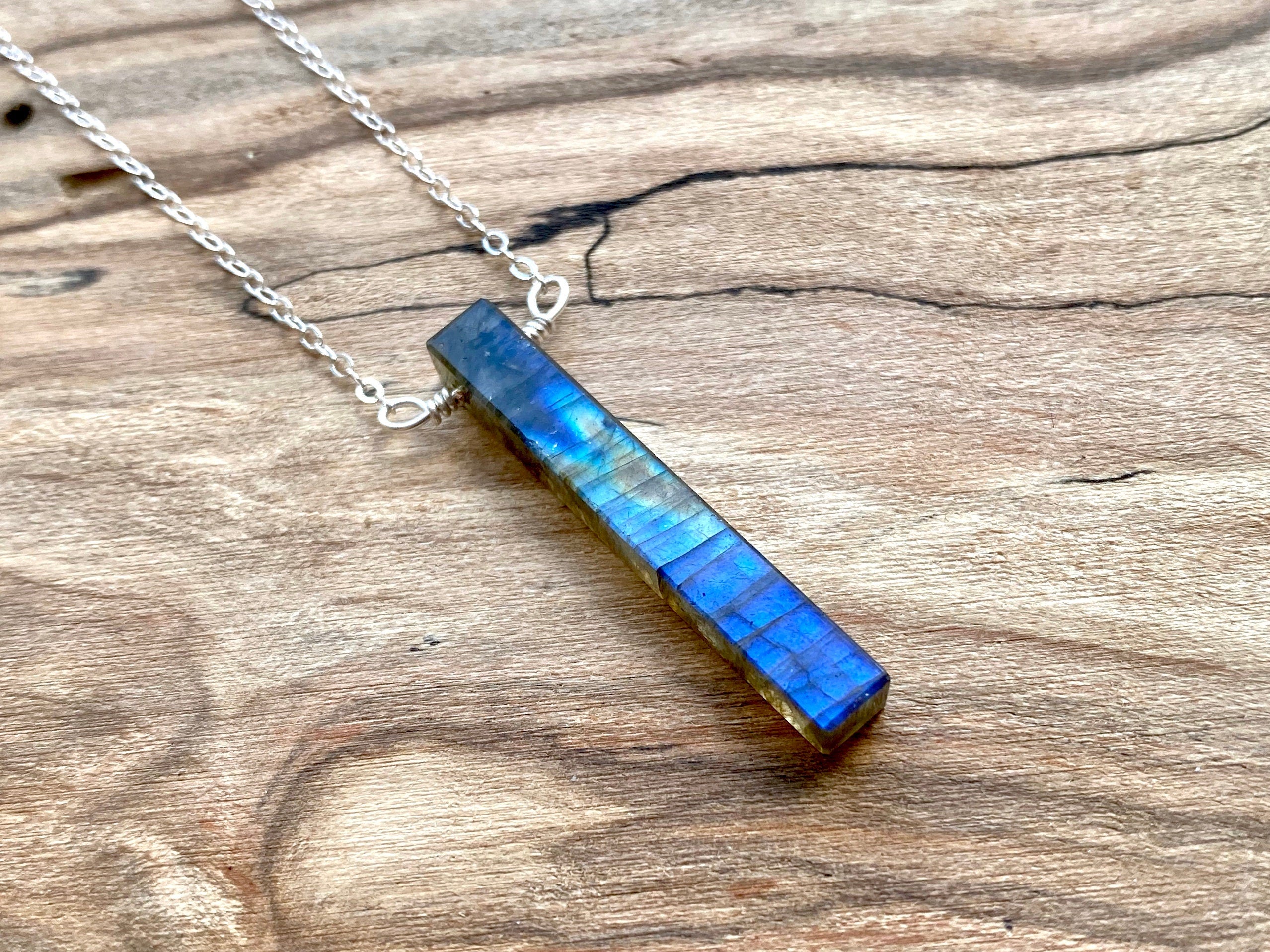 ★ Real high-flash labradorite stones cut into a long bar shape measuring approximately 30mm long. Perfect for men or women! Each stone is wire wrapped by hand. Chains are available in your choice of length: 16", 18", 20", or 24". You may also choose your chain finish: Either Antique silver plated, Bronze, or Gunmetal plated OR an upgrade to Real .925 Sterling Silver, Real 14K Gold filled or Real 14K Rose gold filled. The Real 14K filled and the real Sterling Silver chains are hypoallergenic! All chains are shown in the 3rd photo. Comes in a custom gift pouch, ready to gift or keep!