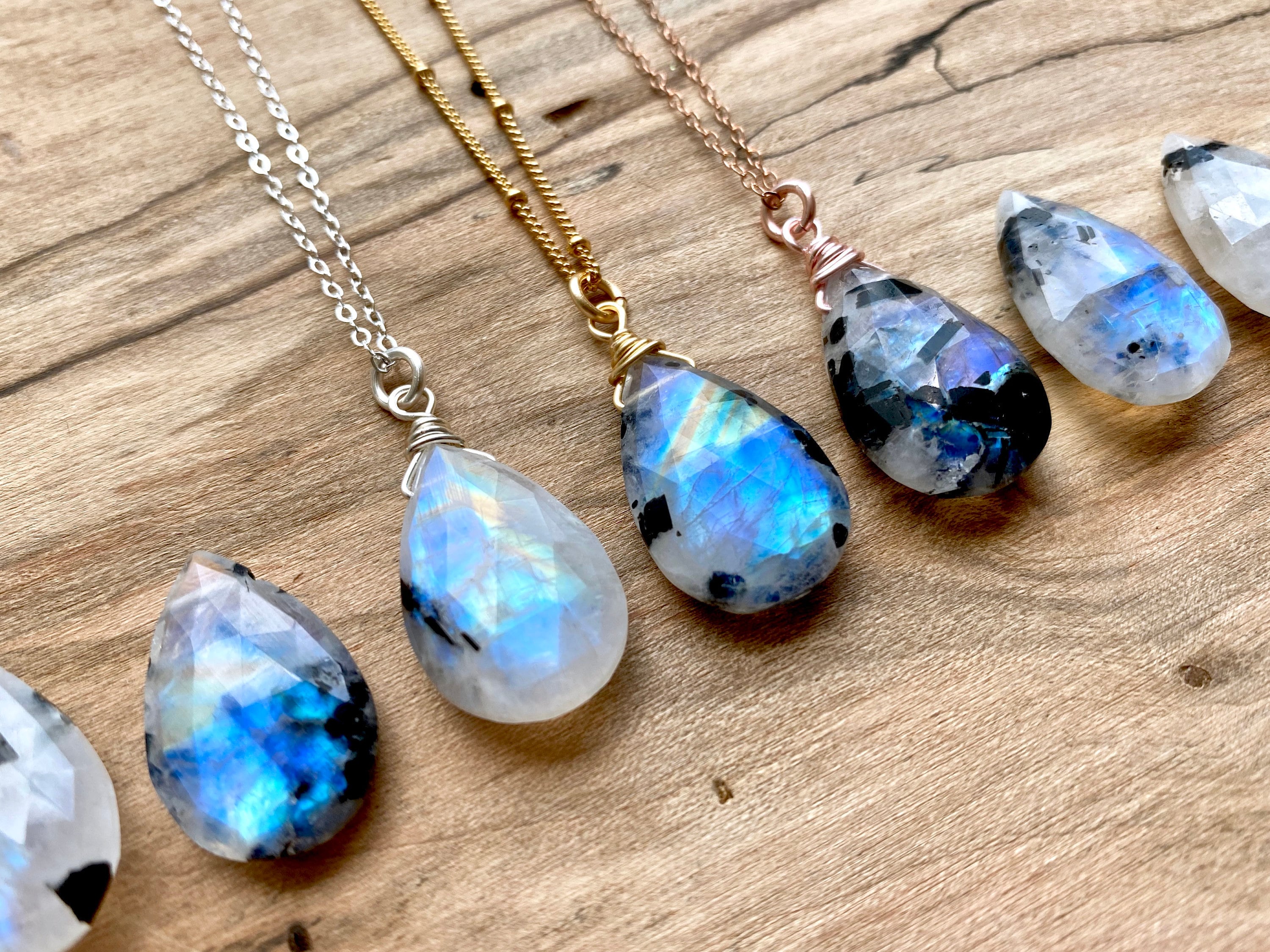 β Handcrafted raw moonstone necklace spotted with black tourmaline inclusions! Each raw gemstone is hand cut into a faceted teardrop shape and wire wrapped by hand as well. Chains are available in your choice of length: 18", 20", or 24". You may also choose your chain finish: Real .925 Sterling Silver or Silver plated, Real 14K Gold filled or Gold plated, or Real 14K Rose gold filled or Rose gold plated. I highly recommend the real 14K Gold filled and the real Sterling Silver chains are they are tarnish resistant & hypoallergenic! Finally, you may choose your chain style. All chains are shown in the 3rd photo. Each pendant measures approximately 14mm wide x 22mm long and comes in a custom gift pouch, ready to gift or keep!
