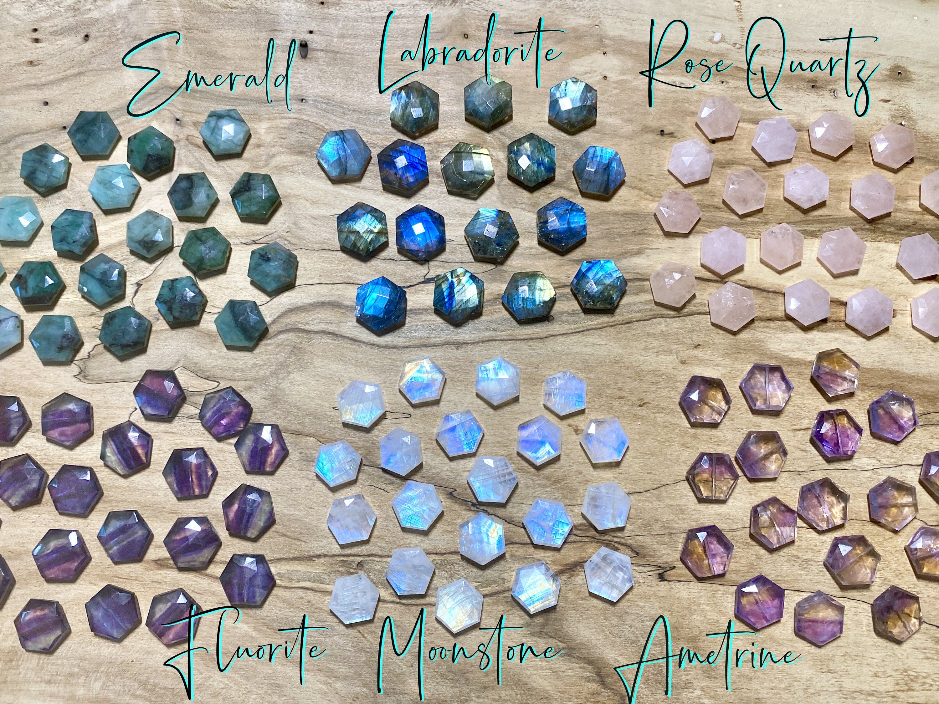 These dainty crystal gemstones are cut into a geometric hexagon shape and wire wrapped by hand in your choice of Moonstone, Labradorite, Ametrine, Fluorite, Emerald, or Rose Quartz. Chains are available in your choice of length: 16" for an extra short length, 18" for a standard length, or 20" for extra length (Model is wearing 18"). You may also choose your chain finish: Real .925 Sterling Silver or Silver plated, Real 14K Gold filled or Gold plated, or Real 14K Rose gold filled or Rose gold plated. I highly recommend the real 14K Gold filled and the real Sterling Silver chains are they are tarnish resistant & hypoallergenic! Finally, you may choose your chain style. All chains are shown in the 4th photo. Necklace comes in a custom gift pouch, ready to gift or to keep, along with a free die-cut sticker or magnet! Each stone measures approximately 14mm.