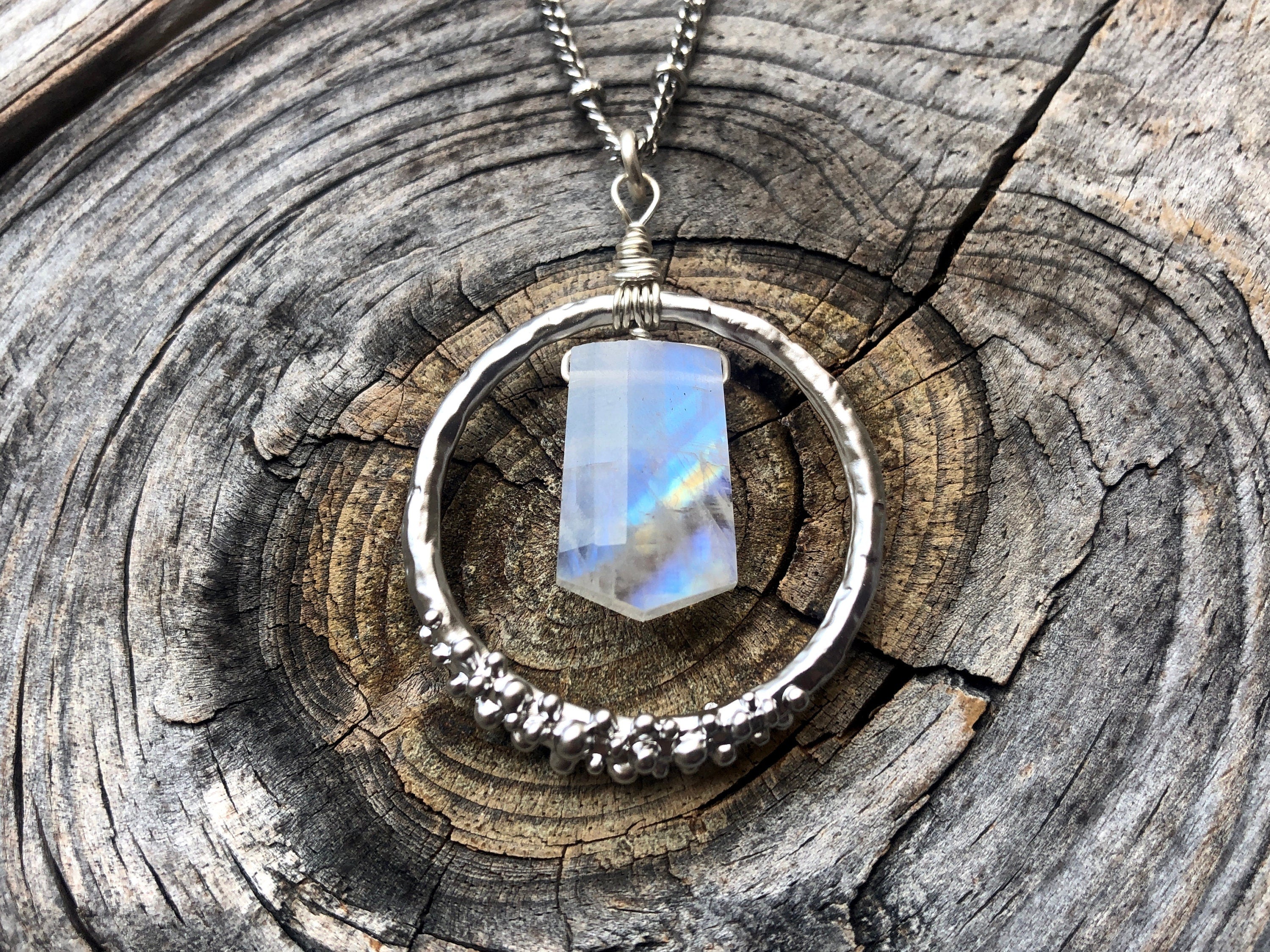 I handmade these unique necklaces by wire wrapping a faceted real crystal point (in your choice of moonstone, labradorite, ametrine, fluorite, or blue lace agate) onto a large round infinity ring with decorative dew drops. The pendant is made in your choice of gold, rose gold, or silver plated. Chains are available in your choice of length: 18" for a standard necklace length, 24" for medium length, or 30" for long length (Model is wearing 18"). You may also choose your chain finish: Real .925 Sterling Silver or Silver plated, Real 14K Gold filled or Gold plated, or Real 14K Rose gold filled or Rose gold plated. I highly recommend the real 14K Gold filled and the real Sterling Silver chains are they are tarnish resistant & hypoallergenic! Finally, you may choose your chain style. All chains are shown in the 6th photo. Each pendant measures approximately 1.25" wide x 1.5" long and comes in a custom gift pouch, ready to gift or keep!
