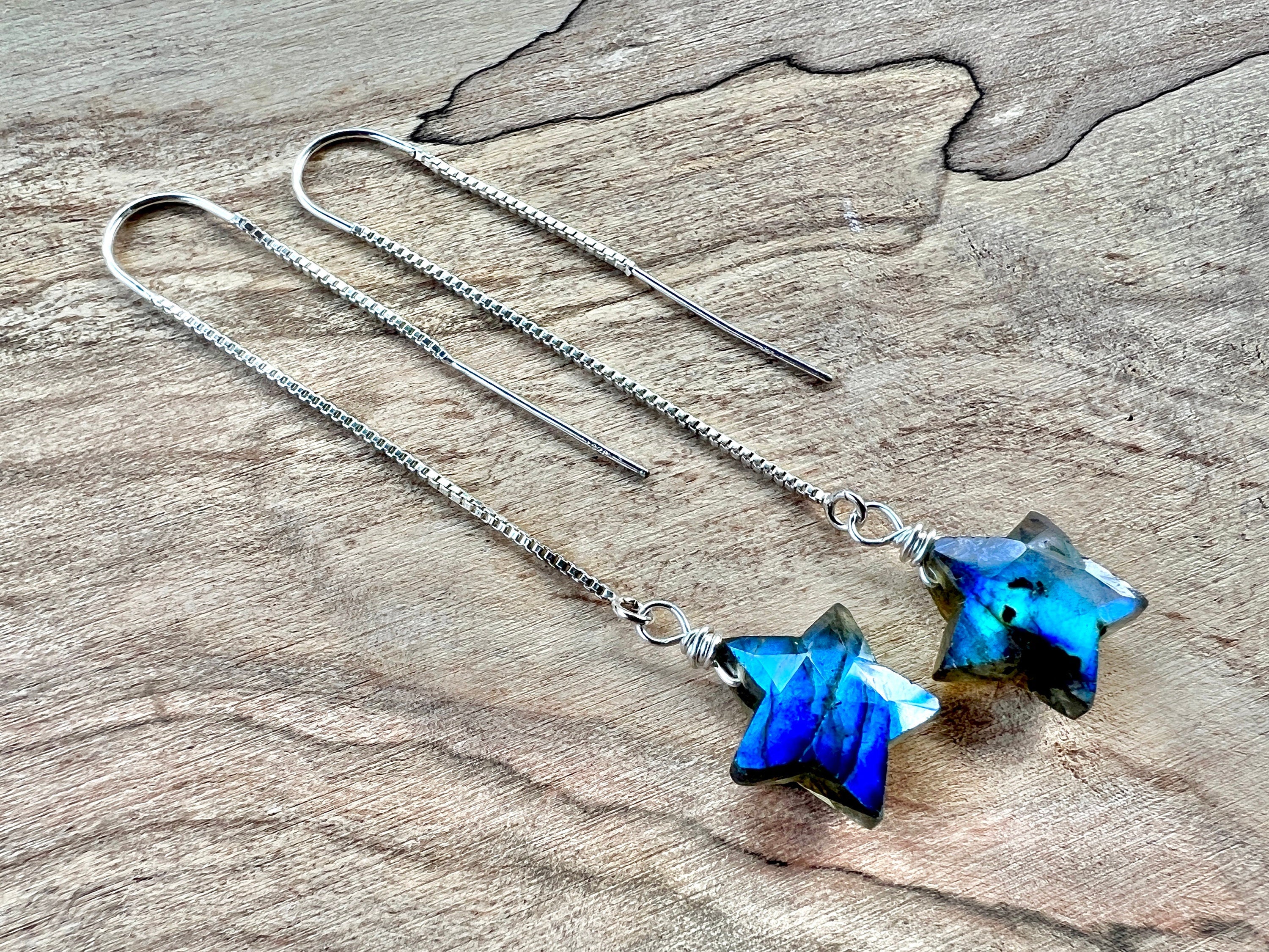 ★ Real raw gemstones hand-cut into star shapes! Each dainty faceted star gemstone is wire wrapped by hand (in your choice of moonstone, black spotted moonstone, labradorite, citrine, lapis lazuli, bumblebee jasper, rutilated quartz, garnet, smoky quartz, amazonite, amethyst, blue lace agate, or emerald) onto long threader chain earring hooks. he threader hooks come in your choice of real Sterling Silver, real 14K Gold filled or real 24K Rose gold vermeil with matching wire wrapping. The earrings are hypoallergenic and tarnish resistant, great for sensitive ears! The threader hooks are surprisingly easy to put on and very comfortable! Each earring measures approximately 2.2" long. The stones themselves measure 13mm across. Earrings come in a custom gift pouch, ready for gifting or to keep!