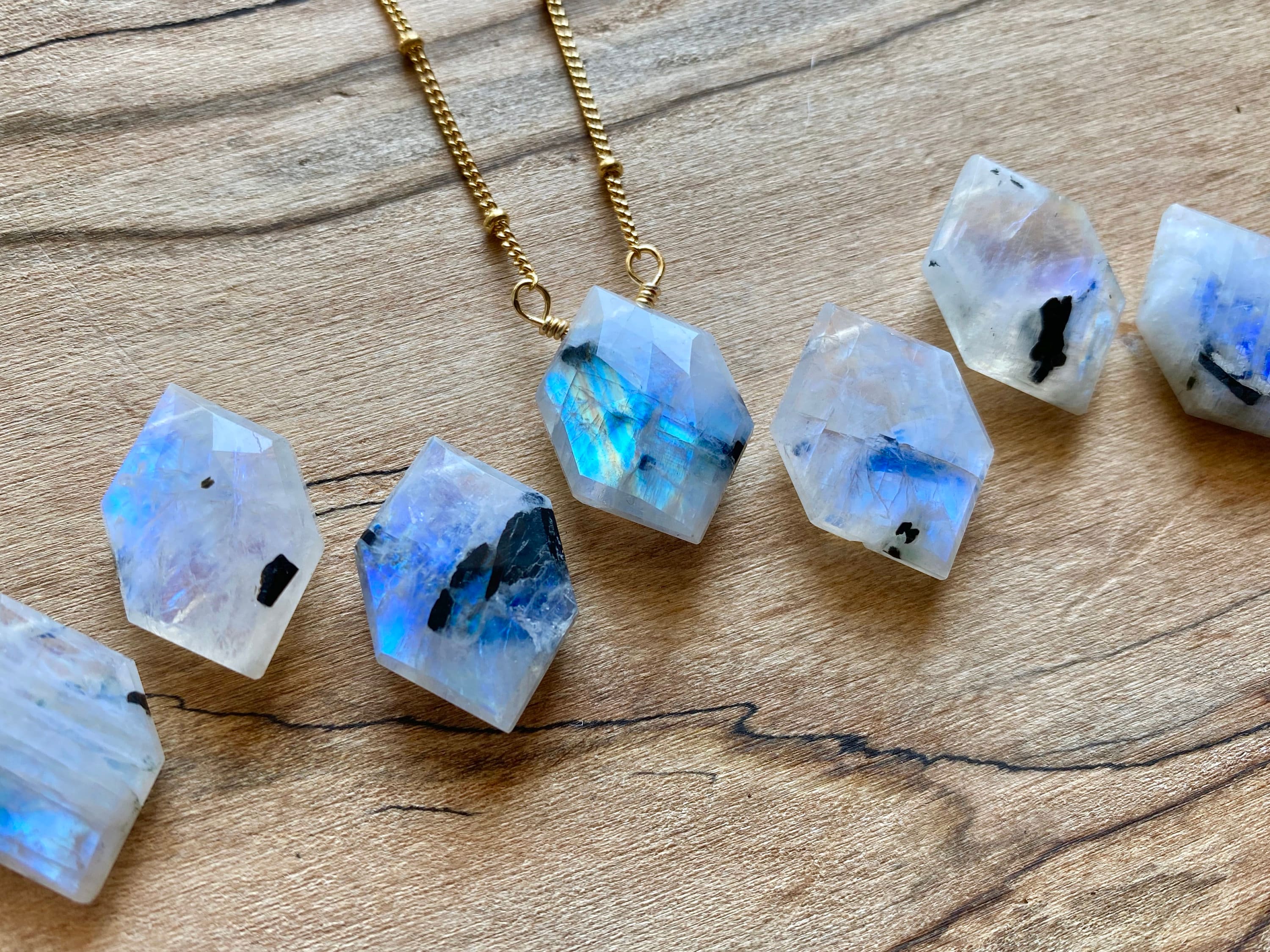 Faceted hexagon shape gemstones hand-cut and wire wrapped (in your choice of rose quartz, labradorite, ametrine, fluorite, or black spotted moonstone). Chains are available in your choice of length: 18", 20", or 24" (18" is most popular for women while 24" is most popular for men - Model is wearing 18"). You may also choose your chain finish: Real .925 Sterling Silver or Silver plated, Real 14K Gold filled or Gold plated, or Real 14K Rose gold filled or Rose gold plated. I highly recommend the real 14K Gold filled and the real Sterling Silver chains are they are tarnish resistant & hypoallergenic! Finally, you may choose your chain style. All chains are shown in the 3rd photo. Each pendant measures approximately 13mm wide x 20mm long and comes in a custom gift pouch, ready to gift or keep!