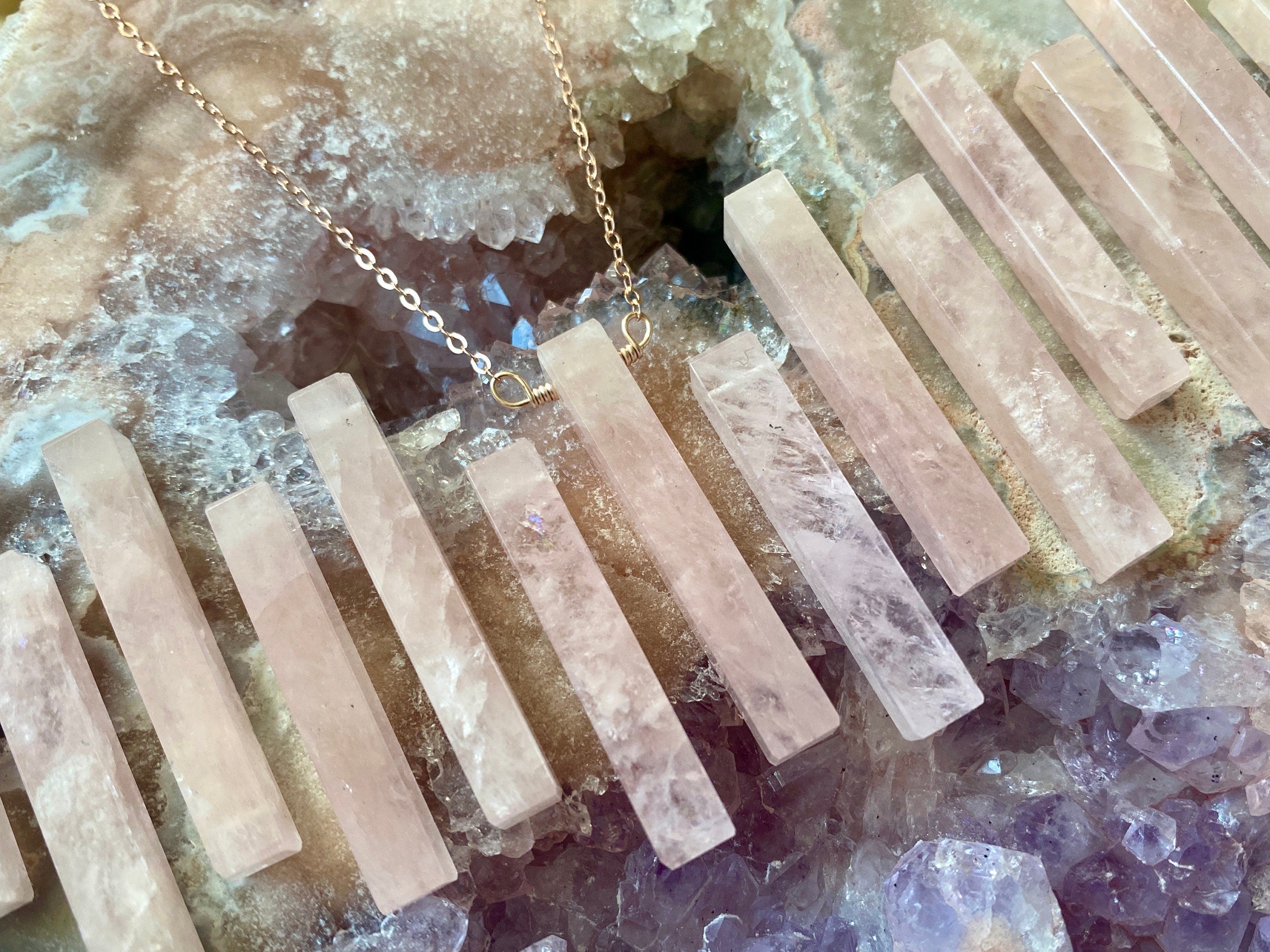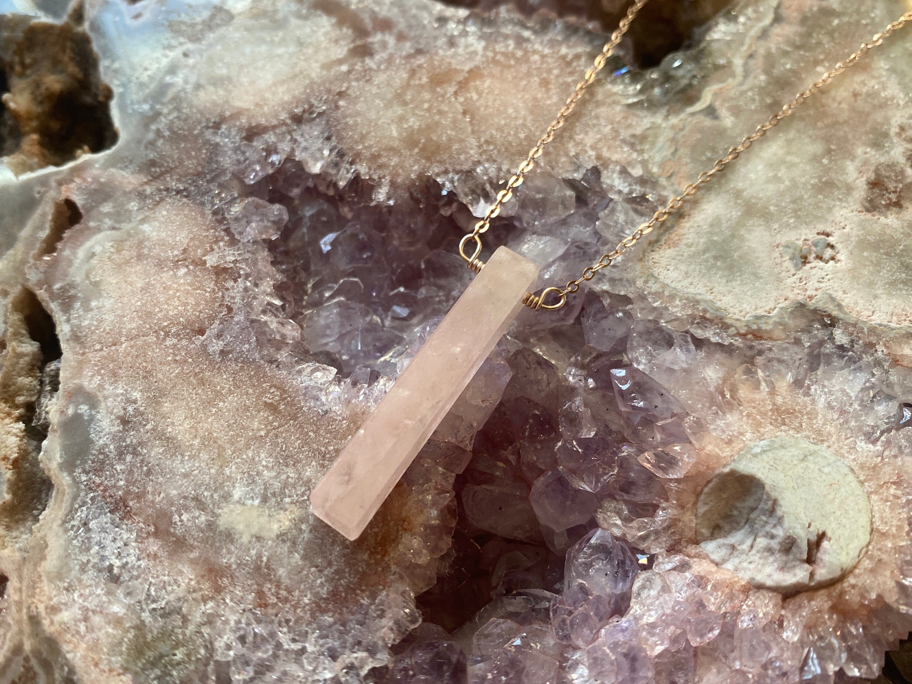 ★ Real rose quartz hand cut into a long bar / stick shape measuring approximately 30-35mm long. Perfect for women or men! Each stone is wire wrapped by hand. Chains are available in your choice of length: 16", 18", 20", or 24". You may also choose your chain finish: Either Antique silver plated, Bronze, or Gunmetal plated OR an upgrade to Real .925 Sterling Silver, Real 14K Gold filled or Real 14K Rose gold filled. The Real 14K Gold filled and the real Sterling Silver chains are hypoallergenic! All chains are shown in the 3rd photo. Comes in a custom gift pouch, ready to gift or keep!