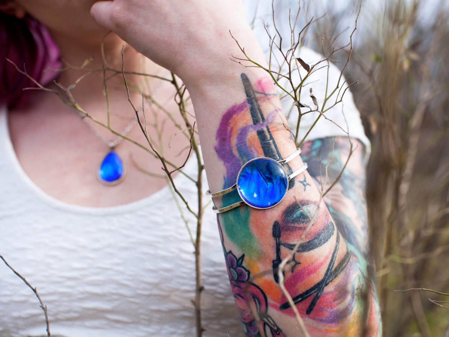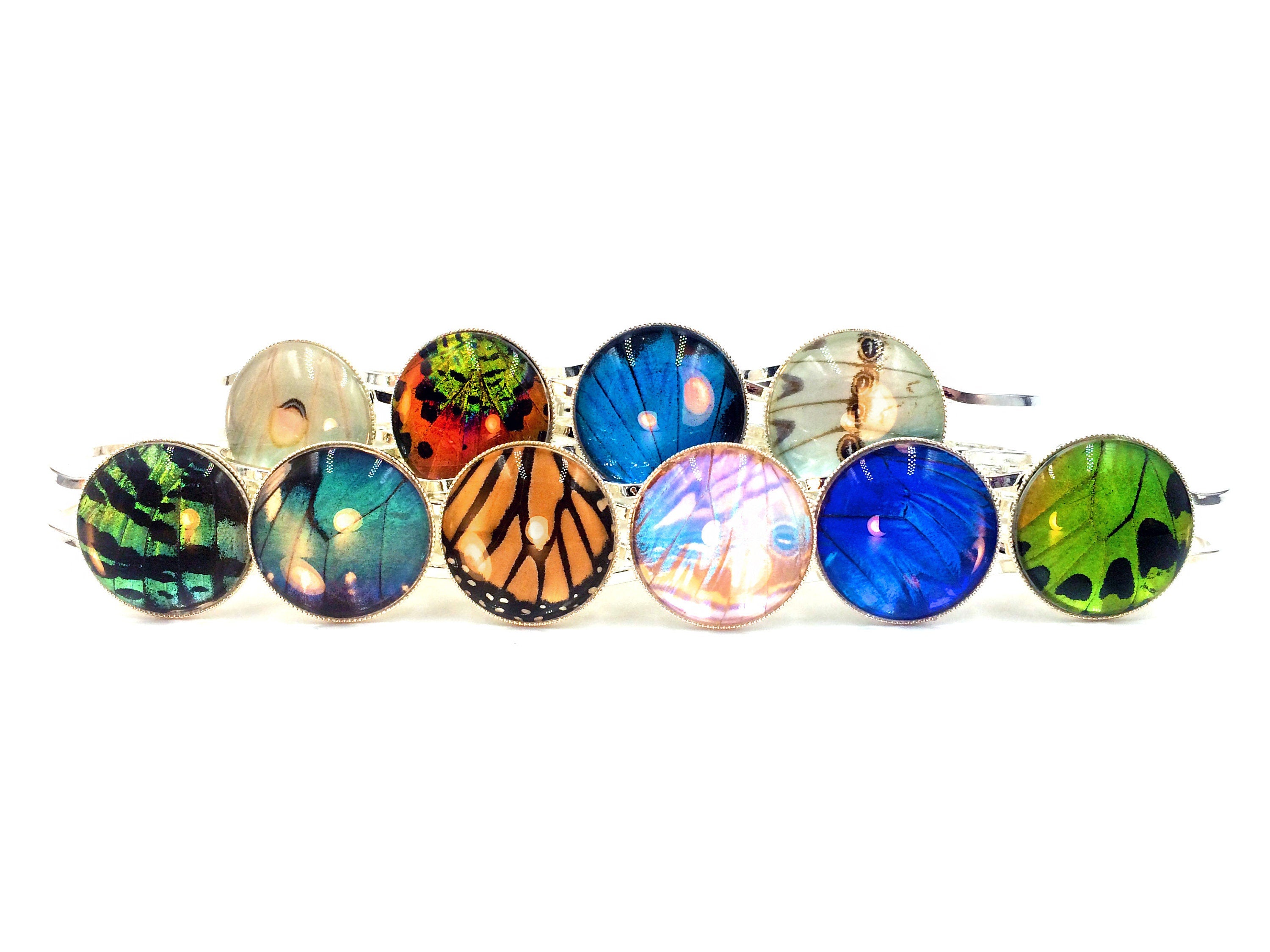 ★ This stunningly vibrant bracelet is handcrafted from a REAL Morpho Rhetenor Butterfly Wing (top wing) set under a large magnified glass cabochon. The cuff bracelet is available in antique silver (as pictured) or gunmetal. The glass cabochon measures 30x30mm.