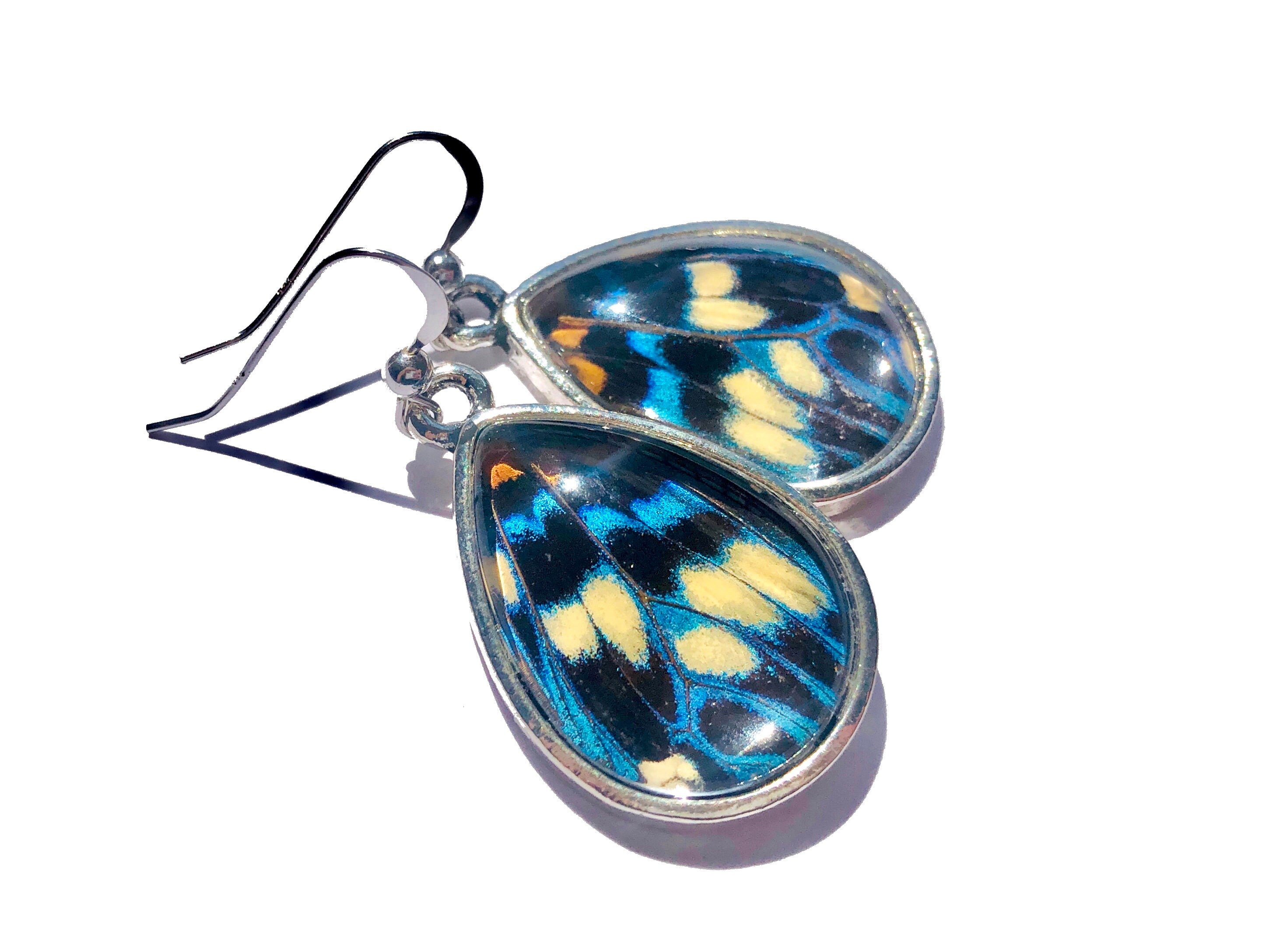 ★ These unique earrings are made from real Erasmia Pulchera moth wings! Or you can choose your own custom butterfly species from the third photo! (Read below for more on how I ethically obtain the wings). Each butterfly wing is embedded under a magnified glass teardrop measuring 18x25mm and set in your choice of silver tone, yellow gold tone, rose gold tone, bronze, or gunmetal. Earrings come on french hook earring wires. An upgrade to a real .925 Sterling Silver earring hooks or real 14K gold filled earring hooks available in the drop down menu! Each pair of earrings comes in its own custom gift pouch with literature on the species of butterfly and a free die-cut sticker or magnet! These are an Original Chrysalis Studios design © 2019.