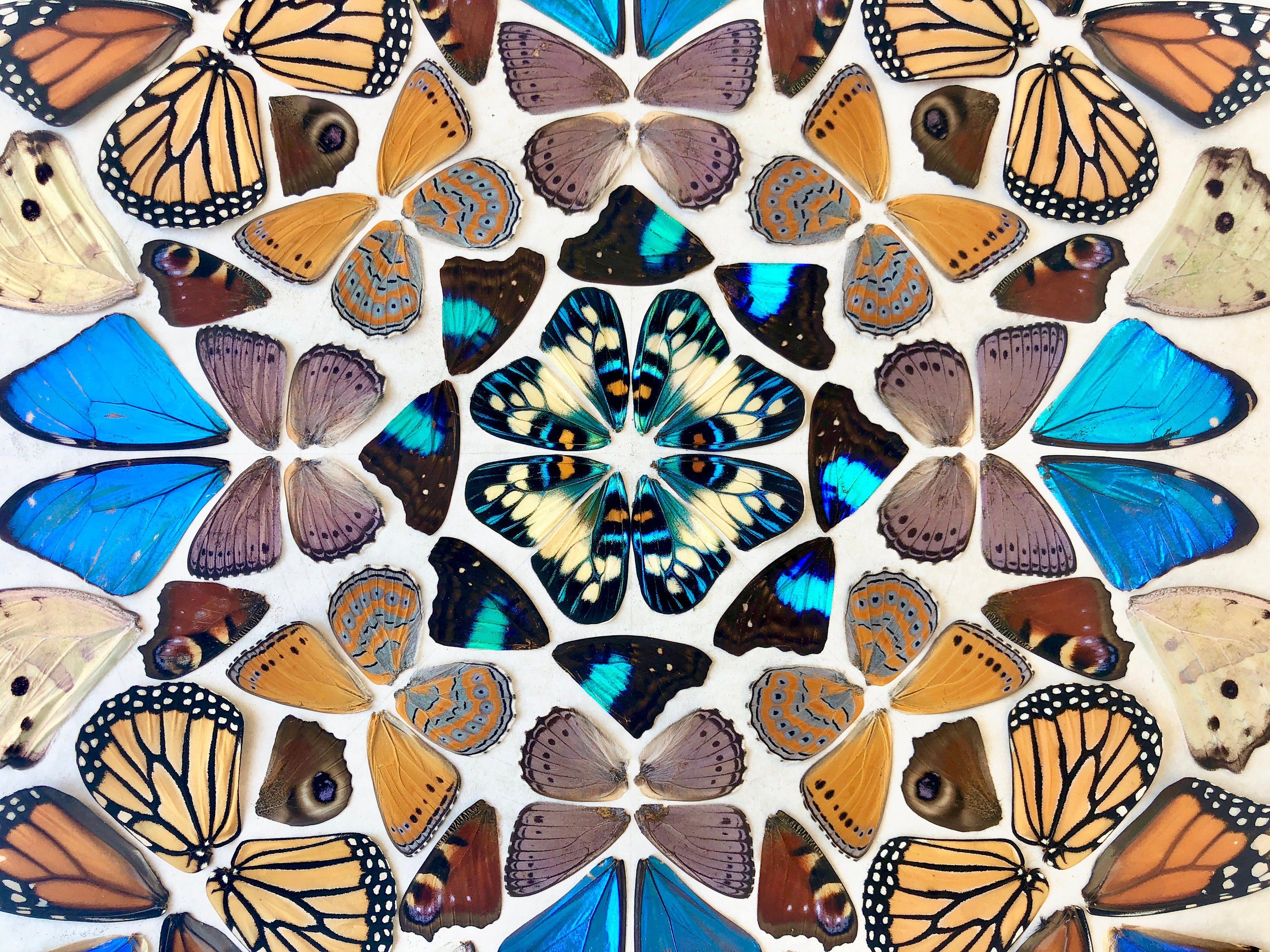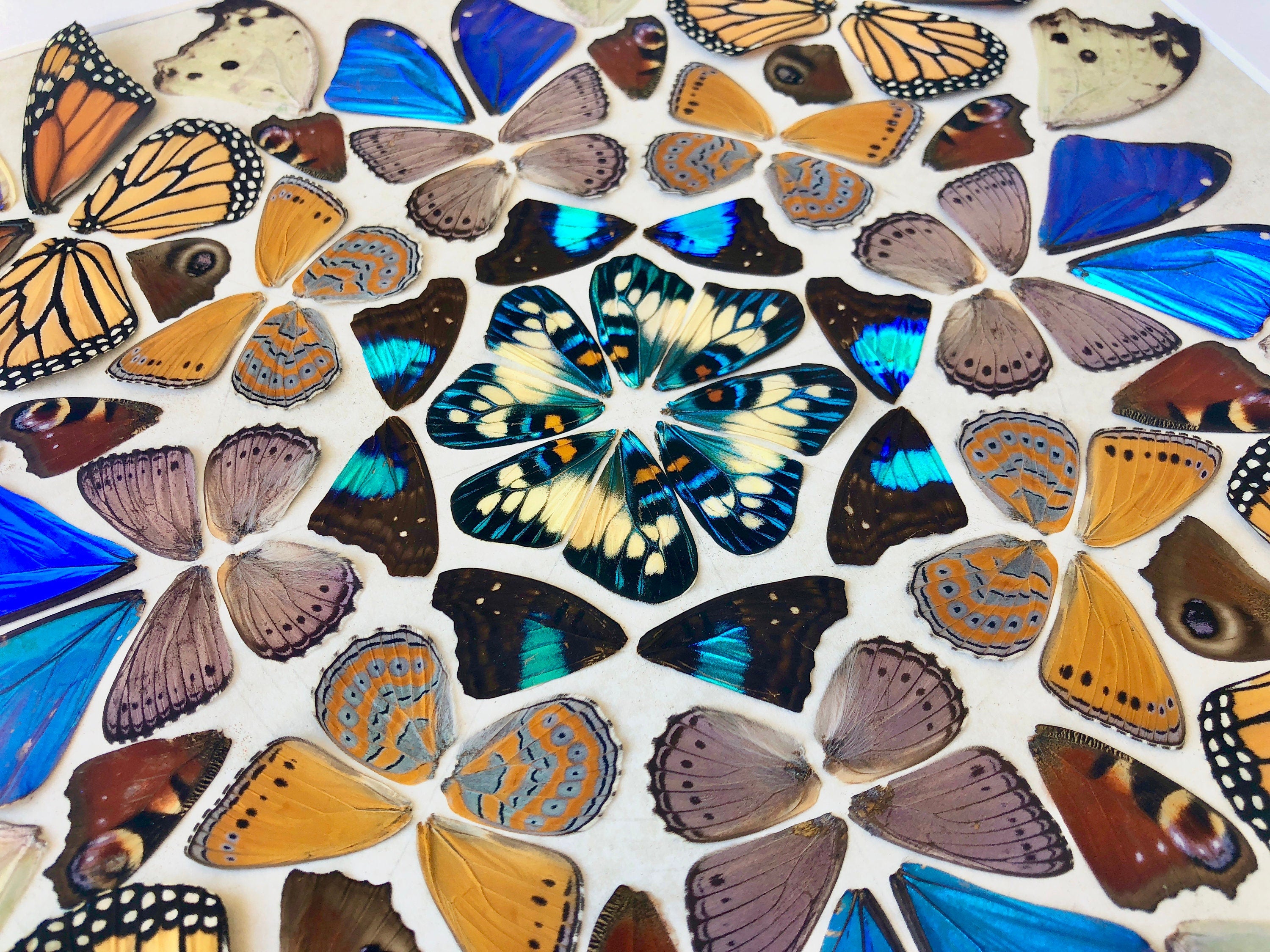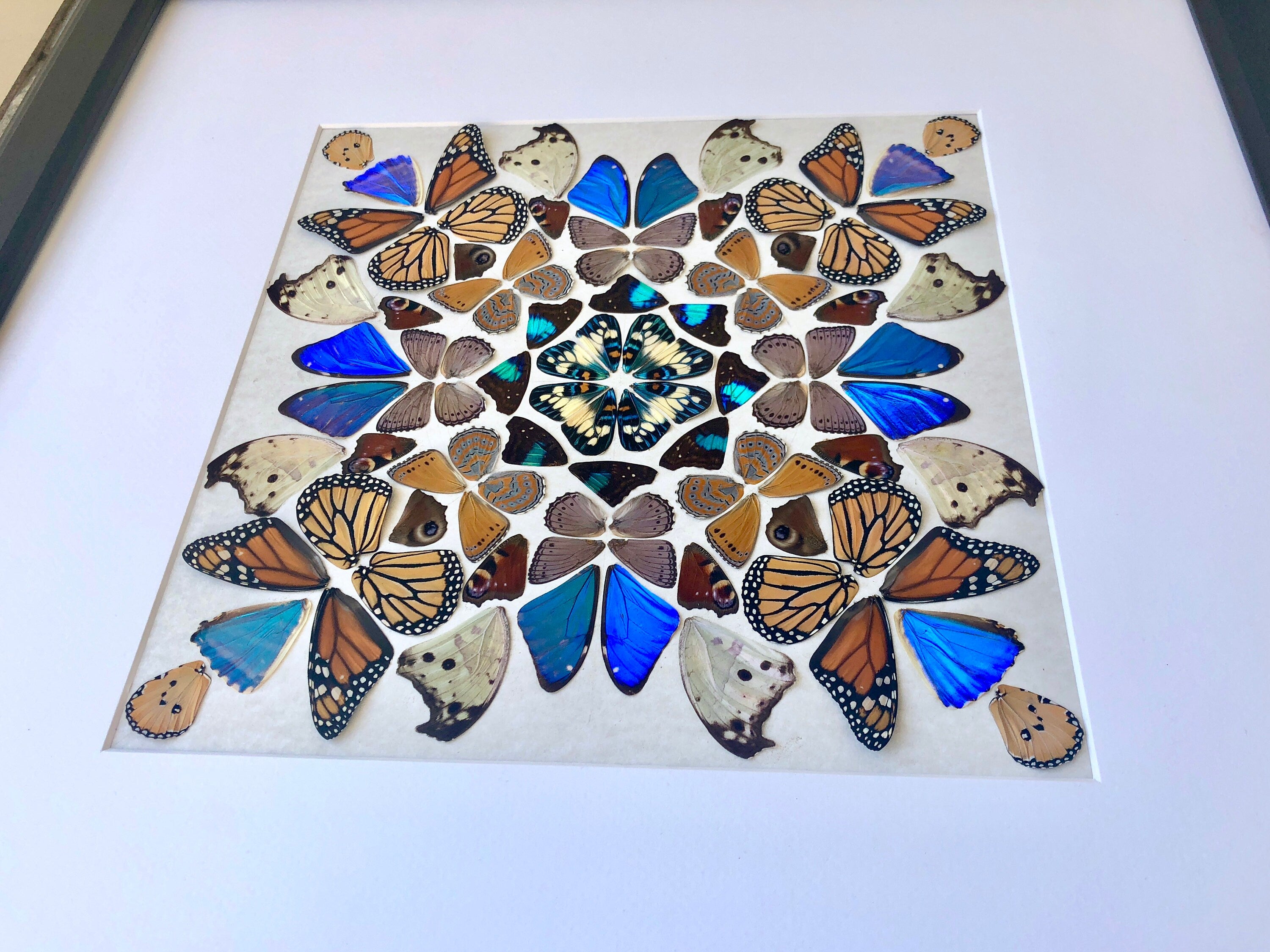 I have handcrafted this collage out of real butterfly wings! The large frame measures almost 2 feet x 2 feet (approximately 21” x 21”) and the collage contains 100 real *ethically sourced* butterfly wings to include Blue morphos, Monarchs, African Monarchs, Doxocopa Cherubina, Erasmia Pulchera, Salamis Parhassus butterflies and more, all arranged into a kaleidoscope formation! The artwork is mounted on a textured cream background with a white mat border and your choice of a black or white frame. You may also choose regular glass or an upgrade to special museum grade UV protective glass.