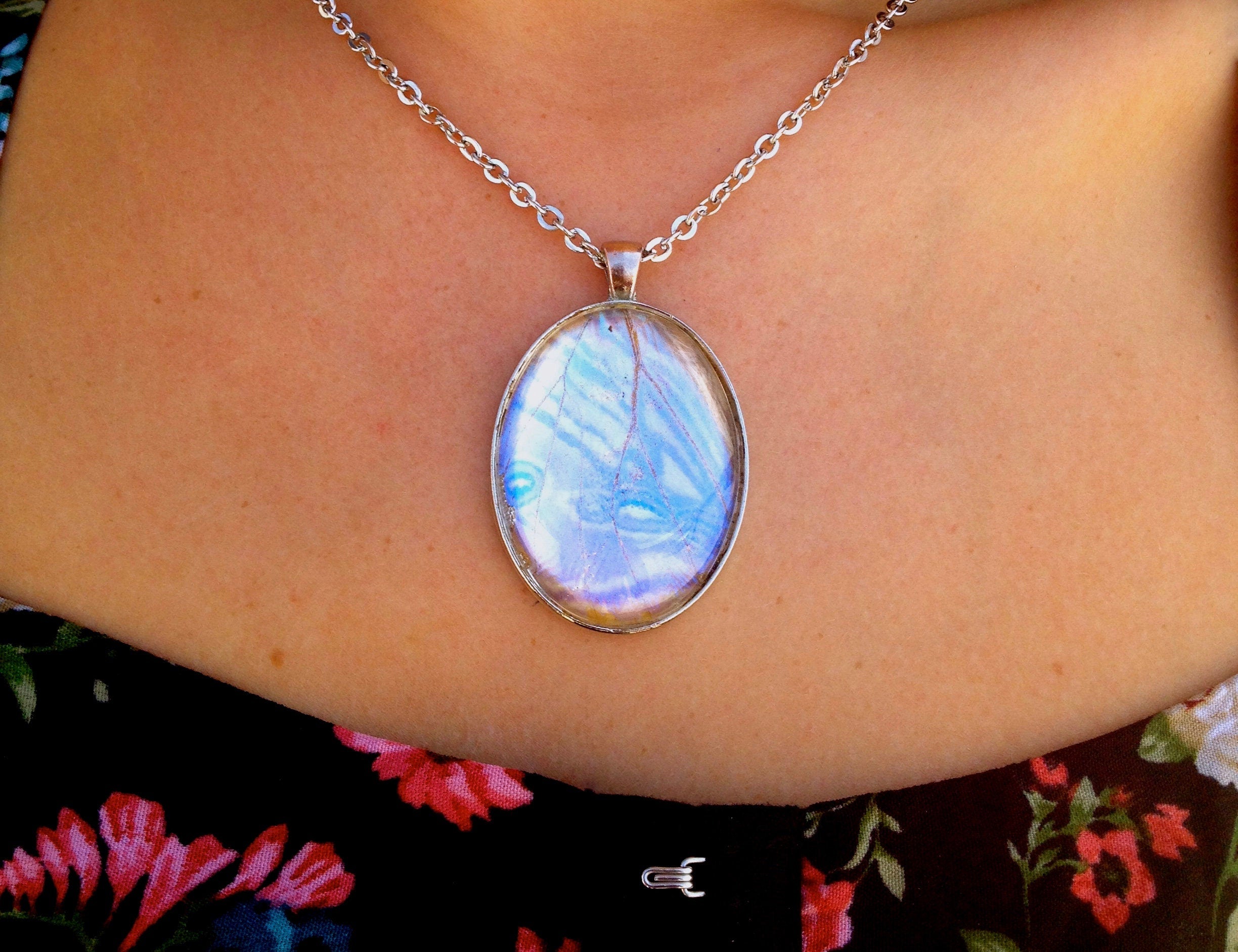 ★ This stunning pendant necklace is handmade with a real butterfly wing from my favorite species, the Morpho Sulkowski, also known as the "pearl morpho" or the "Opal morpho" butterfly"! The pearl morpho's wings really do resemble a shimmering opal or pearl! The wing is expertly embedded under a magnified glass cabochon 1.2" x 1.6" (as pictured). The pendant is hung from your choice of a short 18" chain or a long 30" chain. An upgrade to a real Sterling Silver chain is also available. Please read below for more on how I ethically obtain the wings :)