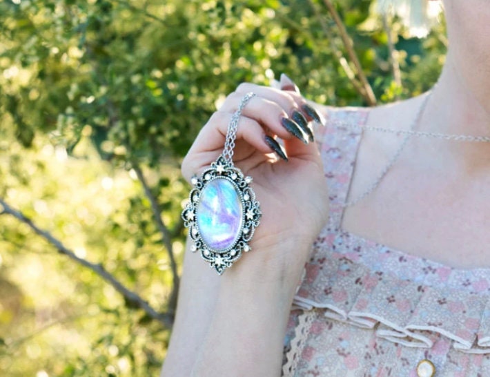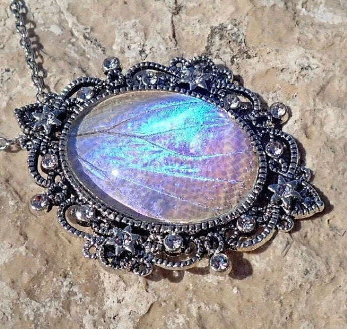 ★ The dazzling iridescence of the Morpho Sulkowski butterfly is truly spectacular! I have handcrafted this necklace from a REAL Morpho Sulkowski Butterfly wing embedded under a large 1.2" x 1.6" magnified glass cabochon and set in an antique silver victorian style setting with Swarovski crystals. (See below for more info on how I ethically obtain the wings!)