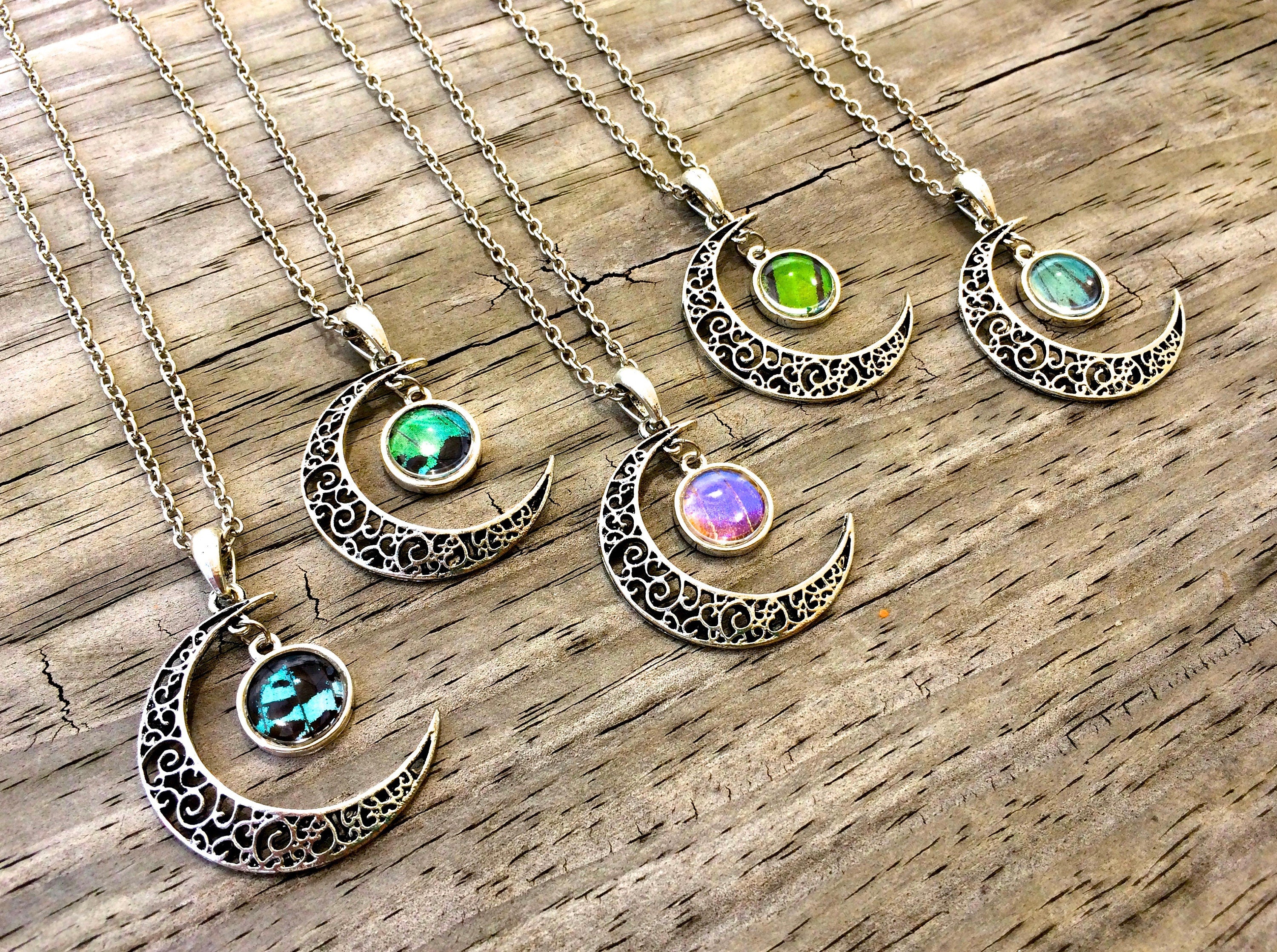 ★ These cool crescent moon & star necklaces feature real butterfly wings in each charm! The charms are handmade with a real butterfly or moth wing expertly embedded under glass using my original process! (All wings are ethically sourced! Scroll down for more information on where I get the wings!) Each piece comes with its own custom gift pouch with literature on the species of butterfly and a free die-cut sticker or magnet! These are an ORIGINAL Chrysalis Studios design © 2012.