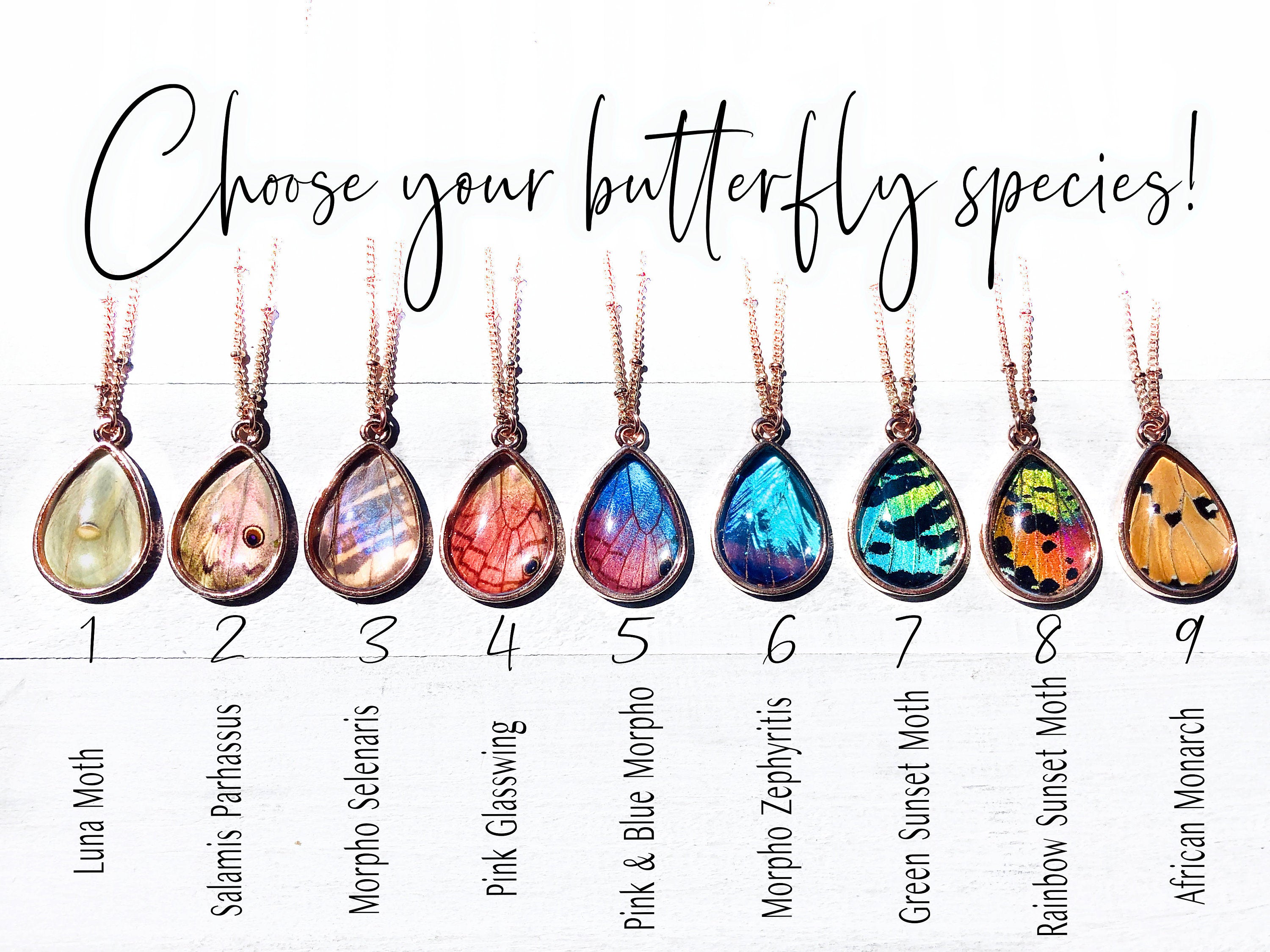 Choose which type of butterfly species you would like in your necklace ! (Butterfly wing species / color options going left to right in 4th "numbered" photo):