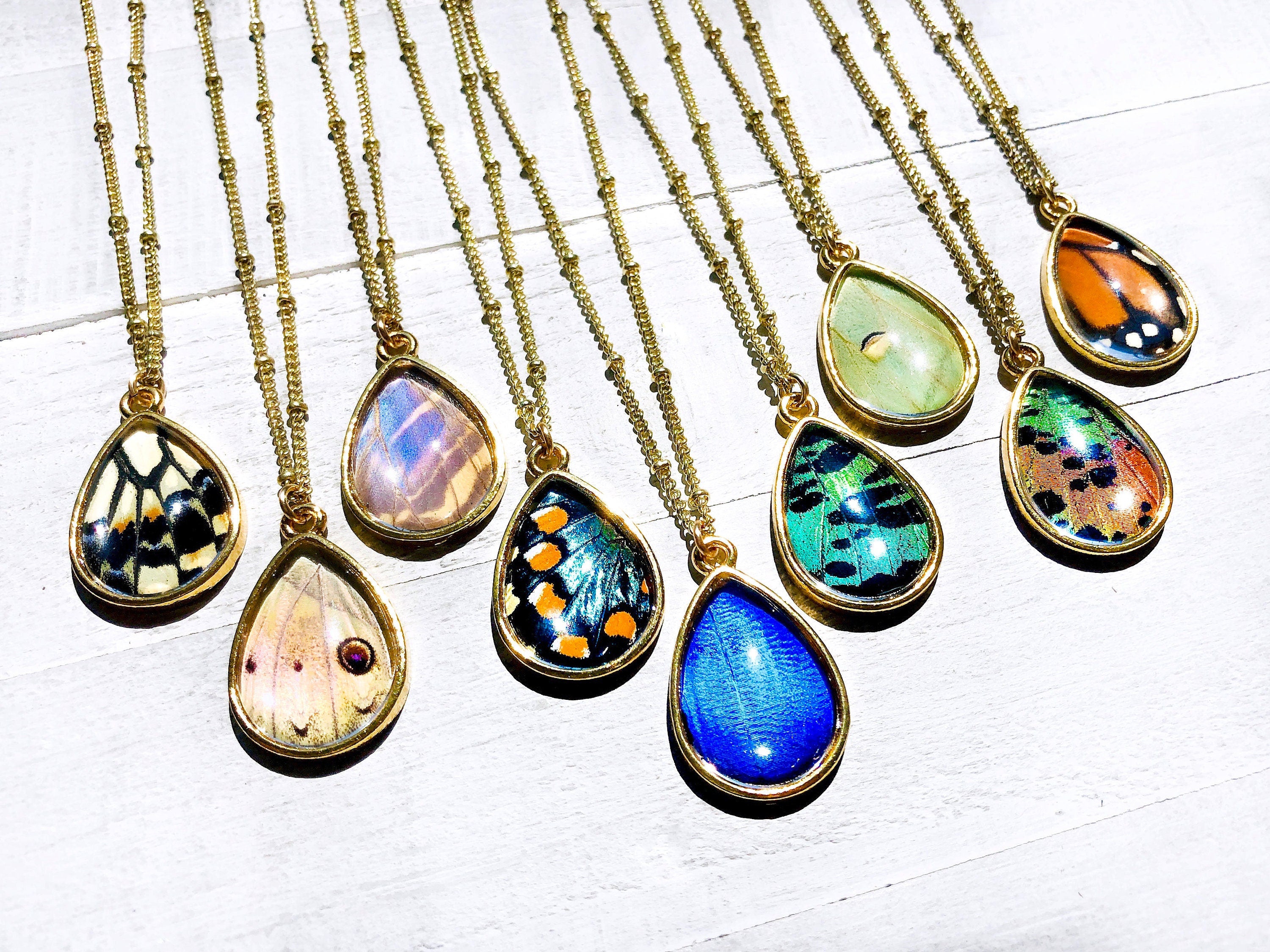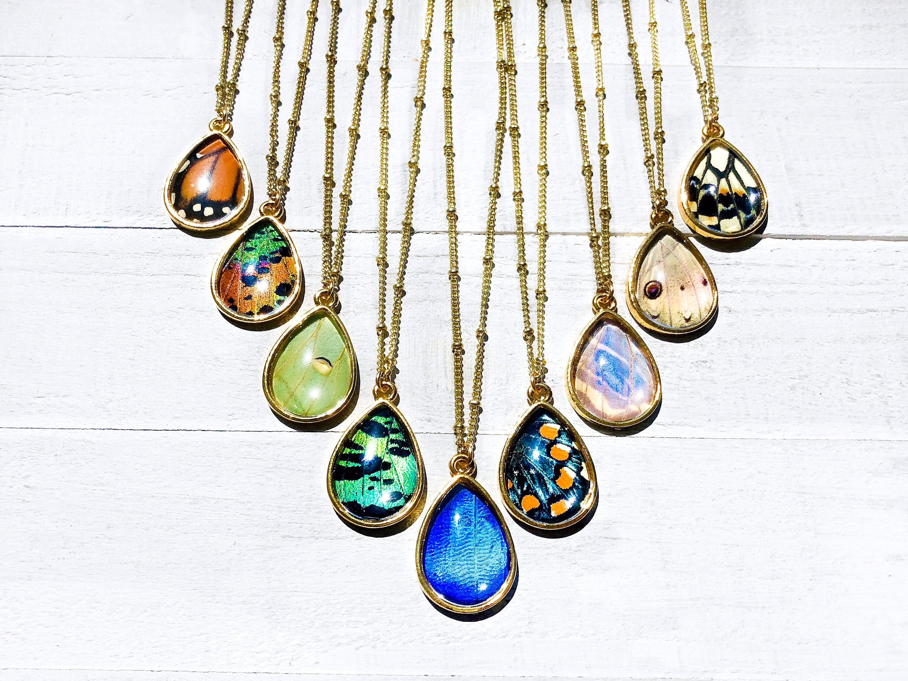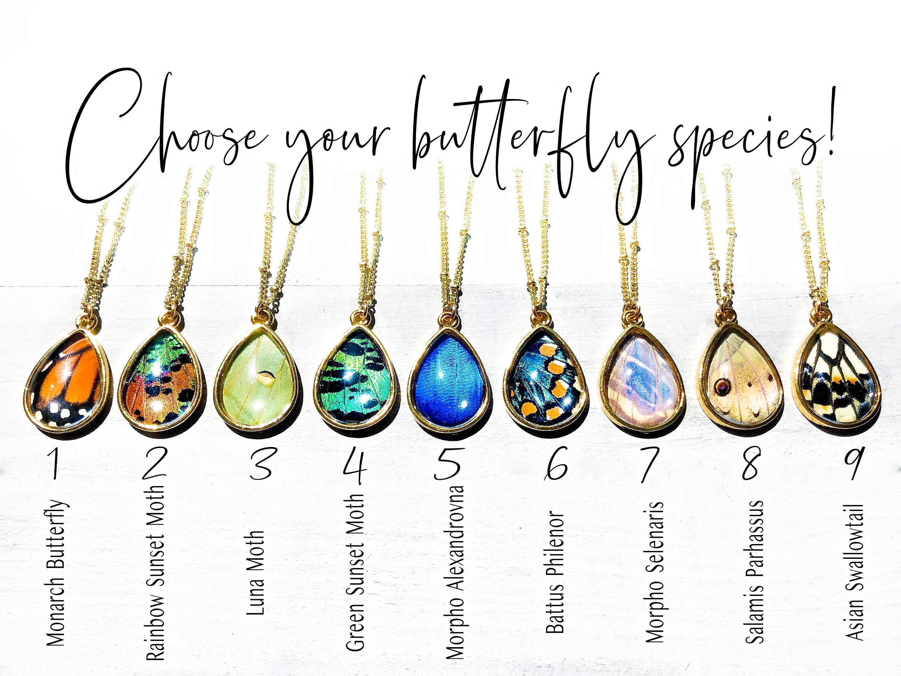 Choose which type of butterfly species you would like in your necklace! (Butterfly wing species / color options going left to right in 4th "numbered" photo):