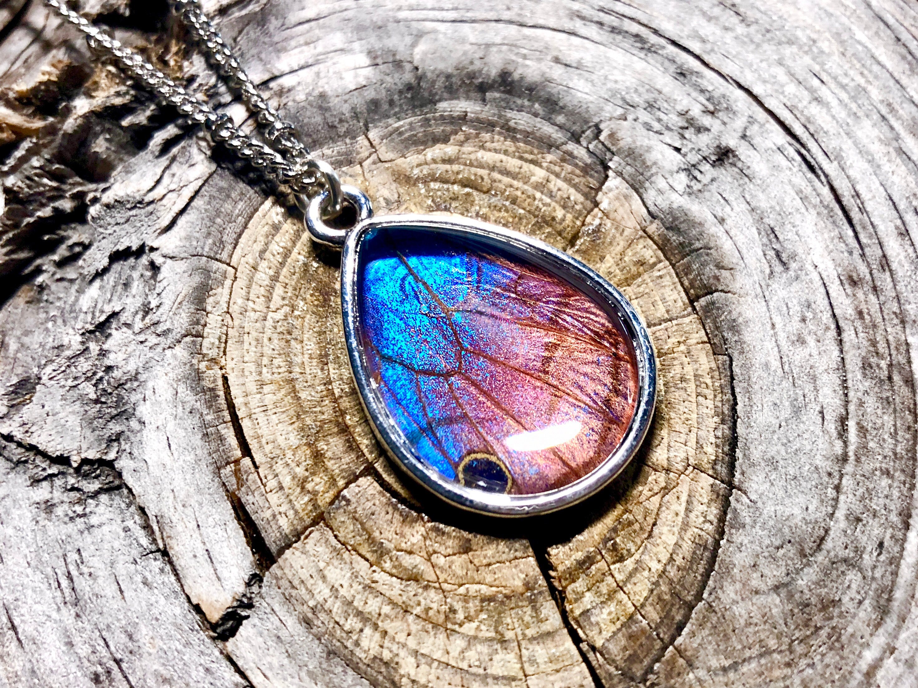 ★ This unique necklace makes the perfect Valentines day gift! It is handcrafted using 2 real butterfly wings expertly embedded under magnified glass! (Read below for more on how I ethically obtain the wings!). I have overlapped a real Pink Glasswing butterfly wing on top of a real Blue morpho butterfly wing. Due to the Pink Glasswing butterfly being partially translucent, you can see the gorgeous iridescent blue morpho wing underneath! The wings are then embedded under a magnified glass teardrop measuring 18x25mm and set in your choice of silver plated, gold plated, rose gold plated, bronze, or gunmetal. Pendants come on an 18" chain in matching metal color. You may choose your chain finish: Real .925 Sterling Silver or Silver plated, Real 14K Gold filled or Gold plated, Real 14K Rose gold filled or Rose gold plated, Bronze, or Gunmetal . Finally, you may choose your chain style, bead, link, or cable. All chains are shown in the 6th photo. Necklace comes in a custom gift pouch with a free die-cut sticker or magnet! Each piece comes in its own custom gift pouch with literature on the species of butterfly and a free die-cut sticker or magnet!