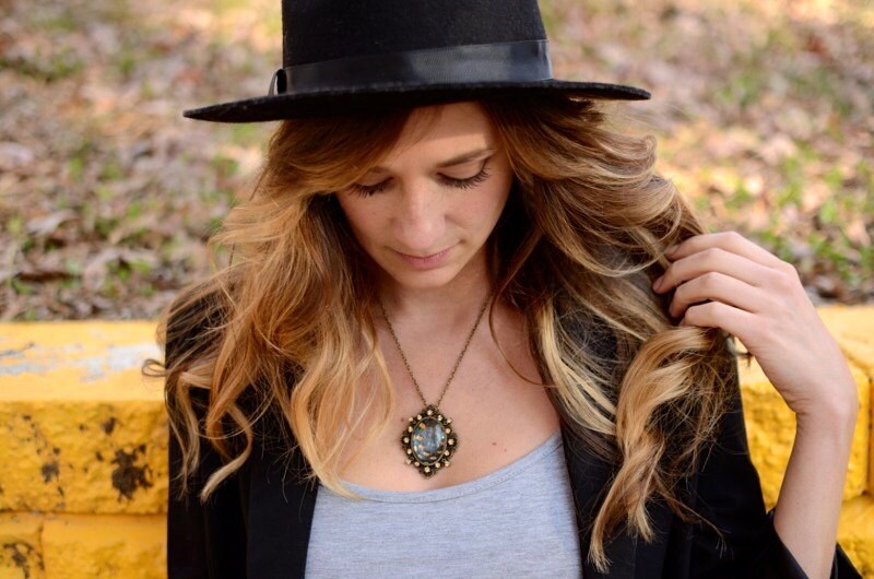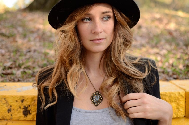 The butterfly wing is set in a vintage style antique gold setting with sparkling champagne colored Swarovski crystals! The pendant measures 1.5 x 1.1". The glass cabochon measures 30x22mm. Your choice of chain length, either 18" to rest on the upper chest (as pictured), or a long 30" chain to hang low.