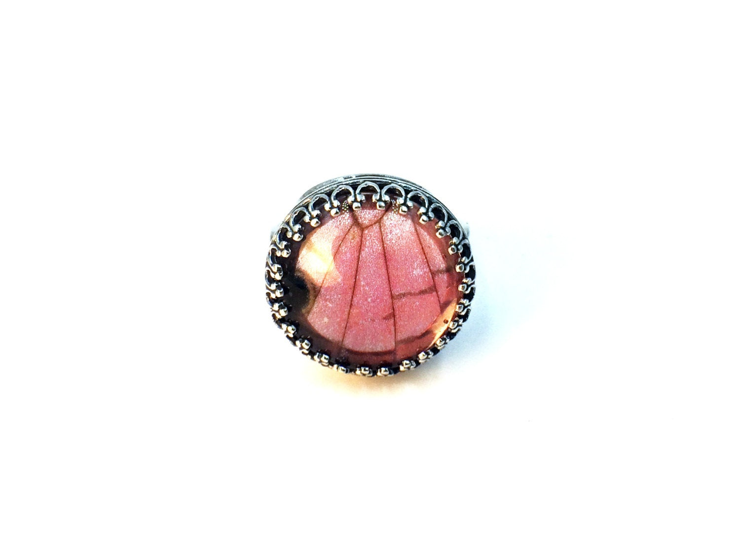 ★ This amazing Sterling Silver and pink ring is handcrafted using a REAL Cithaeria Aurora butterfly wing! (Read below for more info on how I ethically obtain the butterfly wings!) The butterfly wing is expertly embedded under magnified glass measuring roughly 15mm across. These rings are made out of your choice of genuine .925 stamped SOLID Sterling Silver (Not just silver plated!) OR Real 14K Rose Gold filled, and are adjustable to fit sizes 6 - 10.