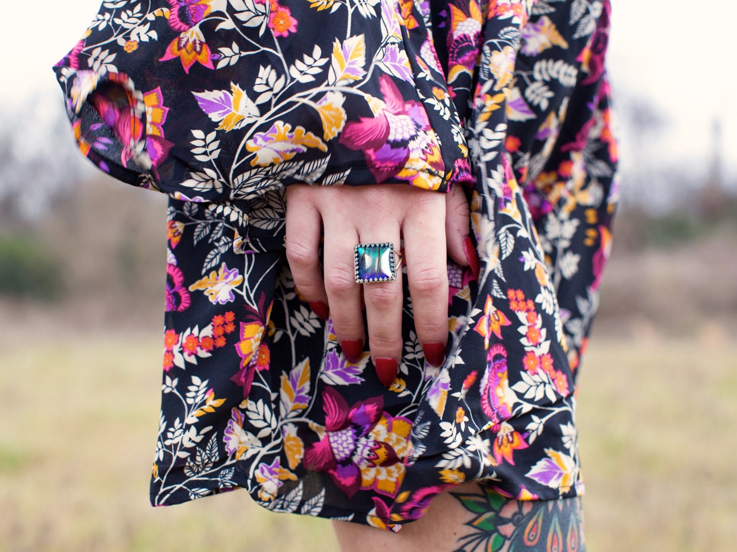 ★ This unique Sterling Silver ring is handcrafted using a REAL Morpho Godarti butterfly wing! (Read below for more info on how I ethically obtain the wings!) The butterfly wing is first sealed so that it is water resistant and then expertly embedded under magnified glass measuring roughly 15mm across. These rings are made out of your choice of genuine .925 stamped SOLID Sterling Silver (Not just silver plated!) 14K Gold Filled, OR Real 14K Rose Gold filled, and are adjustable to fit sizes 6 - 10.