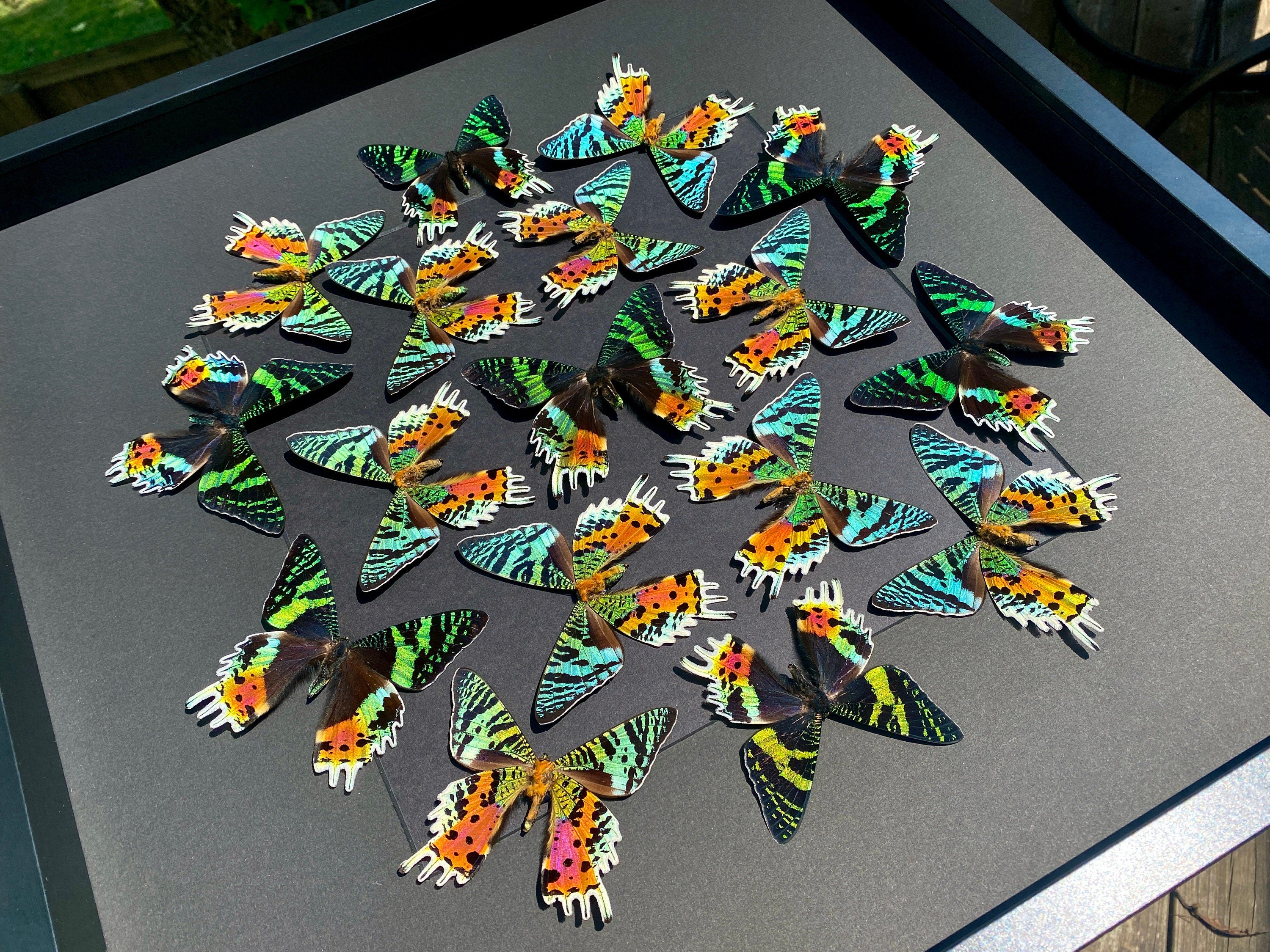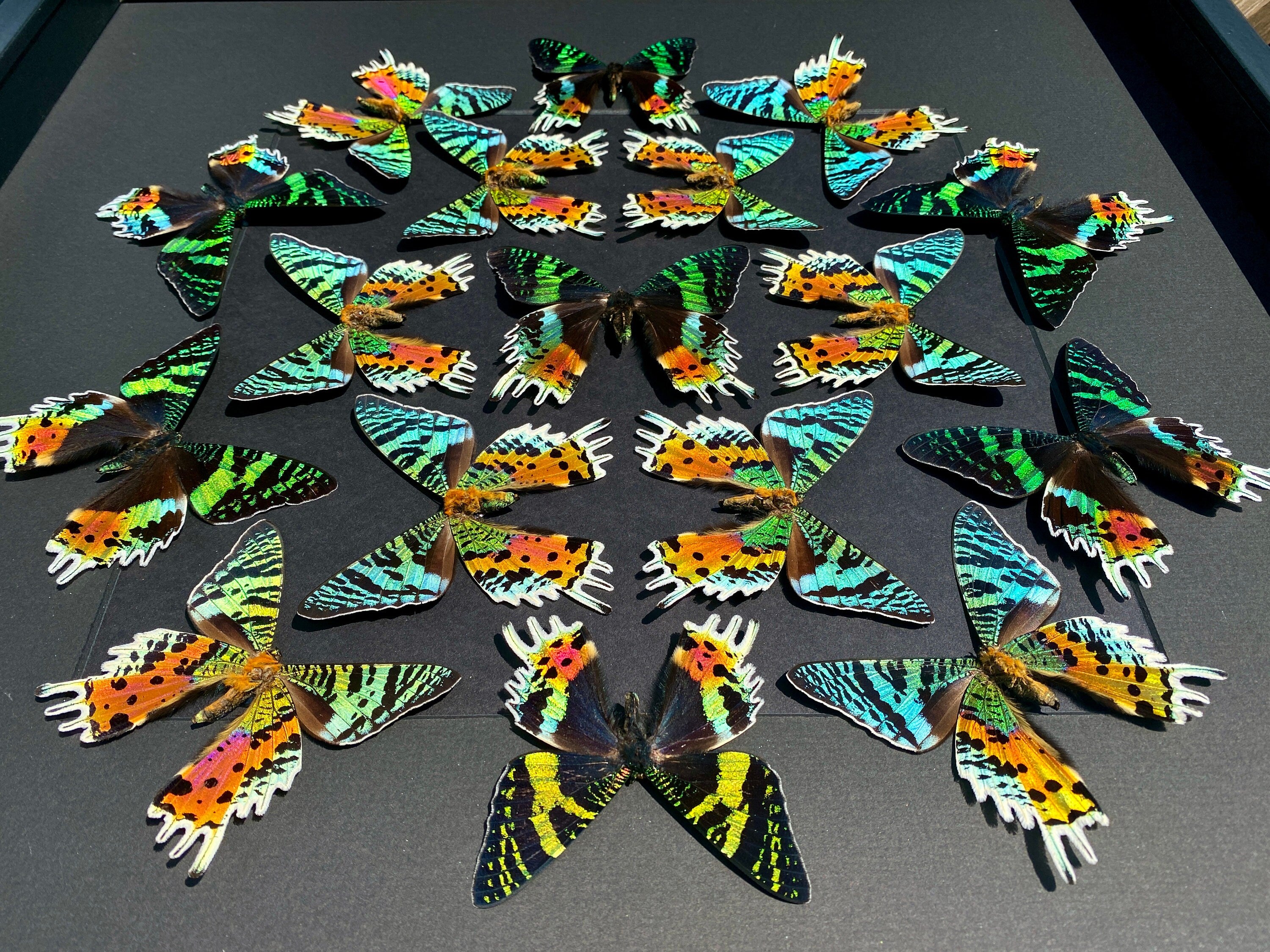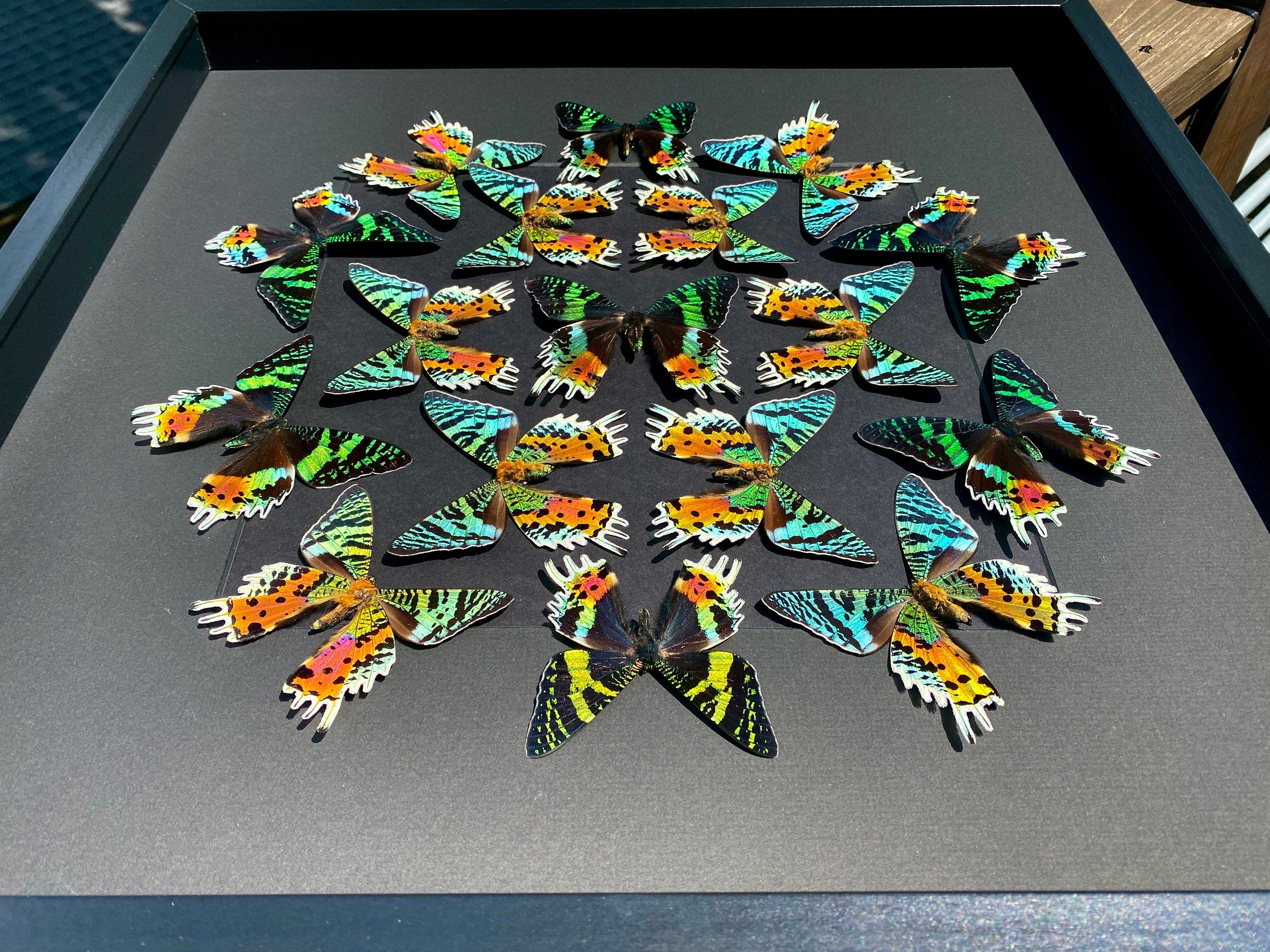 I have created this real insect collage using 17 REAL preserved and mounted Madagascar Sunset moths! I have arranged the moths in a kaleidoscope formation. The insects are secured under glass in a large shadowbox frame measuring almost 2 feet x 2 feet (21" x 21"). The artwork is mounted on a black background with a black mat border and black frame to best show off the rainbow colored moths! You may choose between regular glass or an upgrade to museum grade UV protectant glass.