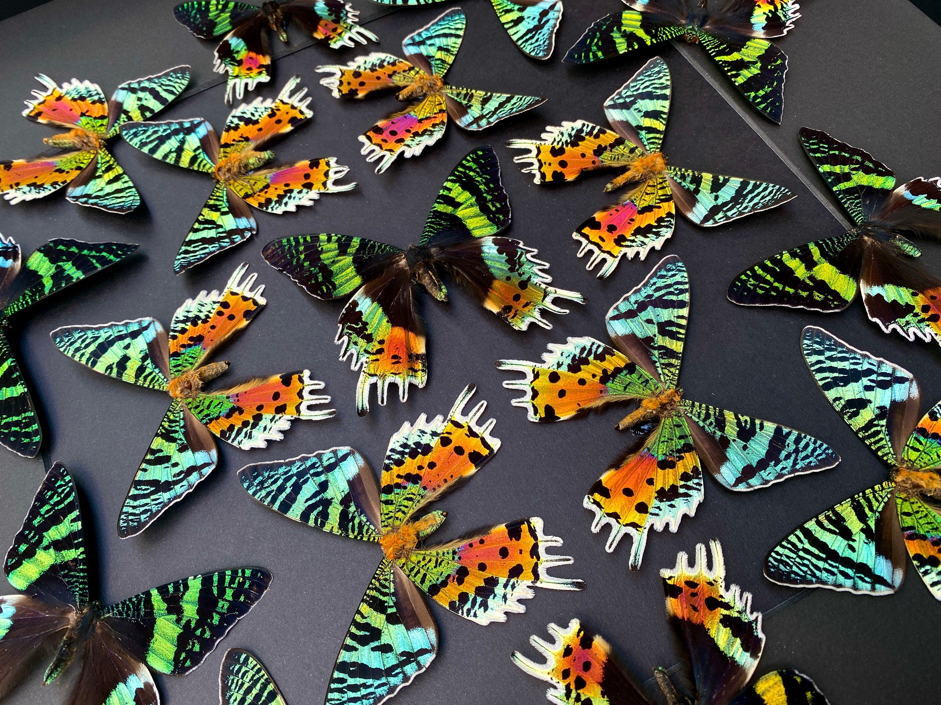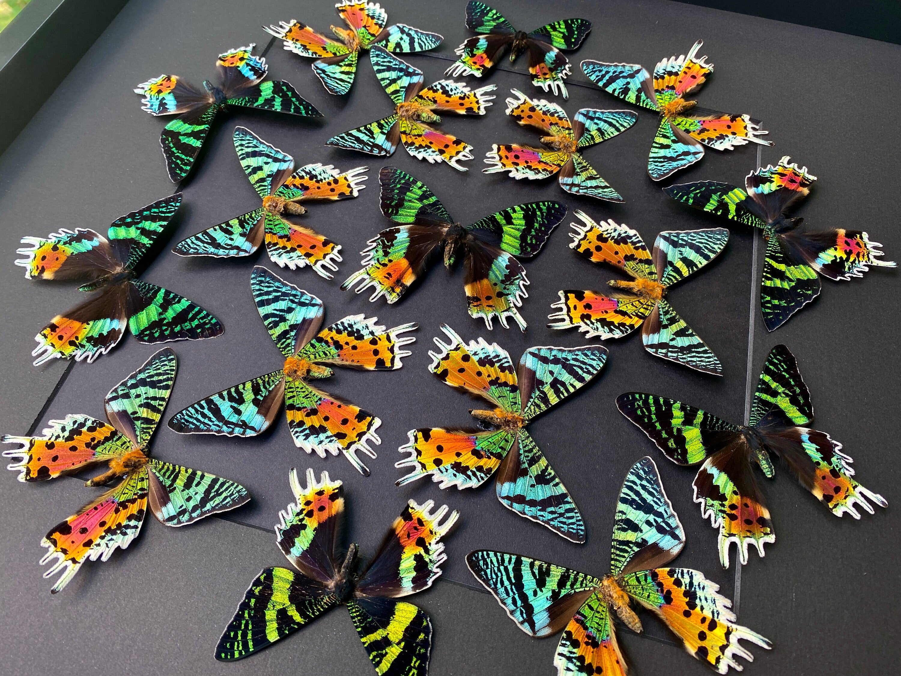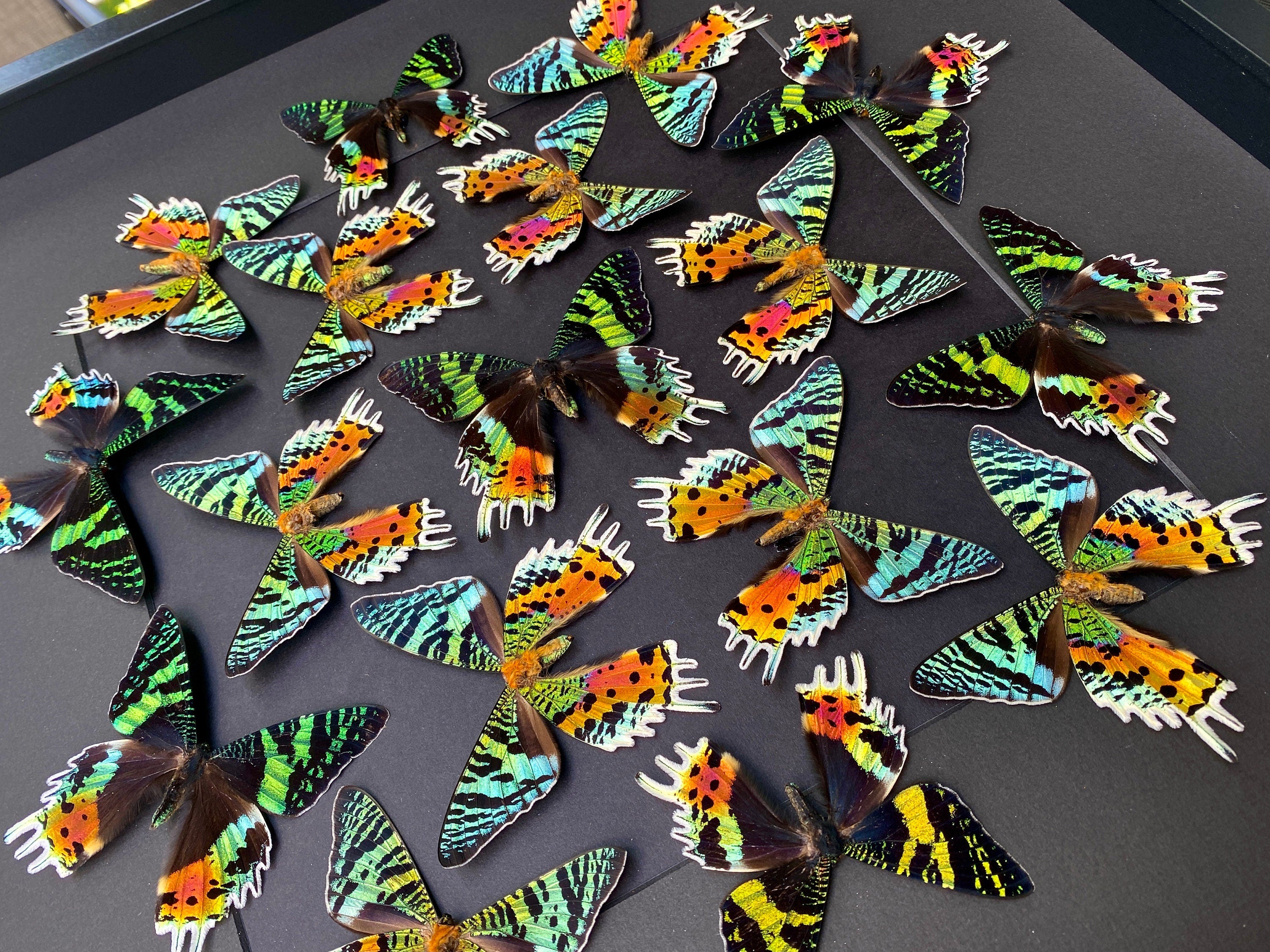 I have created this real insect collage using 17 REAL preserved and mounted Madagascar Sunset moths! I have arranged the moths in a kaleidoscope formation. The insects are secured under glass in a large shadowbox frame measuring almost 2 feet x 2 feet (21" x 21"). The artwork is mounted on a black background with a black mat border and black frame to best show off the rainbow colored moths! You may choose between regular glass or an upgrade to museum grade UV protectant glass.