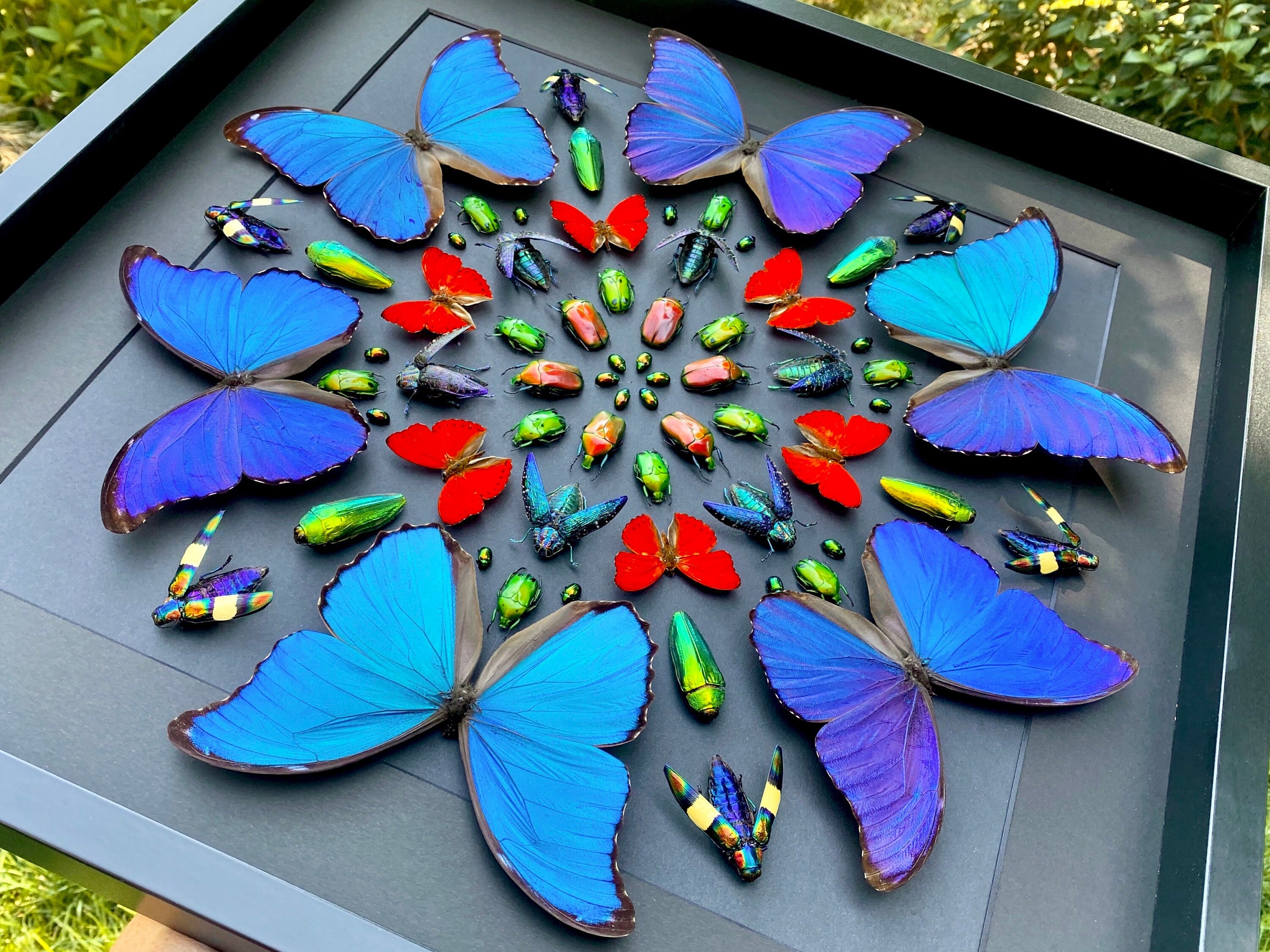 I have created this stunning insect mandala collage using 66 REAL preserved exotic insects! The insects include 6 real Blue Morpho Butterflies (Morpho Alexandrovna), Scarlet Nymph butterflies (Cymothoe Sangaris), Metallic blue wood boring beetles (Polybothris Sumptuosa Gema), red flower scarab beetles (Torynorrhina flammea), Fiery green flower beetles (Heterorrhina sexmaculata), Green jewel beetles, tiny Dogbane beetles (Chrysochus auratus) and Red speckled jewel beetles (Chrysochroa Buqueti Rigocollis) or Rainbow Jewel beetles (Chrysochroa Fulgens). I have arranged the insects in a circular kaleidoscope / mandala formation. The insects are secured under glass in a large shadowbox frame measuring almost 2 feet x 2 feet (21" x 21"). The artwork is mounted on a black background with a black mat border and a black frame. You may choose between regular glass or an upgrade to museum grade UV protectant glass.