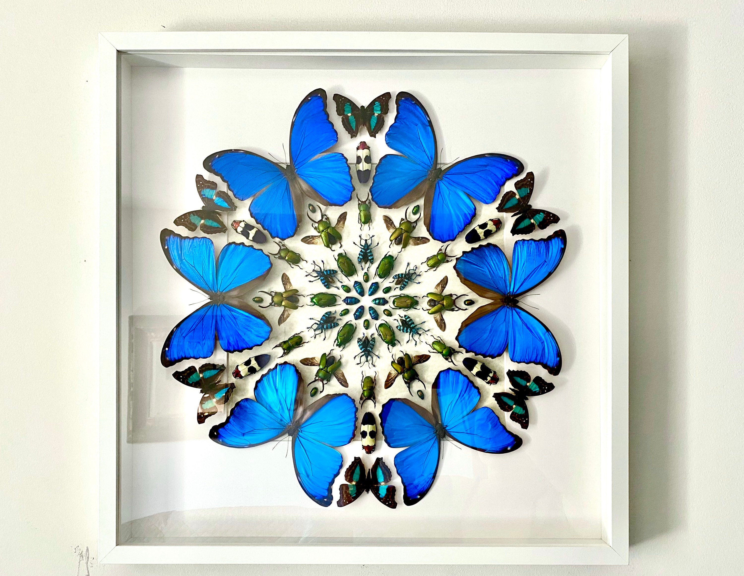 I have created this stunning insect mandala collage using 60 REAL preserved exotic insects! The insects include Blue Morpho Alexandrovna butterflies, Doxocopa Cherubina butterflies, Chrysochroa Buqueti Rigocollis beetles, Green Lamprima Stag beetles, green flower scarab beetles, blue weevil beetles, and assorted small jewel beetles. I have arranged the insects in a circular kaleidoscope formation. The insects are secured under glass in a large shadowbox frame measuring almost 2 feet x 2 feet (21" x 21"). The artwork is mounted on a textured cream background with your choice of a black or white frame. You may also choose between regular glass or an upgrade to museum grade UV protectant glass.