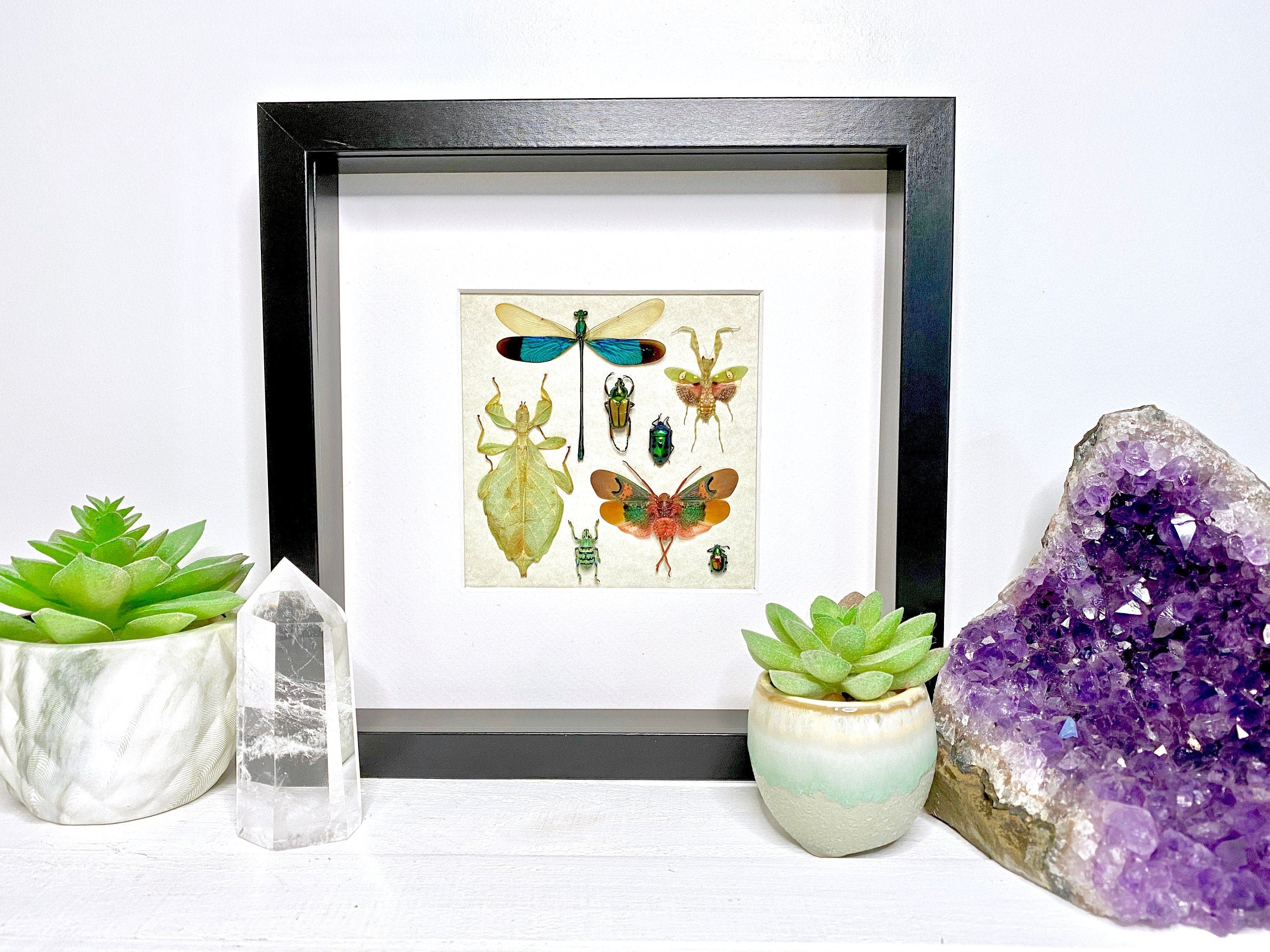 I have curated this enchanting real insect collection featuring 8 REAL exotic insects preserved inside a wooden shadowbox! This collection is made up of some of the most amazing green and pink insect specimens in the world! The insects include a praying mantis, a leaf bug, a green damselfly, a lantern bug, a green cuvieri weevil beetle, and several smaller jewel toned beetles. The insects are secured under glass in a shadowbox measuring approximately 1 ft x 1ft. The artwork is mounted on a textured cream background with a white mat border. You may choose a black or white frame. You may also choose between regular glass or an upgrade to museum grade UV glass.