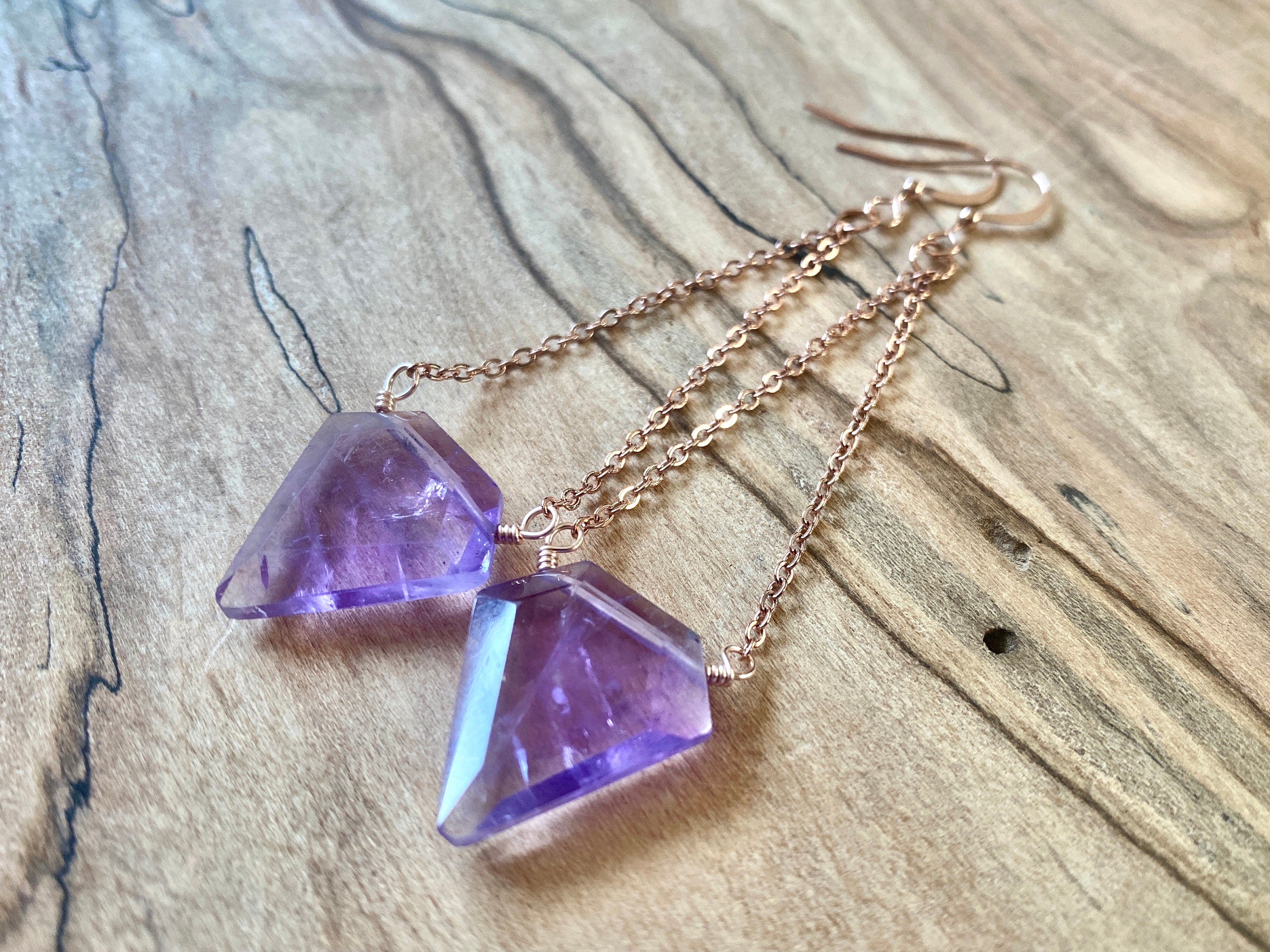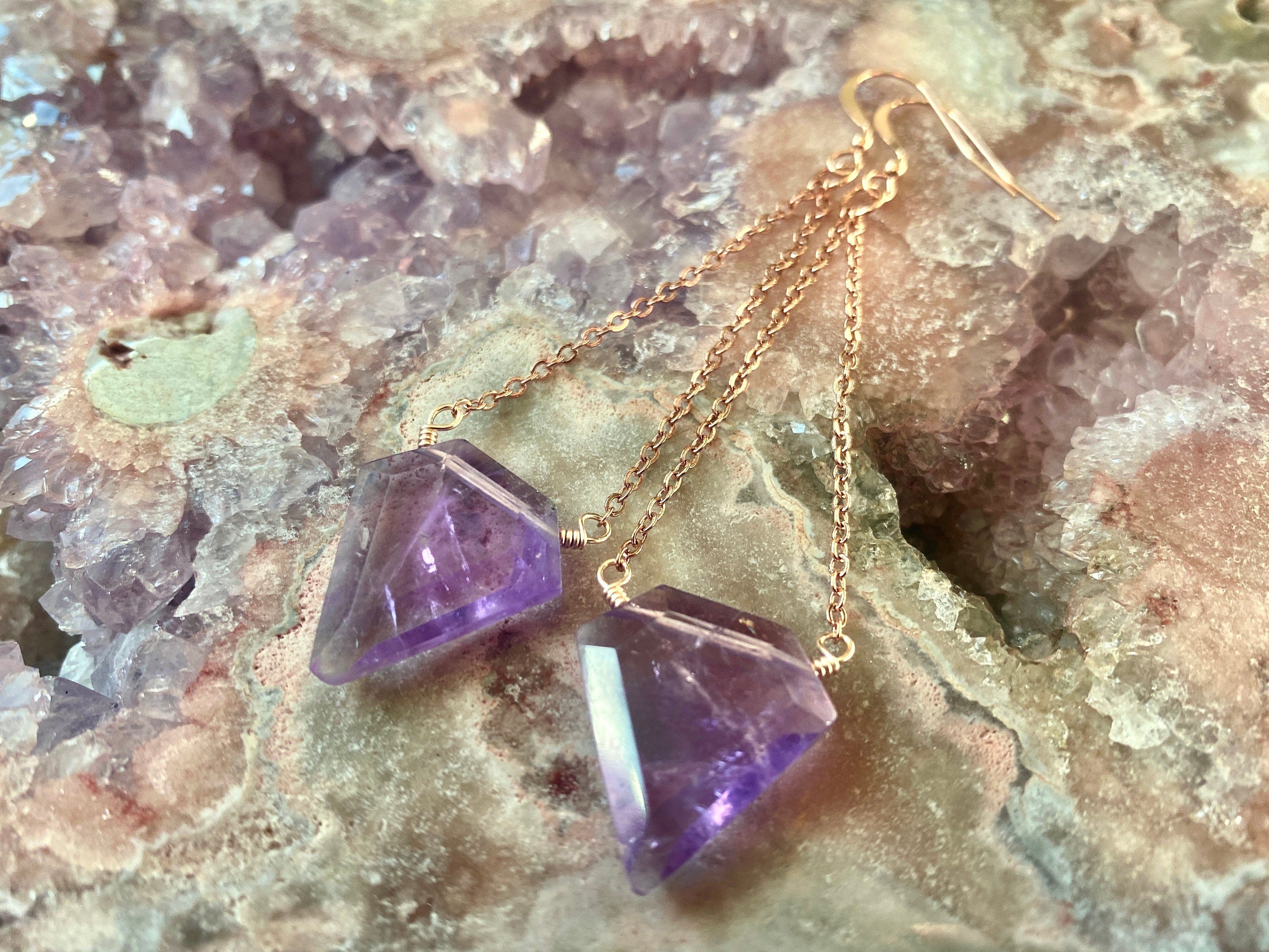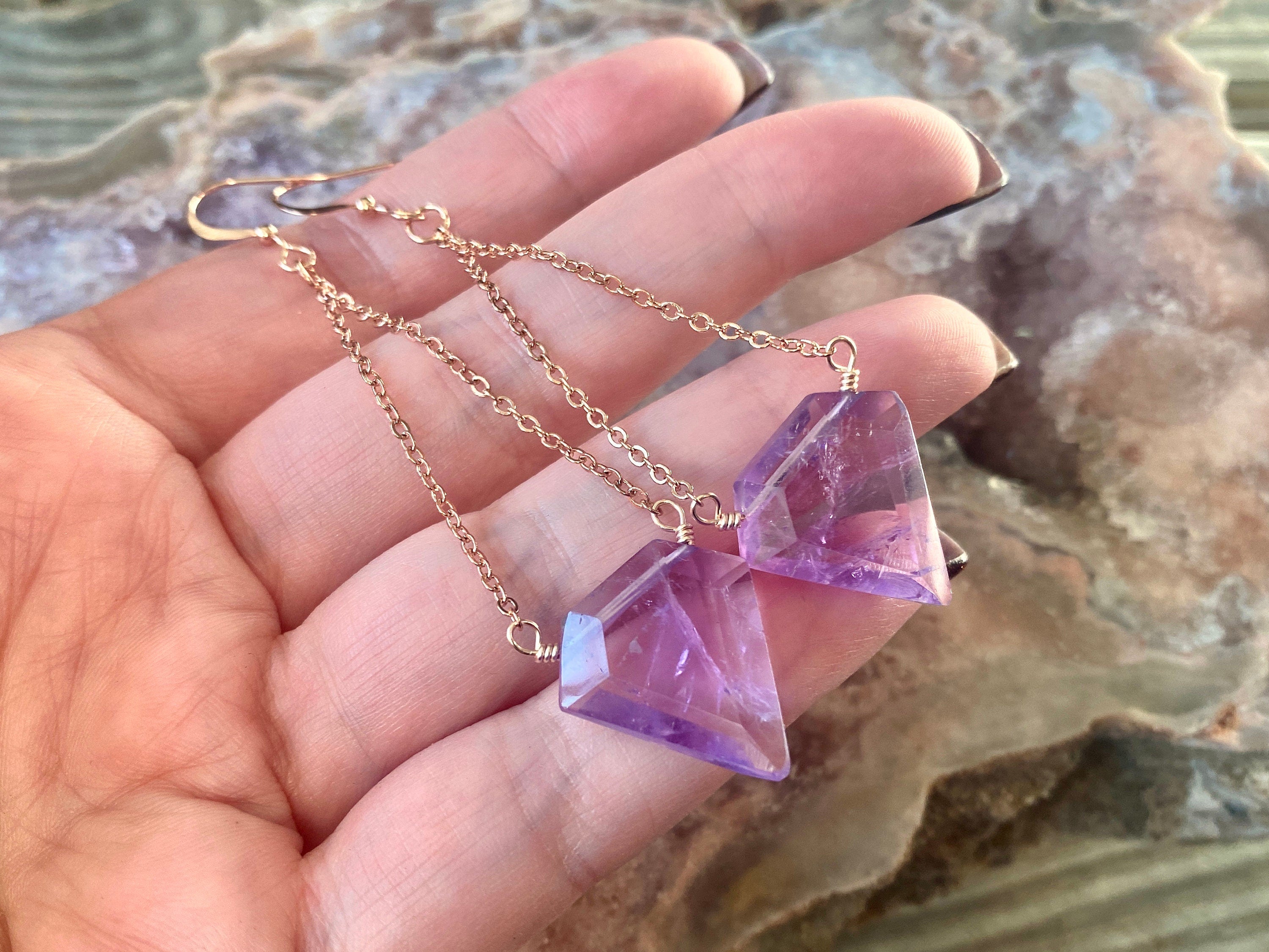 ★ Dazzling real gemstone earrings in your choice of smoky quartz, labradorite, amethyst, moonstone, or fluorite and wire wrapped by hand! Each stone is suspended from chains in your choice of silver, gold, or rose gold plated chain which connect to your choice of real sterling silver, 14k gold filled, or 14k rose gold filled French earring hooks. All earring hook options are hypoallergenic and great for sensitive ears! Each long earring measures approximately 2.5" long. They come in a custom gift pouch, ready to gift or keep!